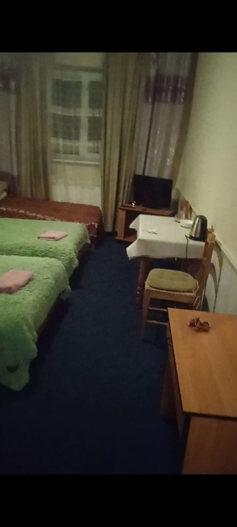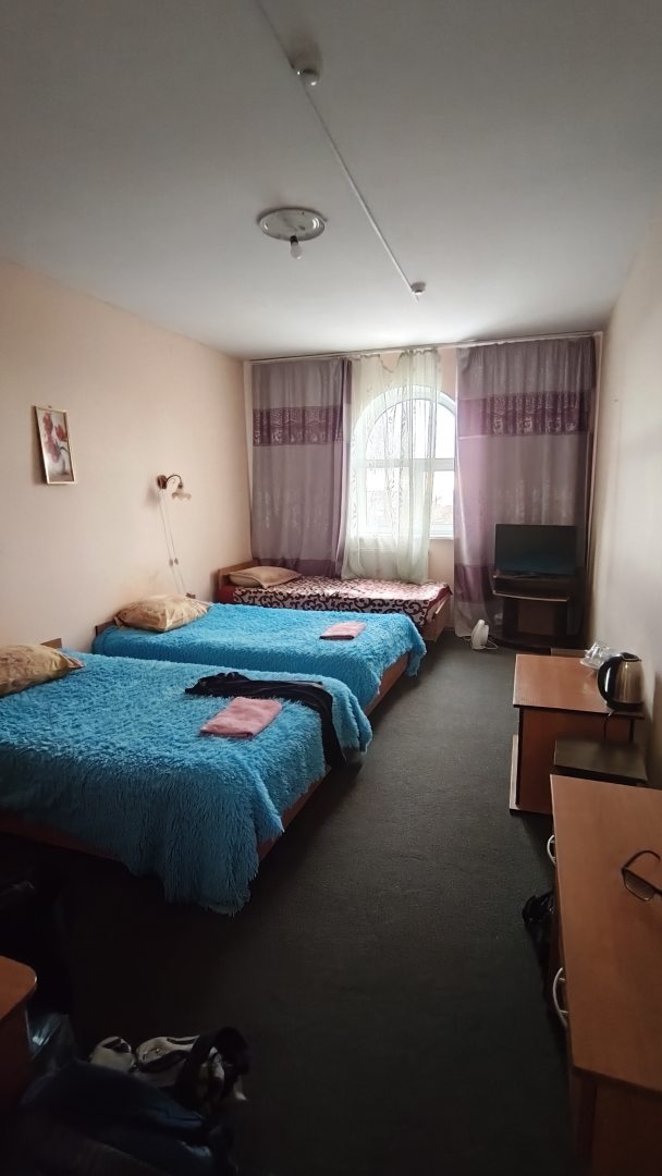 Уютный, чистый номер, удобные кровати. Есть всё для проживания. Большой плюс это душ и туалет в номере) Чайник, телевизор, шкаф, зеркало всё есть Что ещё надо для счастья)