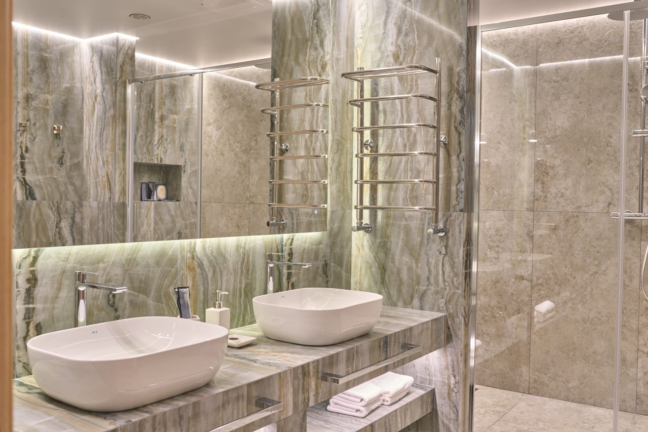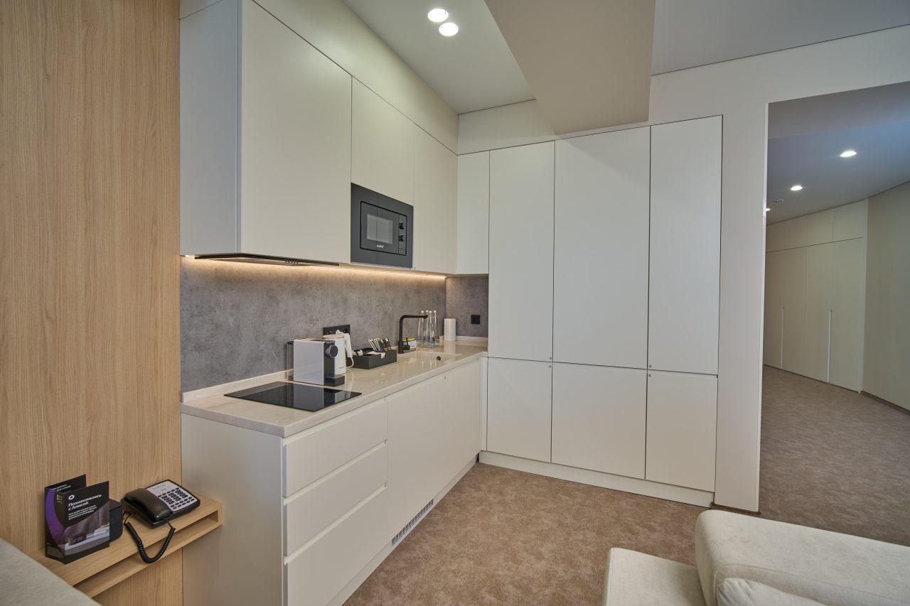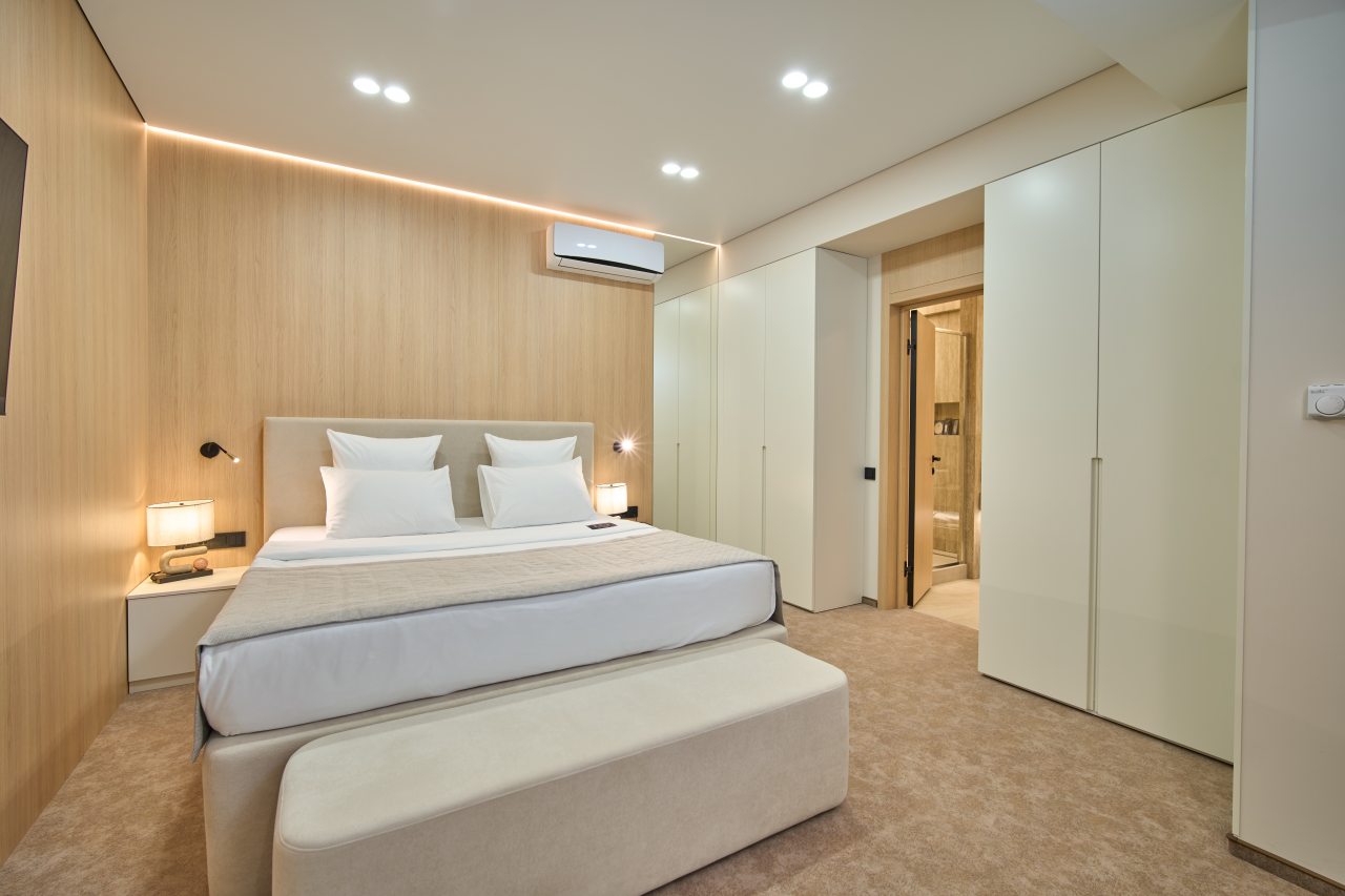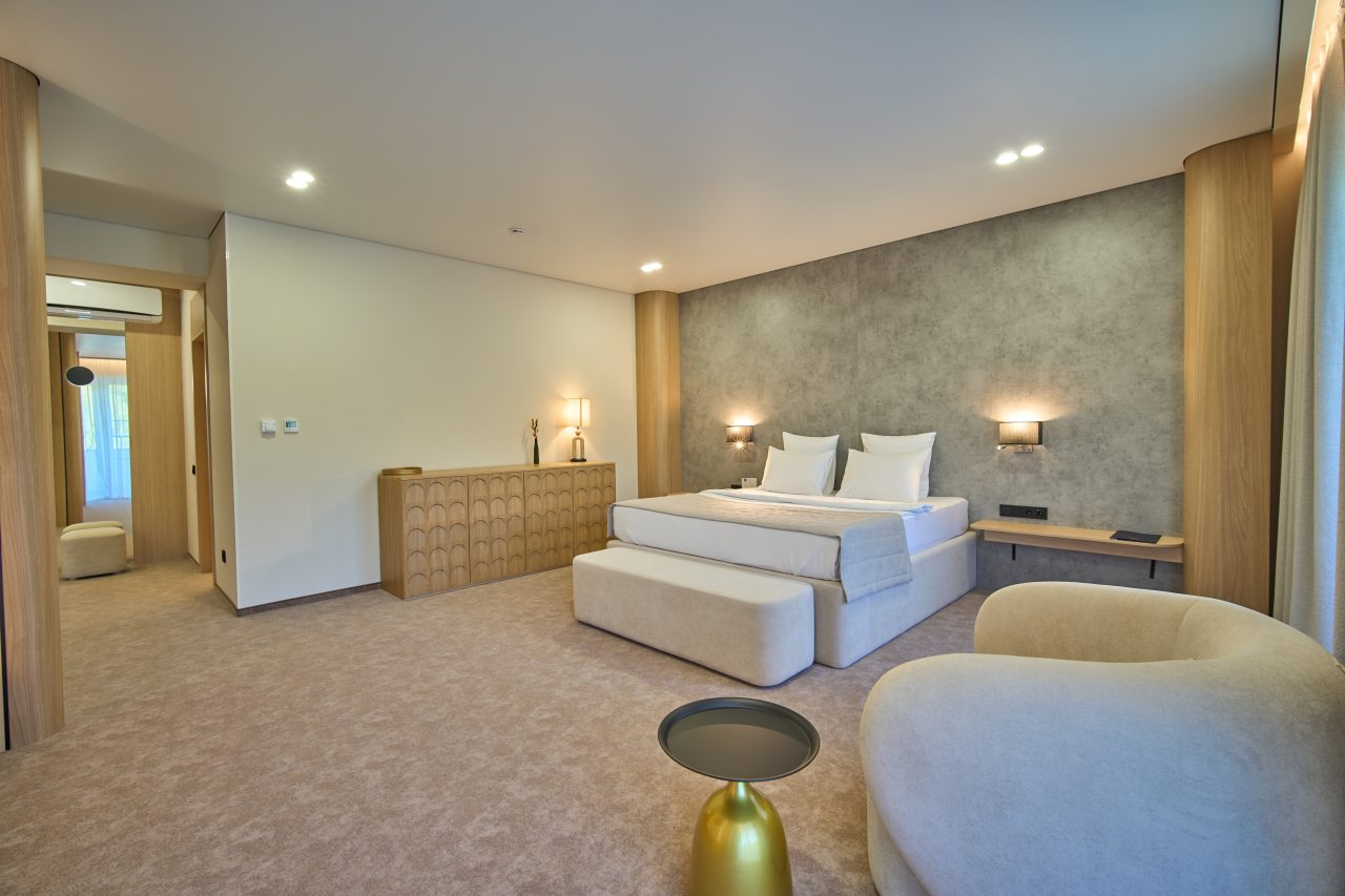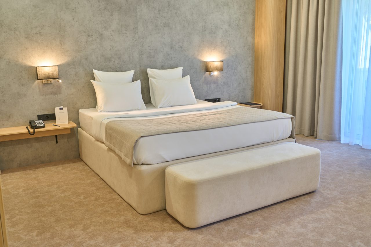 Для выбора доступны номера различной вместимости и комплектации, поэтому каждый гость сможет найти подходящий вариант. Каждый номер оснащен качественной мебелью и техникой, включая удобную кровать, различные световые сценарии, шкаф, ЖК-телевизор, а также санузел, укомплектованный набором чистых полотенец и туалетно-косметическими принадлежностями.
