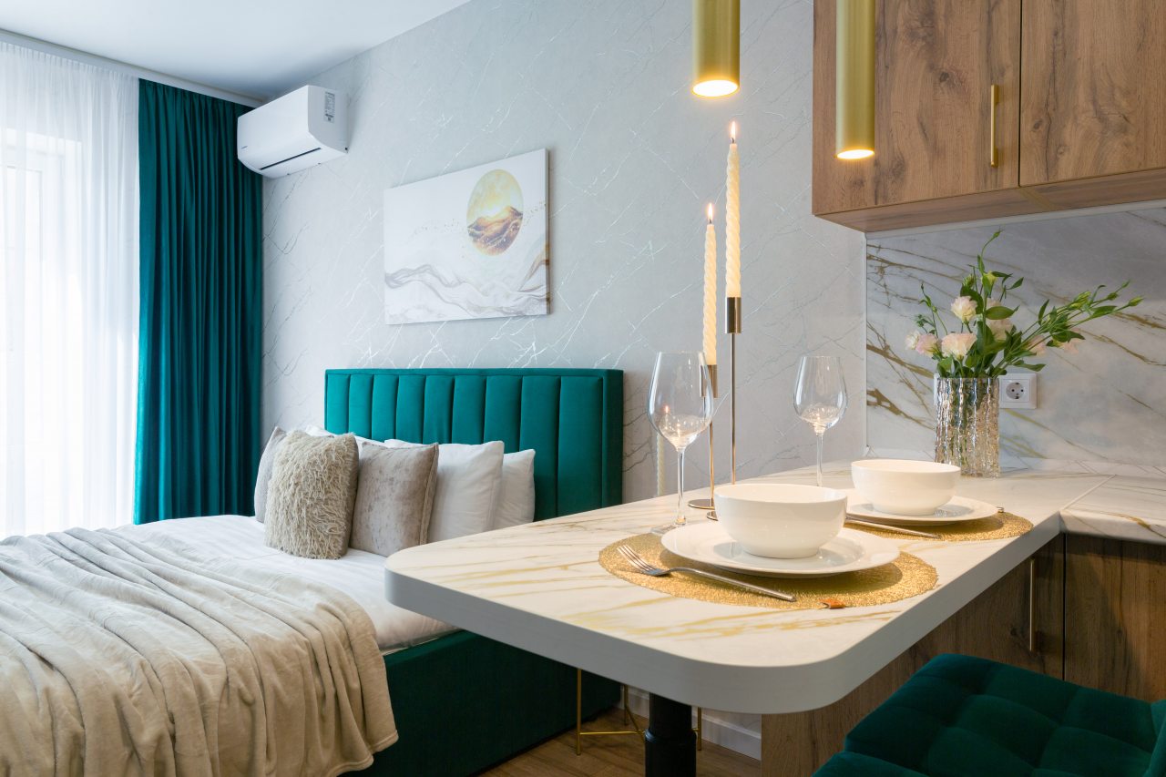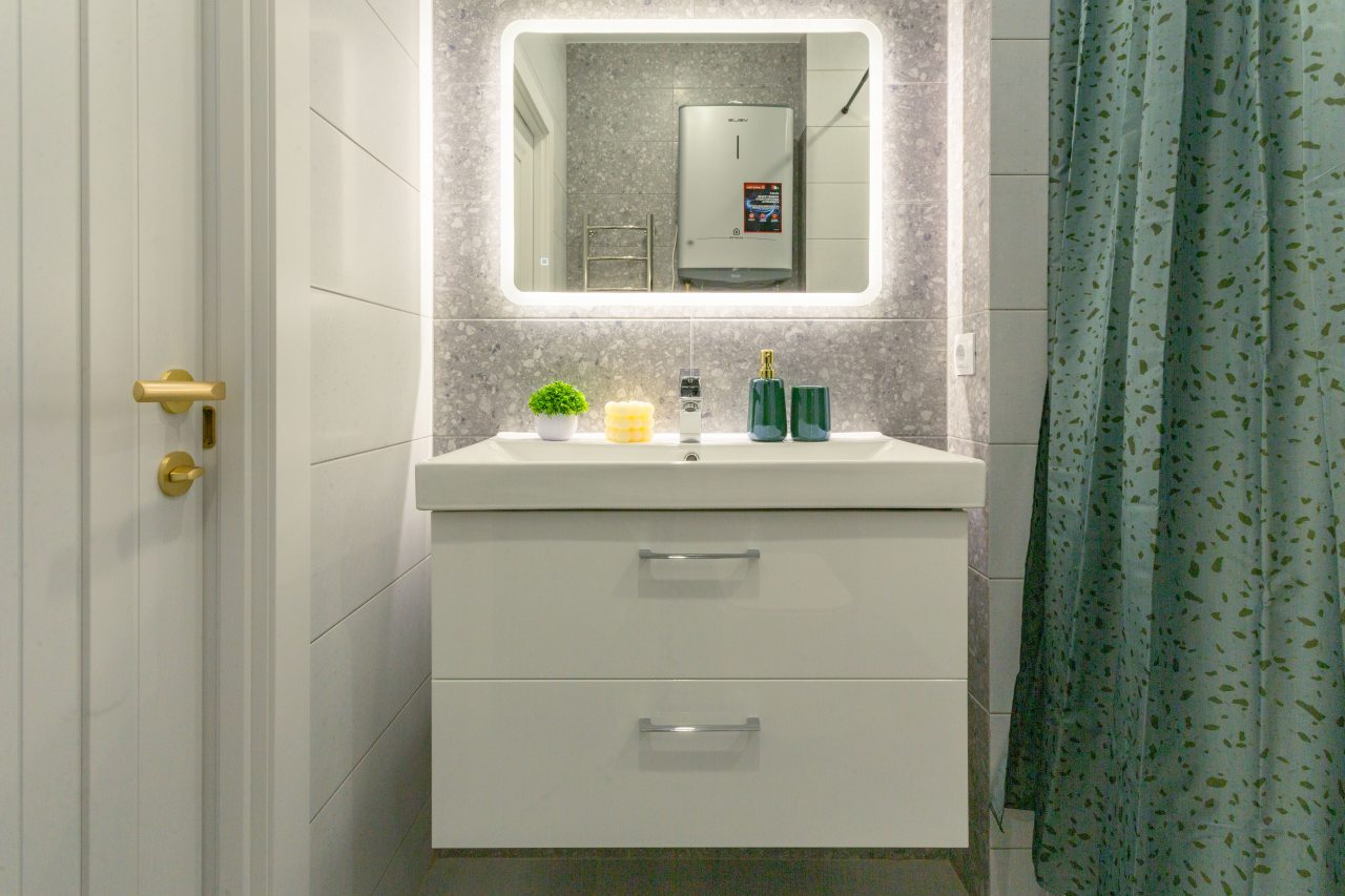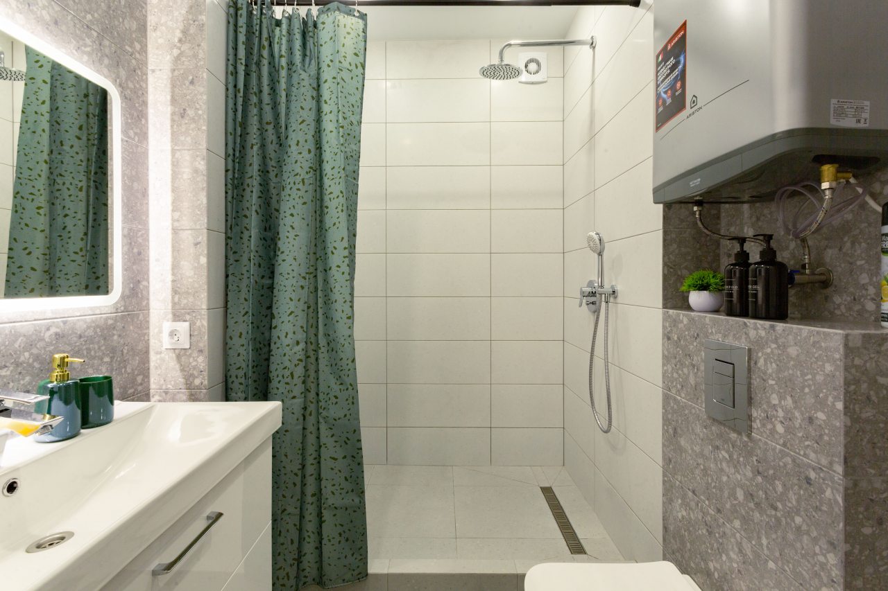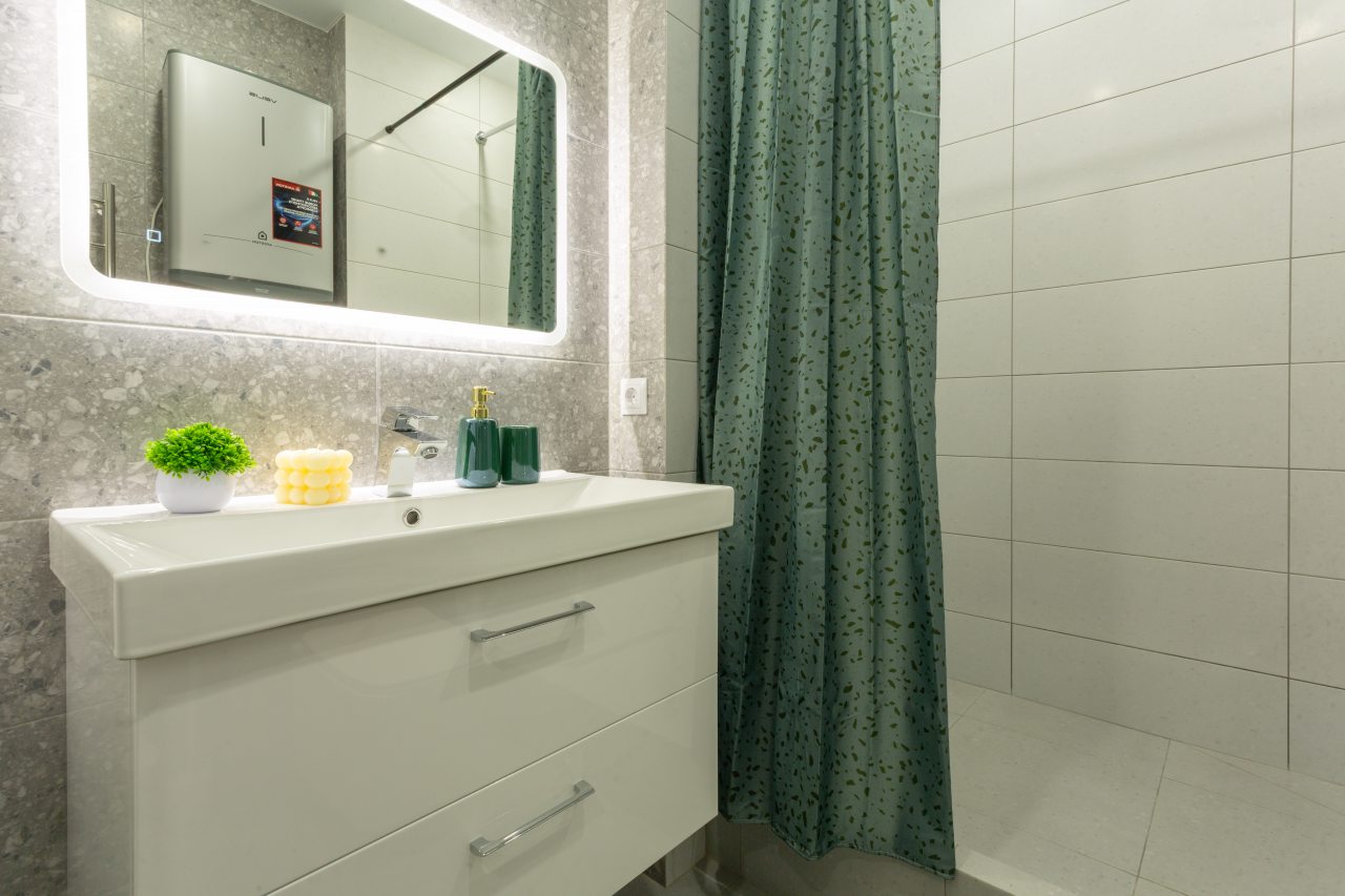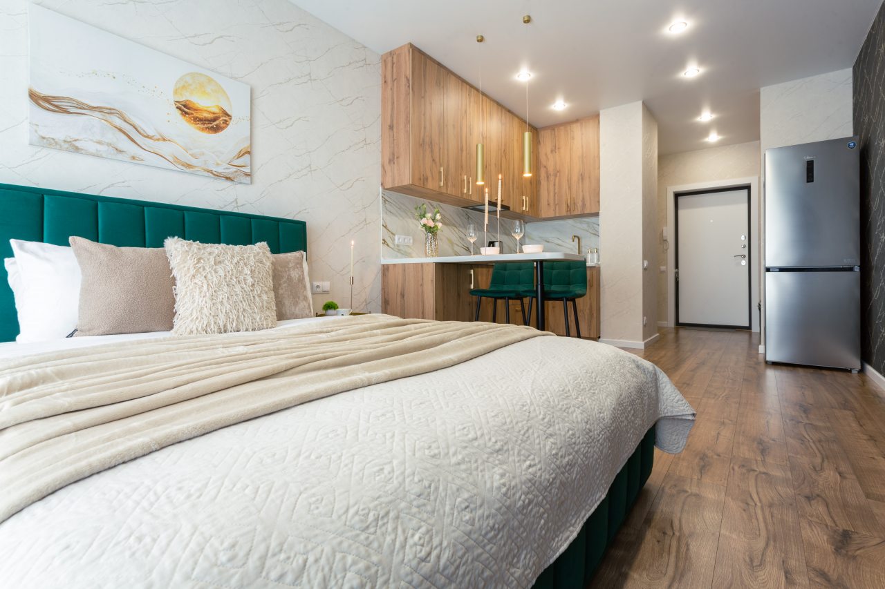 Апартаменты с современным ремонтом оснащены комфортабельной двуспальной кроватью с чистым постельным бельем, кондиционером, розетками возле кровати, затемненными шторами, кухонной зоной, полками для хранения личных вещей и собственной ванной комнатой. Доступна точка высокоскоростного интернета, ЖК-телевизор с цифровым телевидением и Яндекс.Станция. Санузел укомплектован качественной сантехникой и средствами личной гигиены.