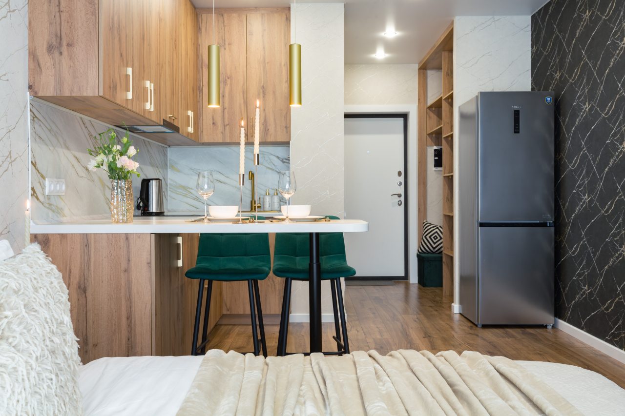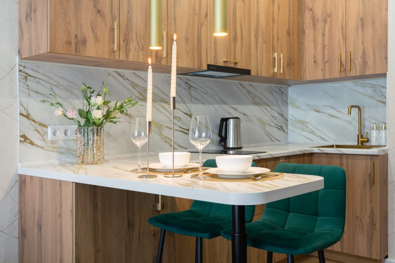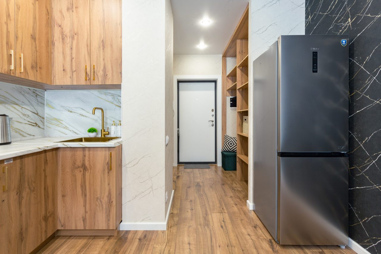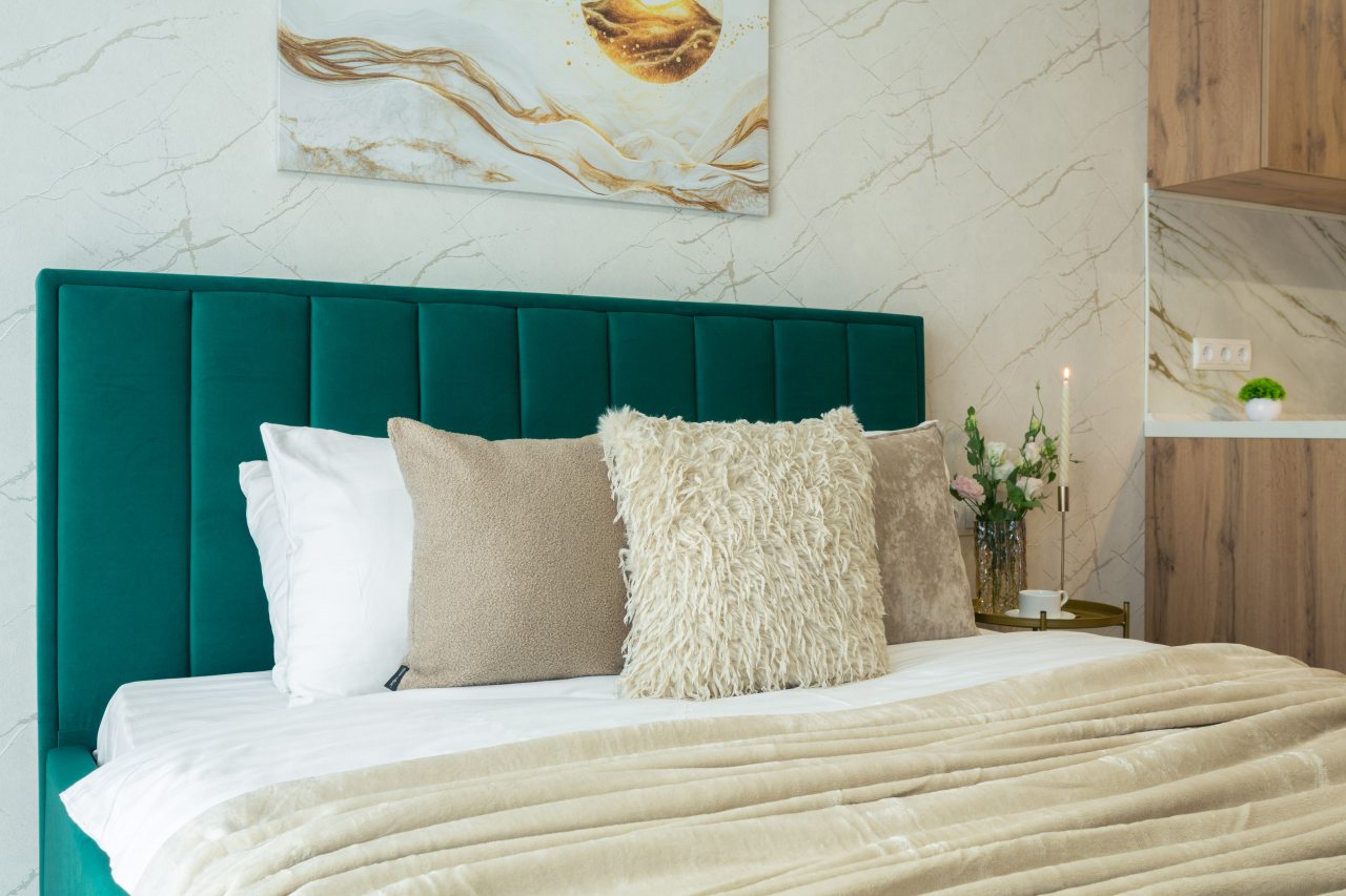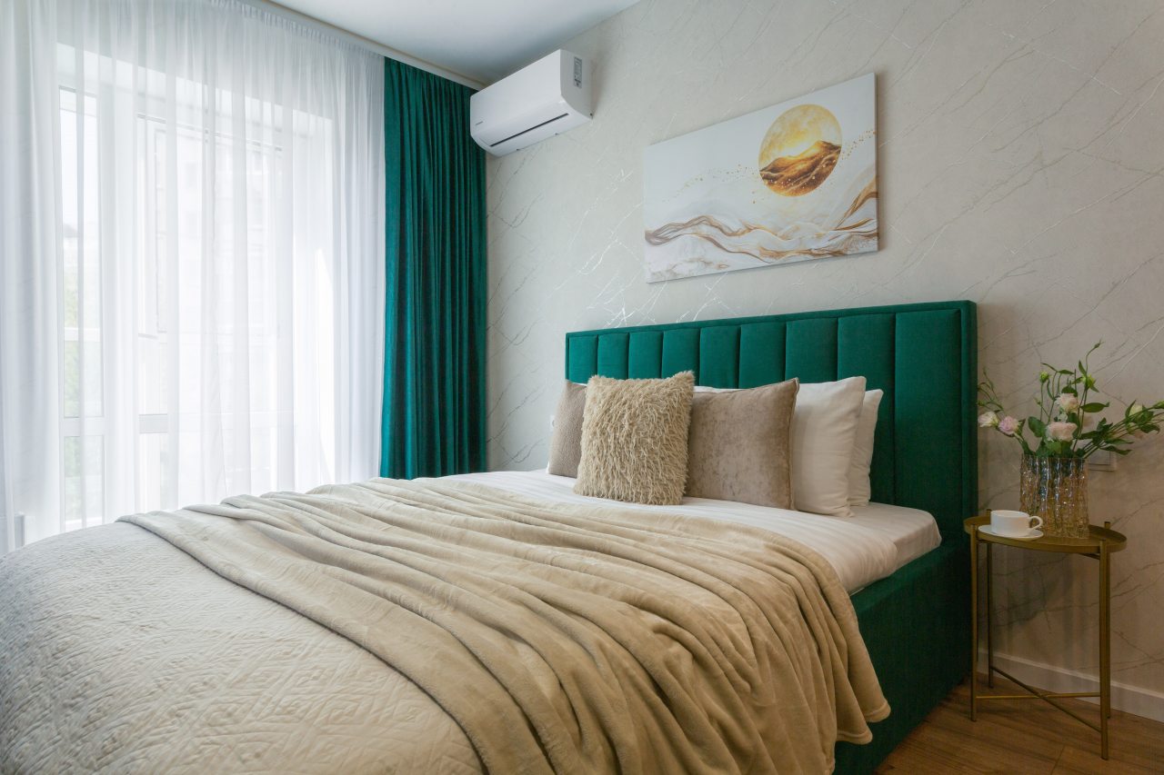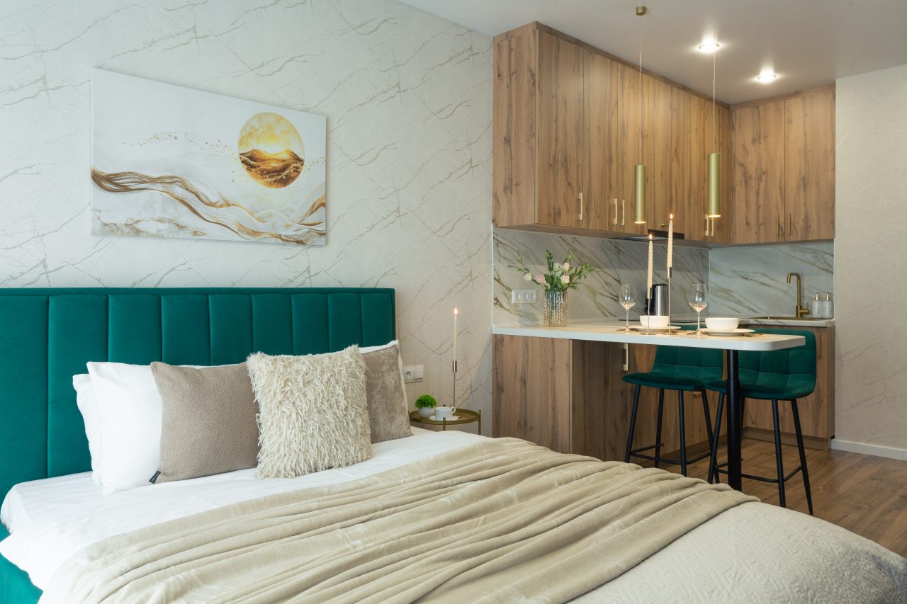 Апартаменты с современным ремонтом оснащены комфортабельной двуспальной кроватью с чистым постельным бельем, кондиционером, розетками возле кровати, затемненными шторами, кухонной зоной, полками для хранения личных вещей и собственной ванной комнатой. Доступна точка высокоскоростного интернета, ЖК-телевизор с цифровым телевидением и Яндекс.Станция. Санузел укомплектован качественной сантехникой и средствами личной гигиены.