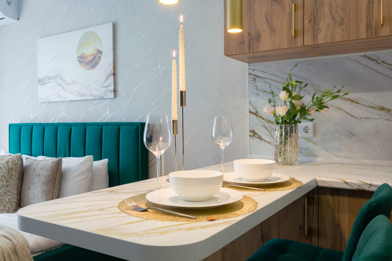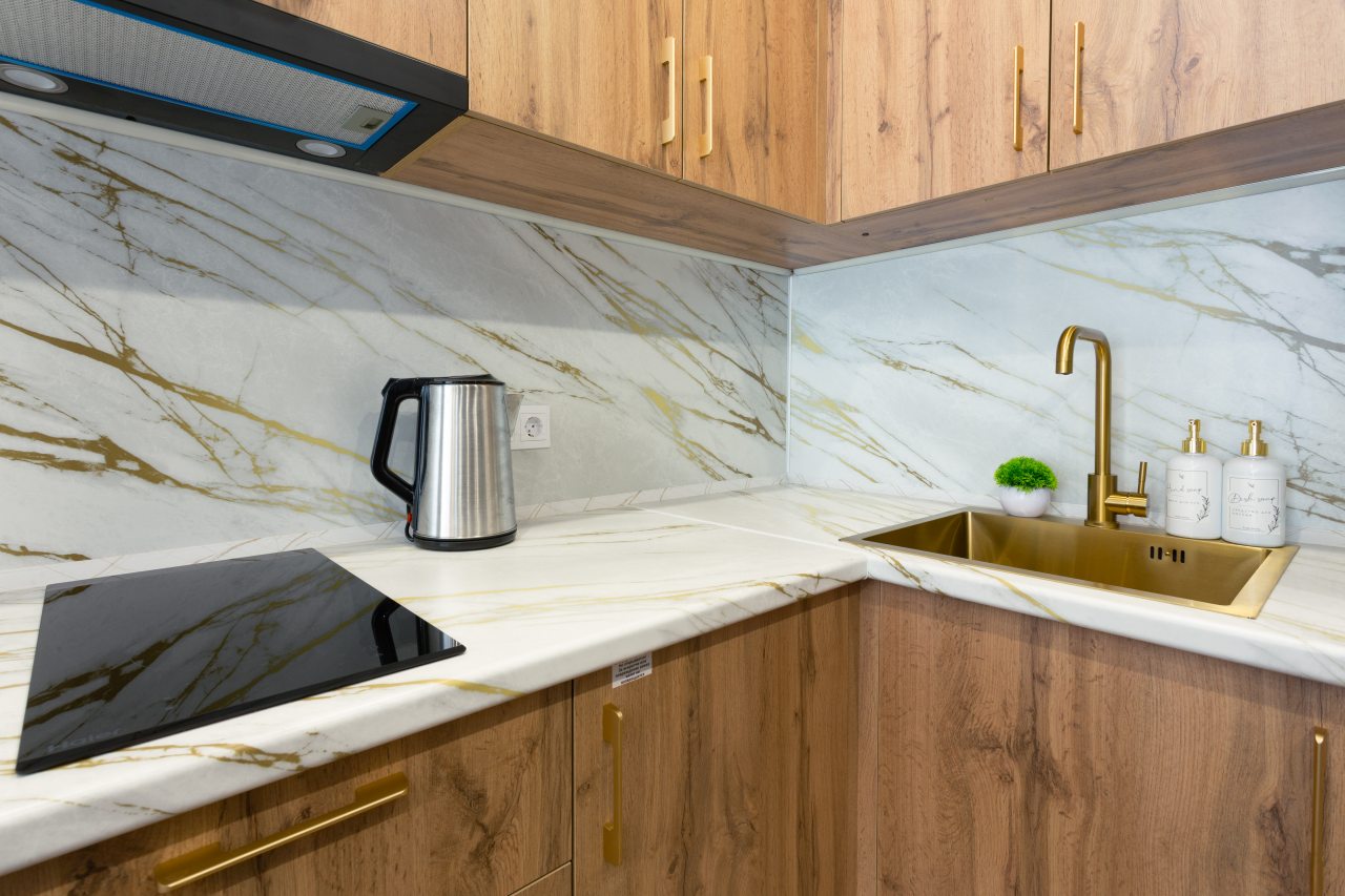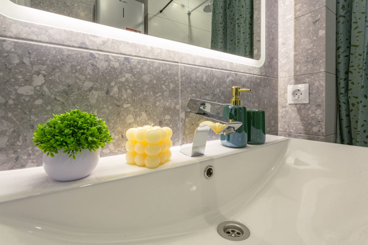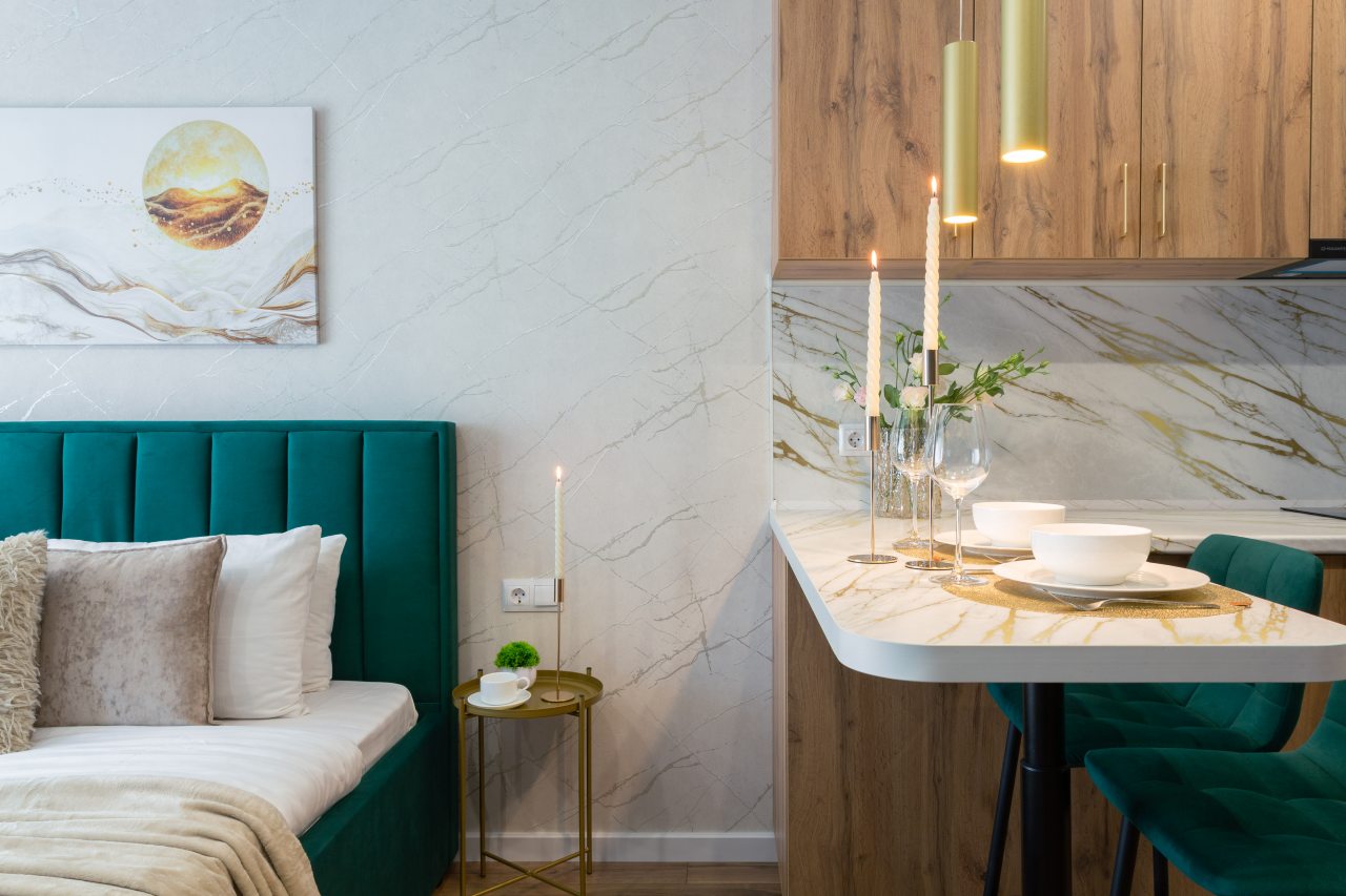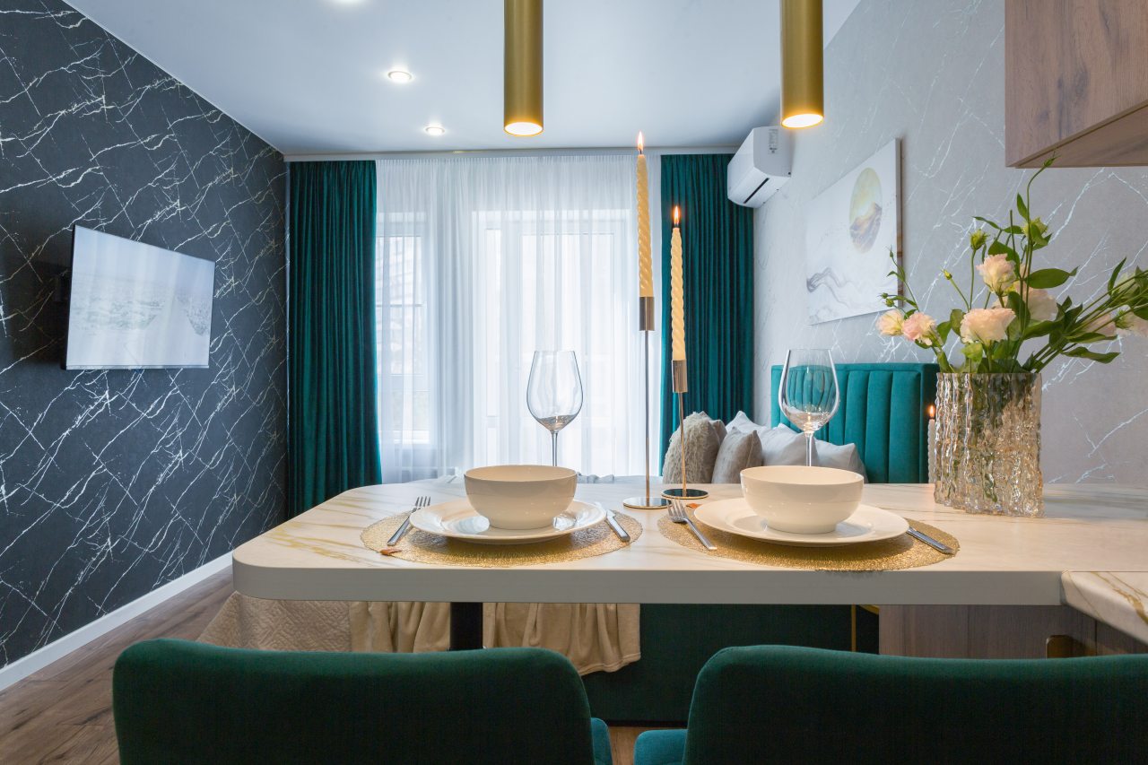 Апартаменты с современным ремонтом оснащены комфортабельной двуспальной кроватью с чистым постельным бельем, кондиционером, розетками возле кровати, затемненными шторами, кухонной зоной, полками для хранения личных вещей и собственной ванной комнатой. Доступна точка высокоскоростного интернета, ЖК-телевизор с цифровым телевидением и Яндекс.Станция. Санузел укомплектован качественной сантехникой и средствами личной гигиены.