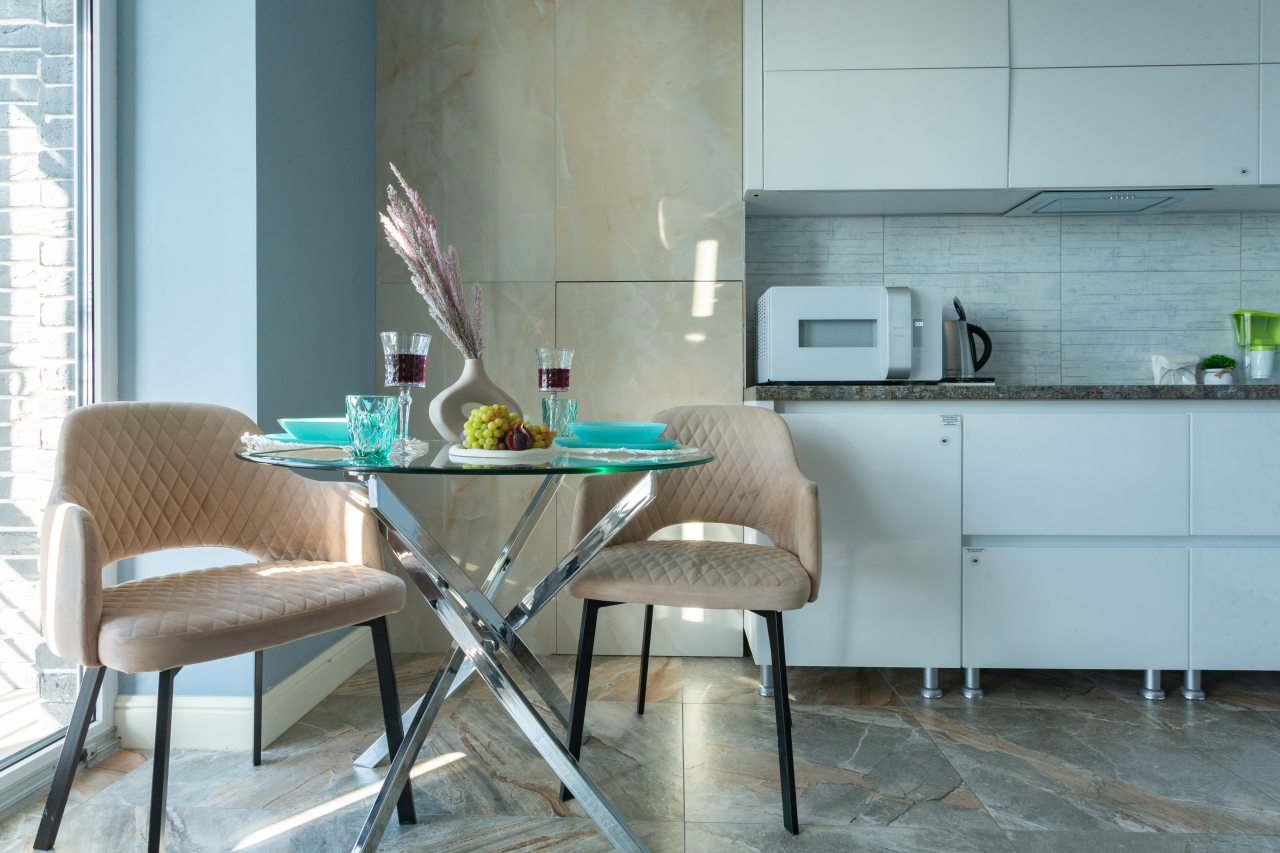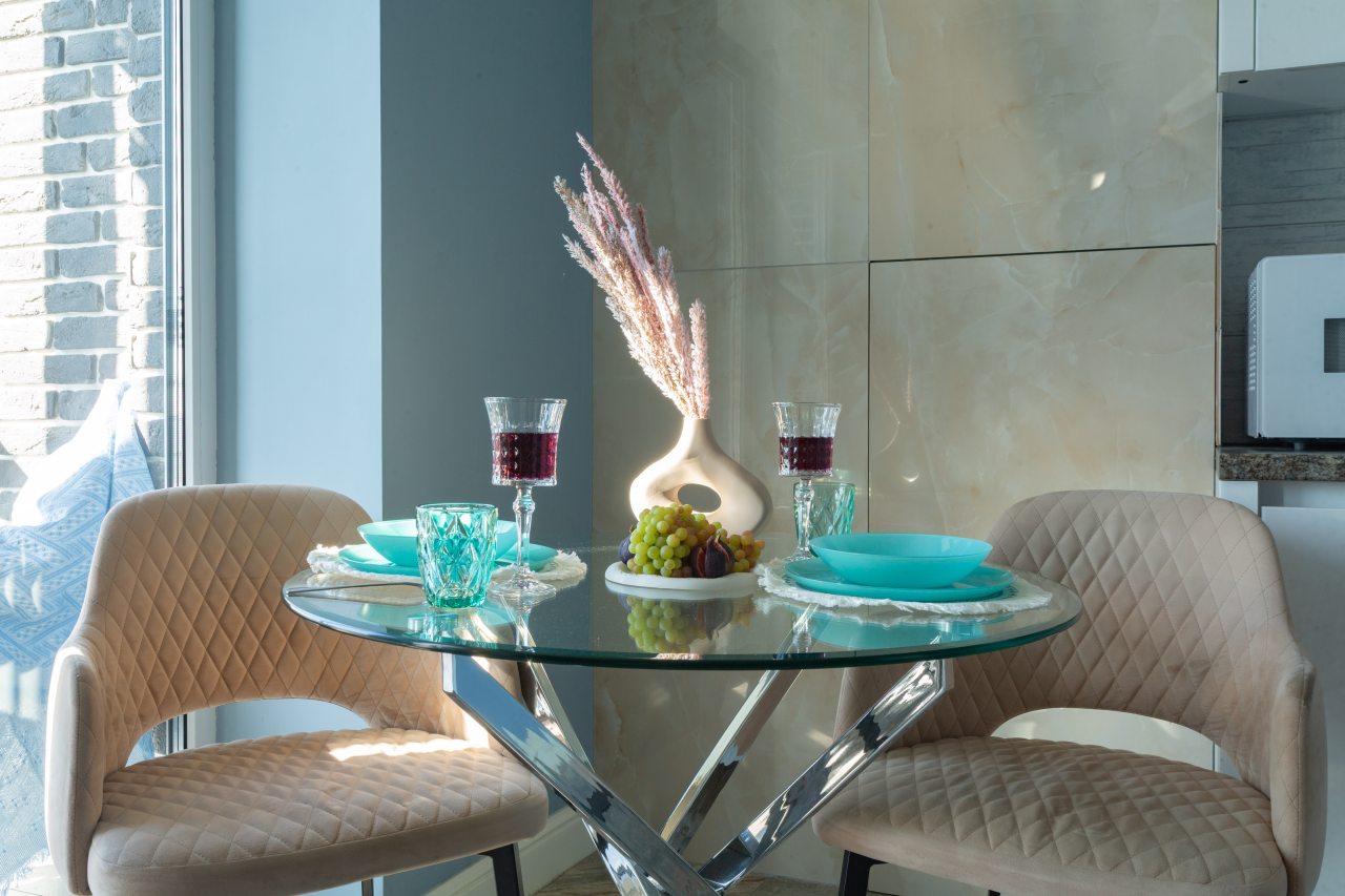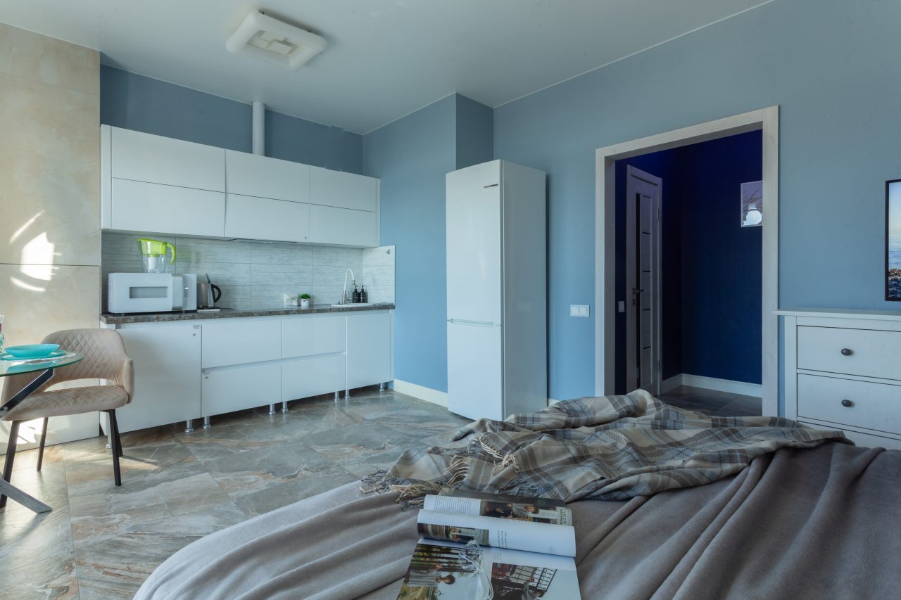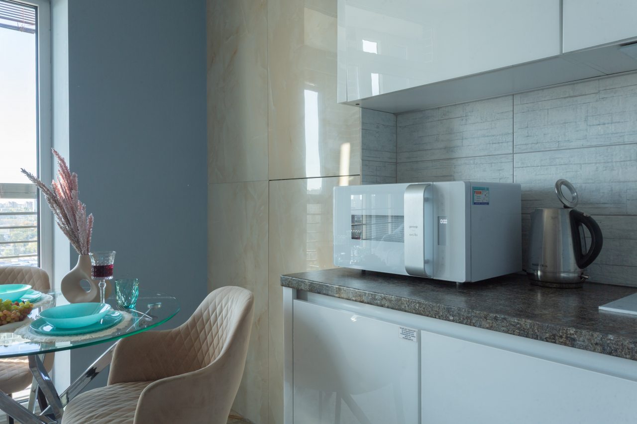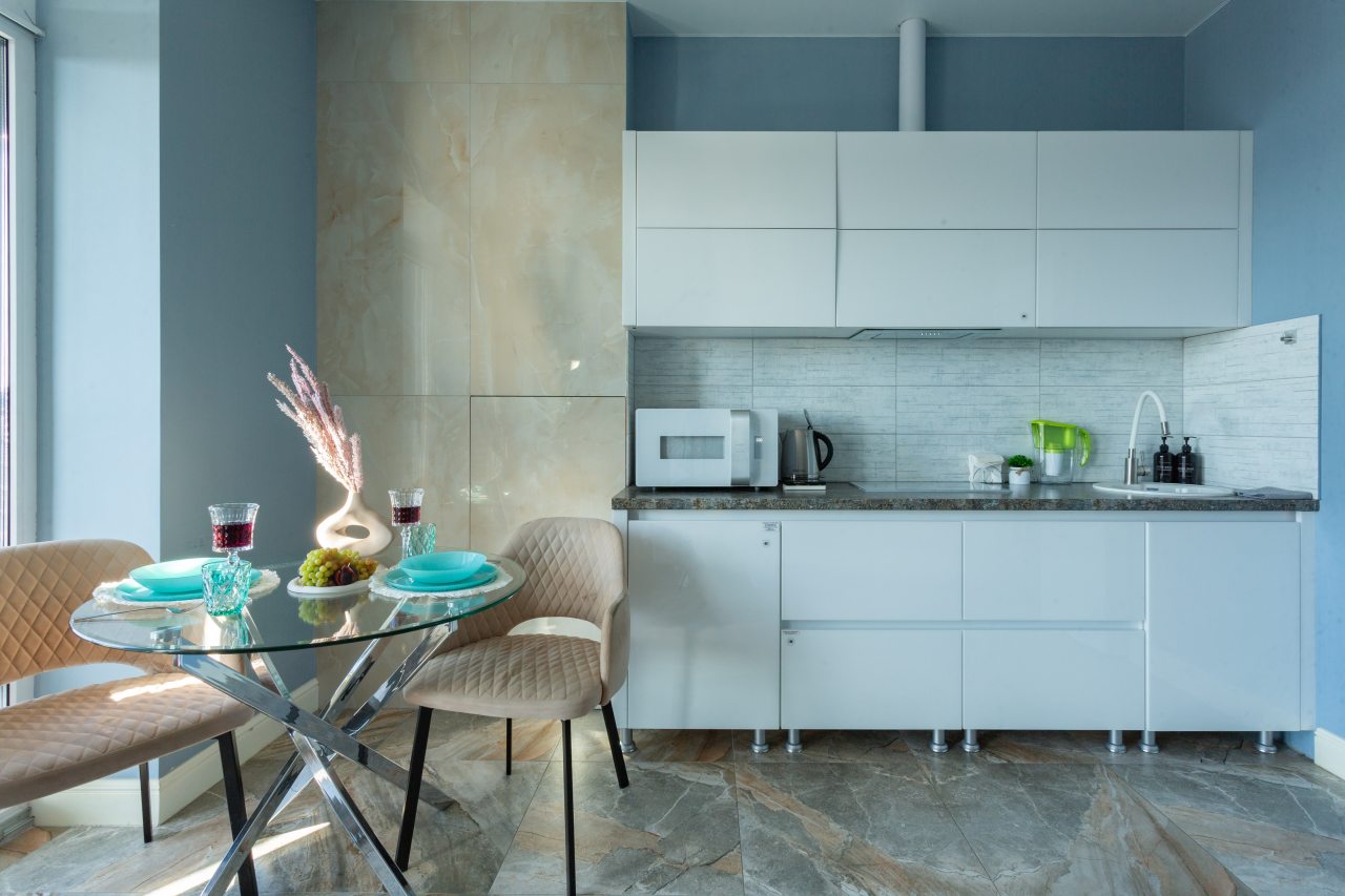 Кухонная зона включает в себя варочную панель с вытяжкой, фильтр для воды, чайник, СВЧ, посуду, красивую обеденную зону. Таким образом, вы всегда сможете порадовать себя домашними блюдами и напитками.