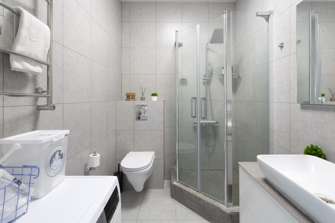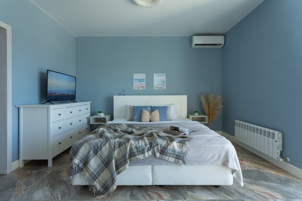 Внутри имеется удобная двуспальная кровать, комод с телевизором, кондиционер, уютная лоджия с панорамным видом на город, санузел с раковиной, душевой, туалетом и стиральной машиной.