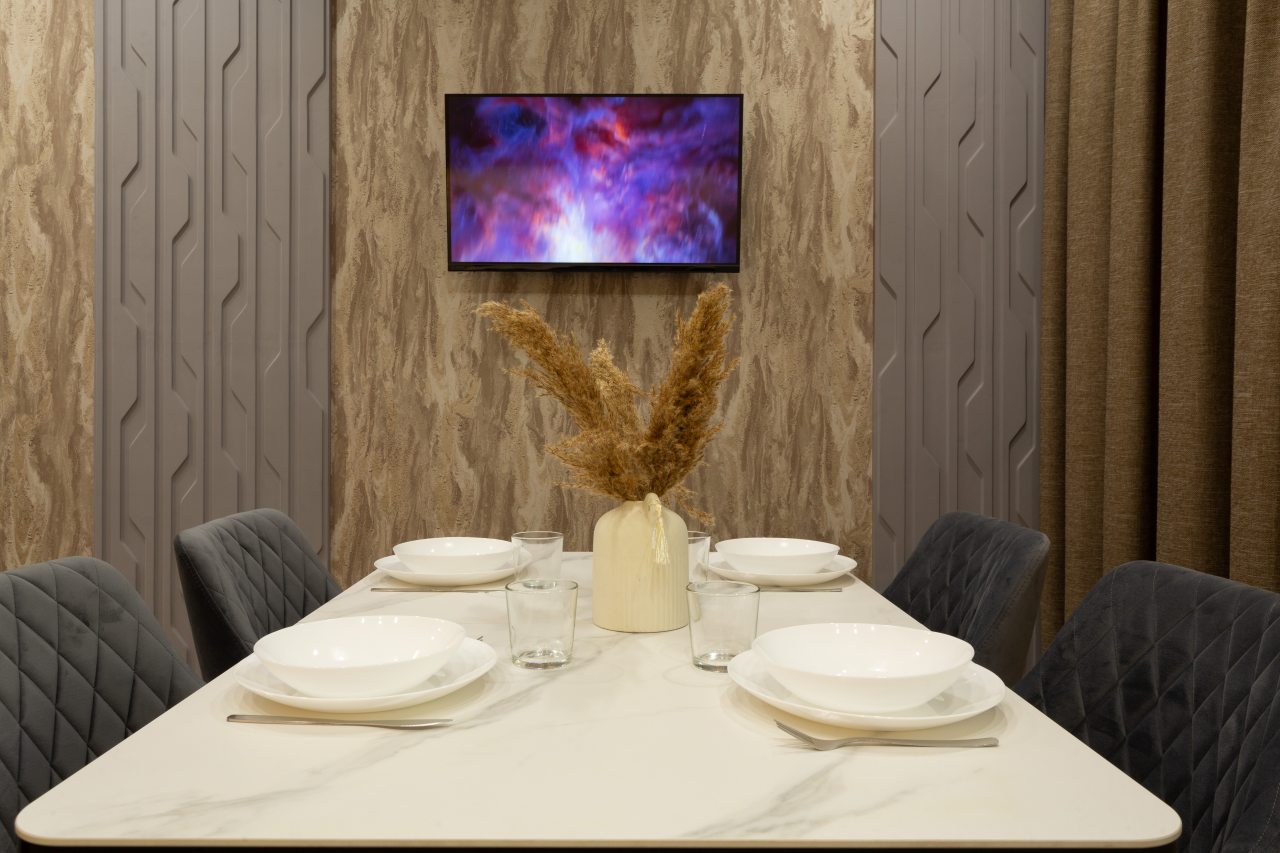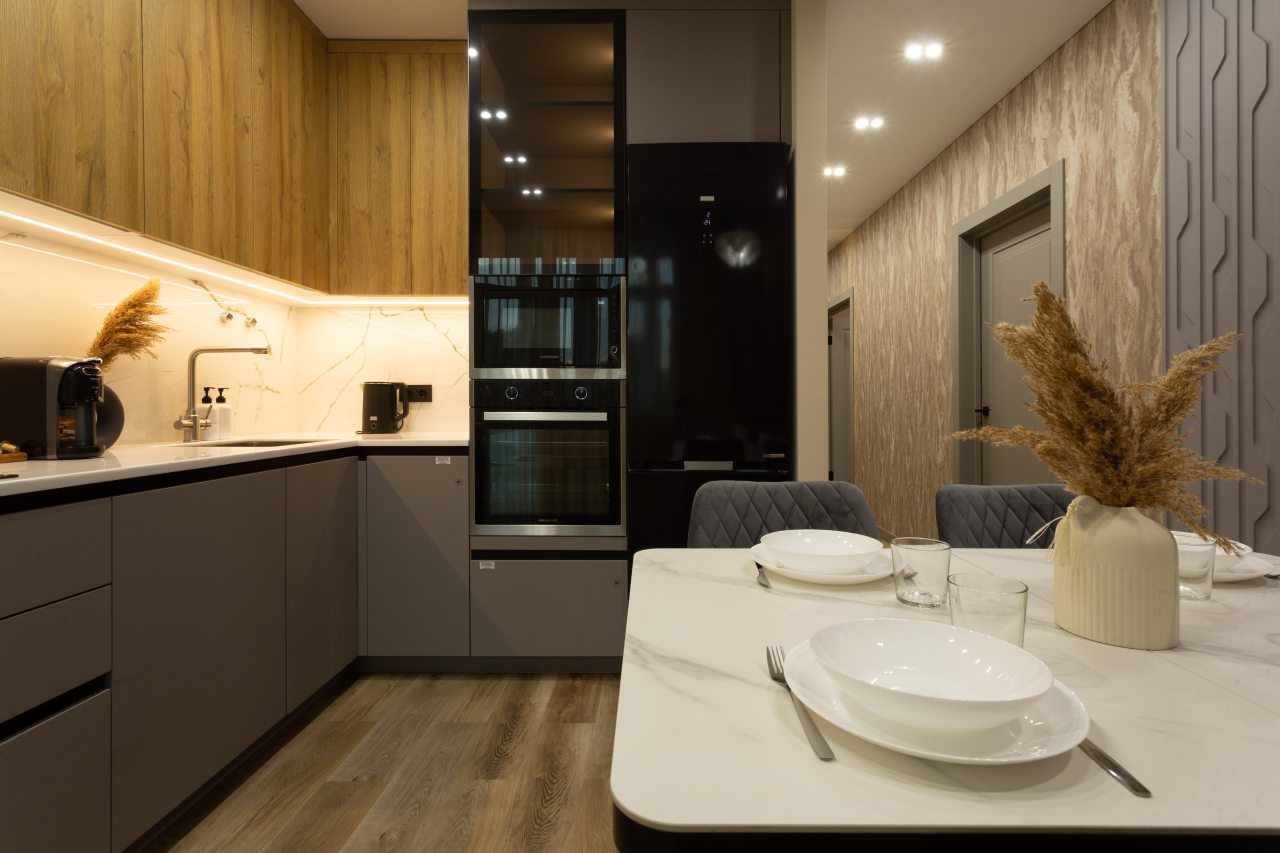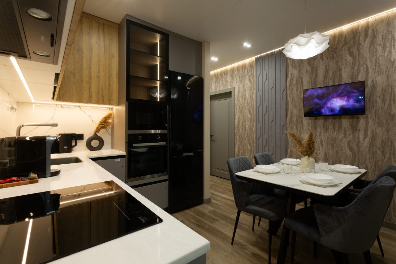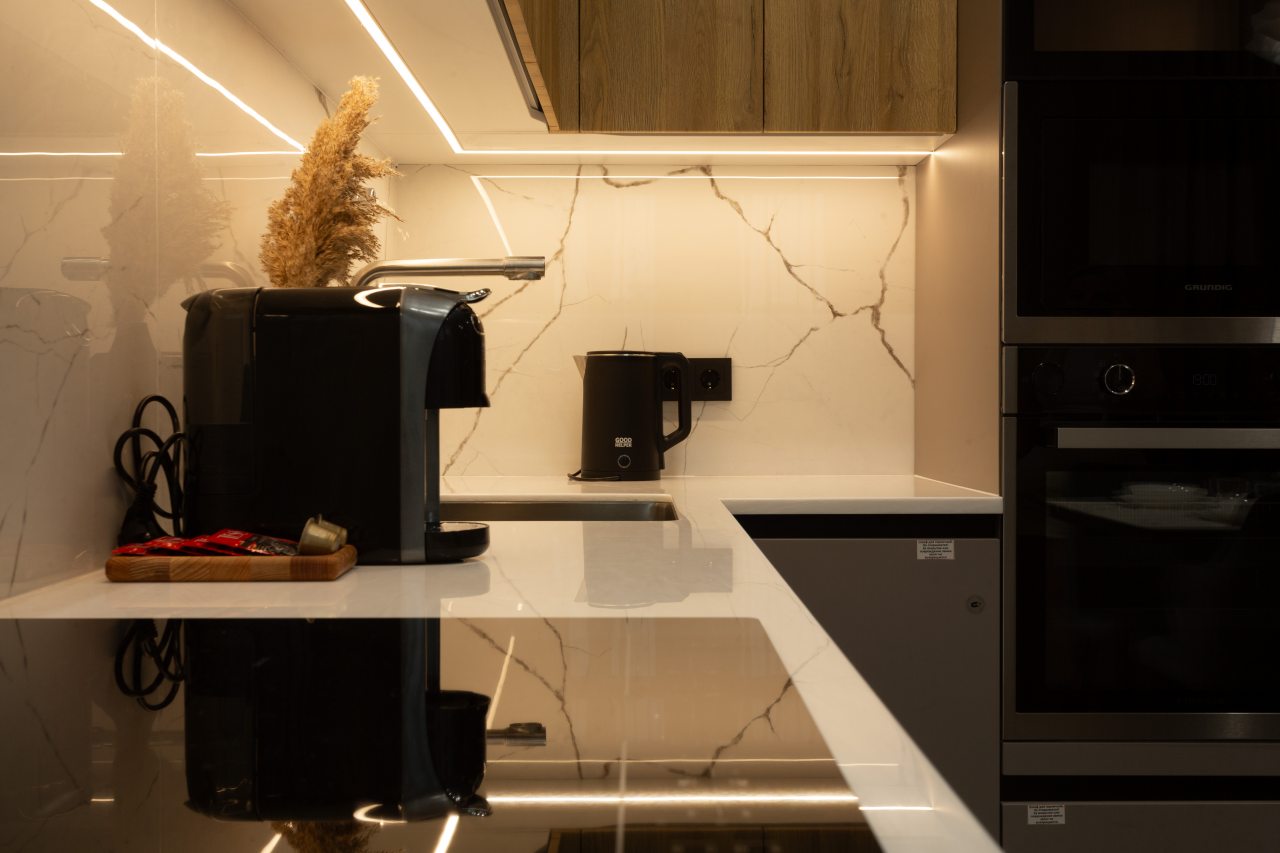 Стильная кухня оснащена комплектом гарнитура, обеденным столом и всей необходимой бытовой техникой, например: холодильником, посудомоечной машиной, электрочайником, кофемашиной, микроволновой печью, электроплитой, духовым шкафом. В доступности продуктовые магазины и кафе.