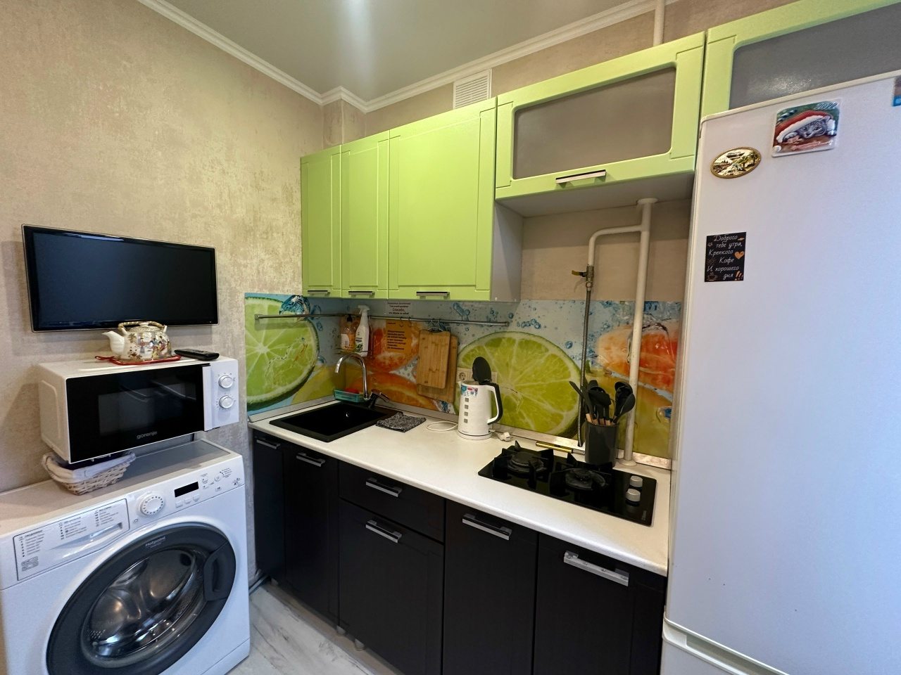 Кухонная зона оснащена плитой, холодильником, микроволновой печью, чайником, варочной панелью. Также имеется набор посуды и столовые приборы.