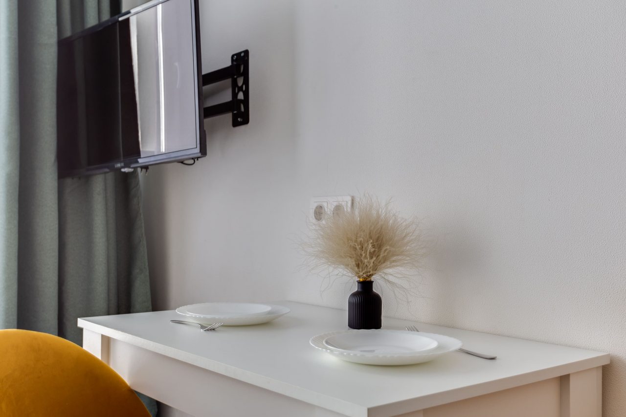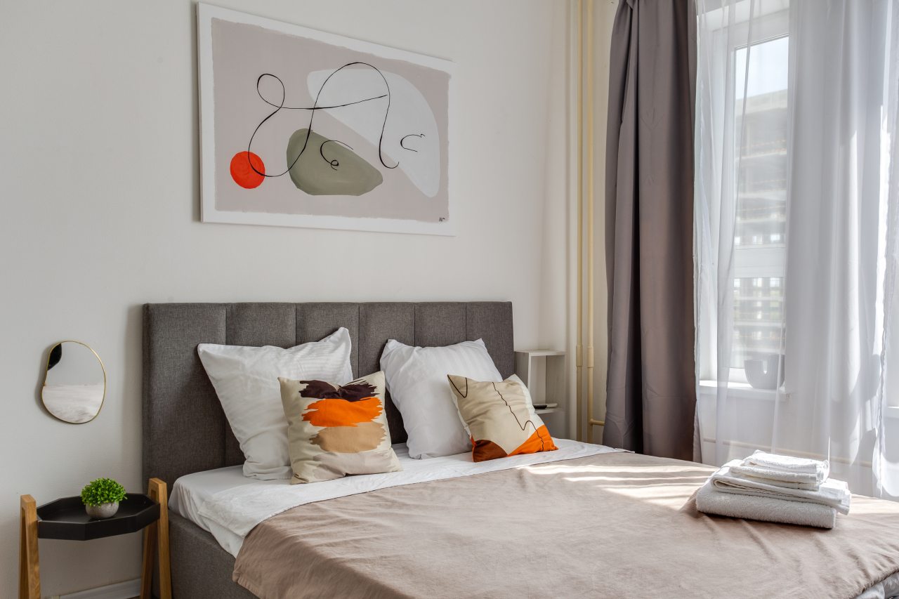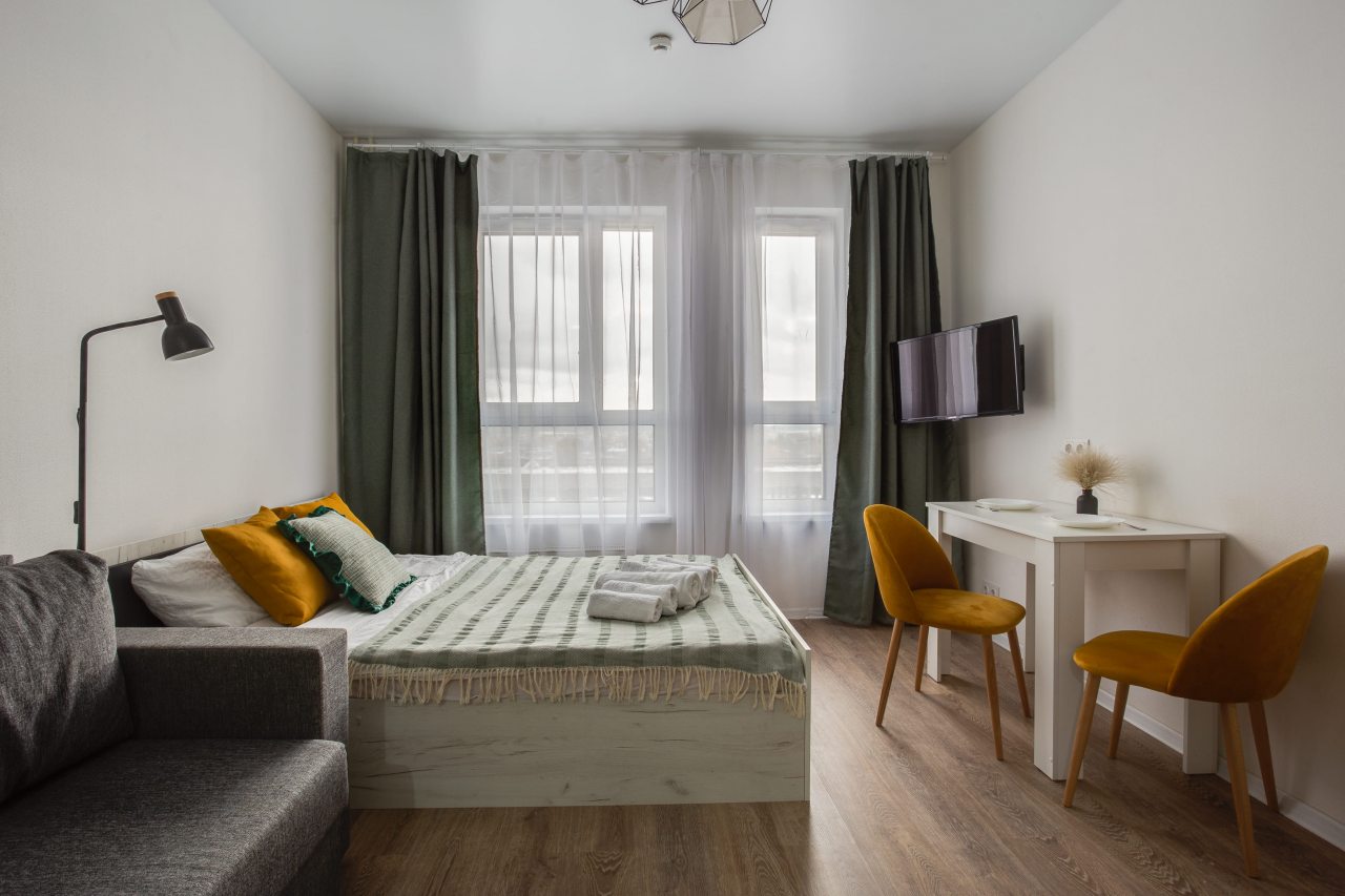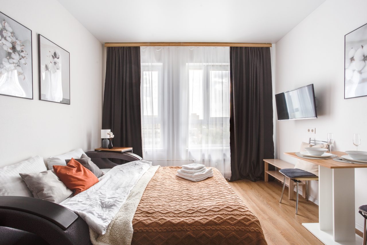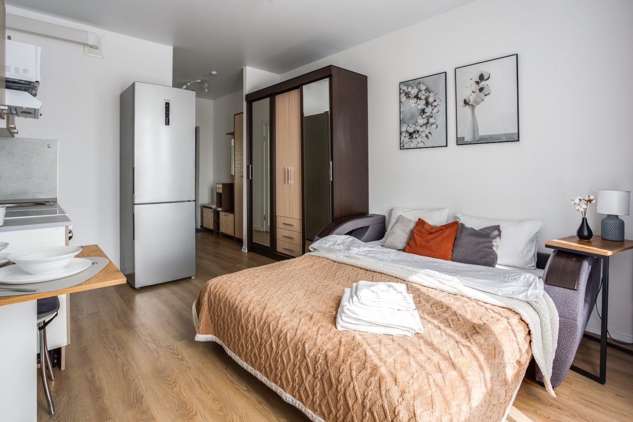Уютные и комфортабельные апартаменты оборудованы всей необходимой мебелью и техникой для качественного проживания, например: удобной двуспальной кроватью с чистым комплектом постельного белья, затемненными шторами, прикроватной мебелью, шкафом, кухонной зоной, вешалками для верхней одежды. Доступна точка wi-fi и телевизор. Санузел укомплектован современной сантехникой, феном и стиральной машиной.