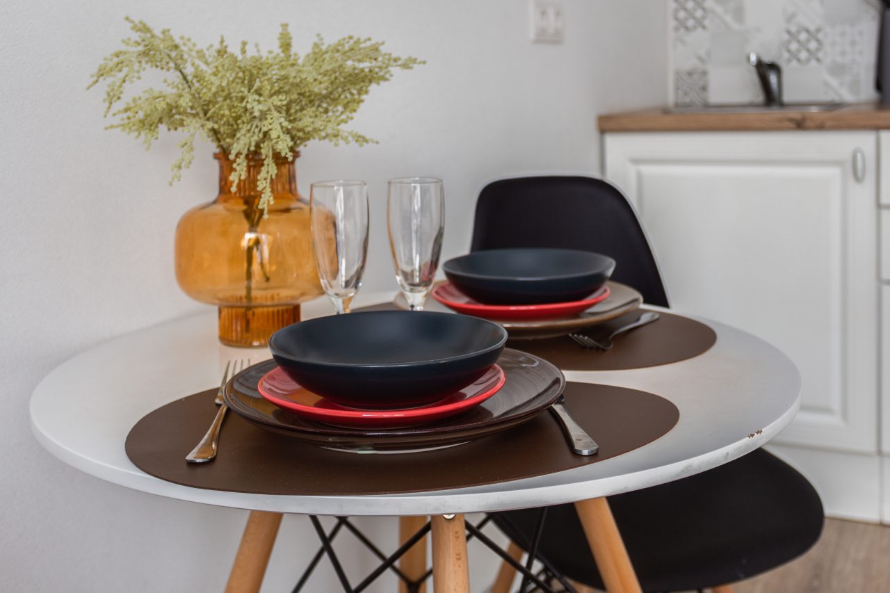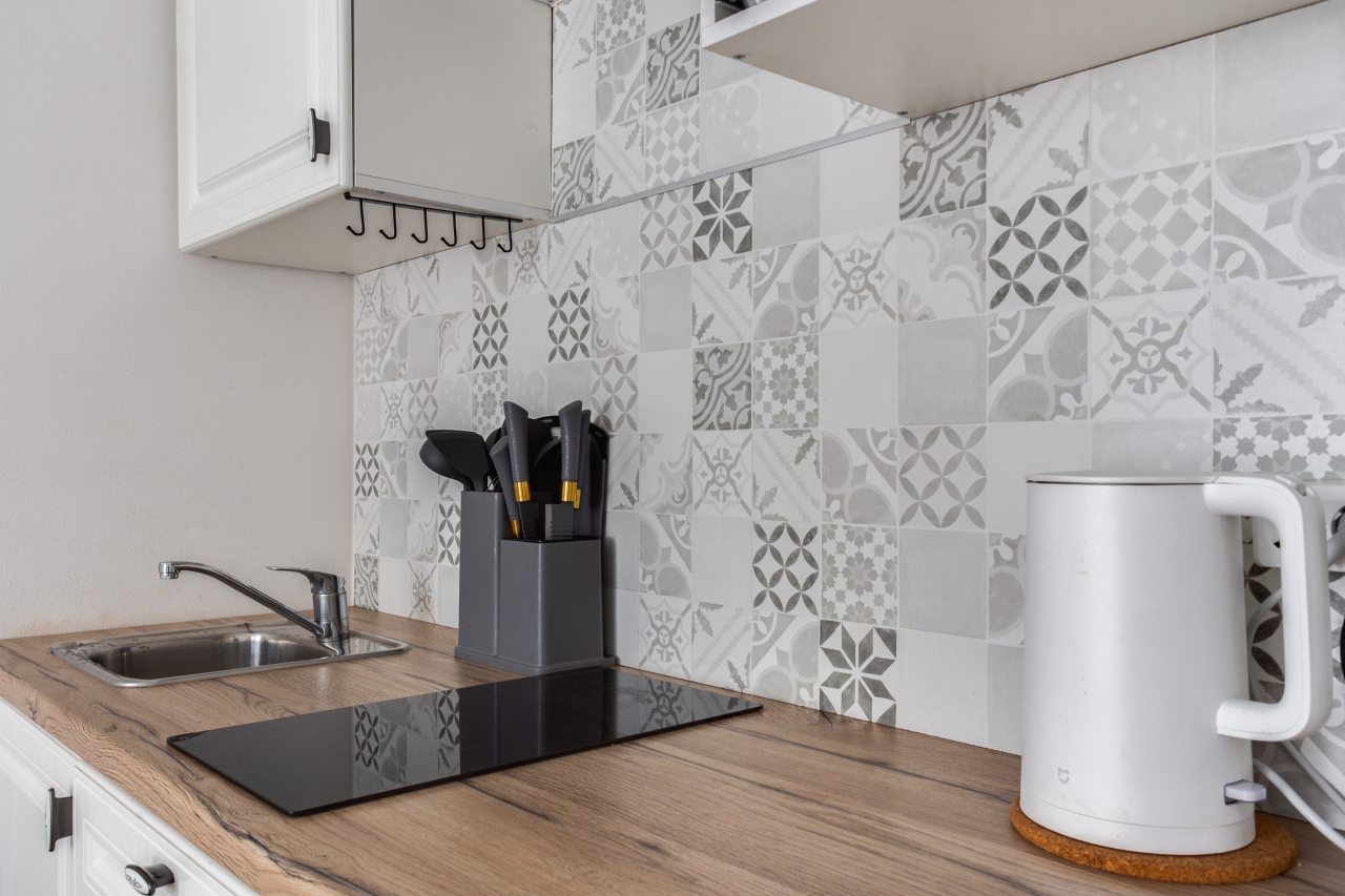 Кухня оснащена гарнитуром, обеденным столом, набором посуды и бытовой техникой. В доступности продовольственный магазин, пиццерия и кафе.
