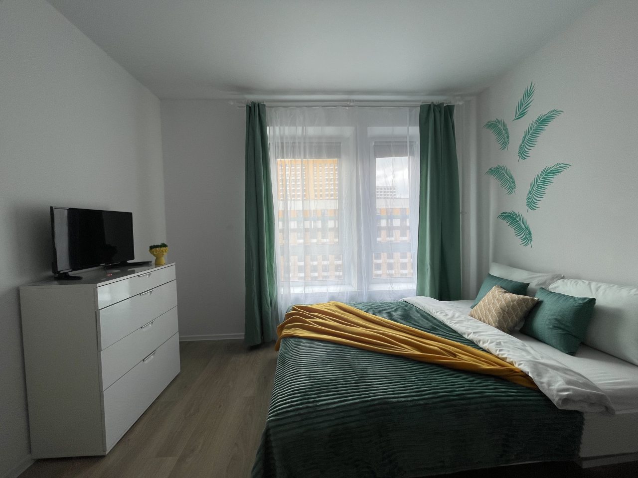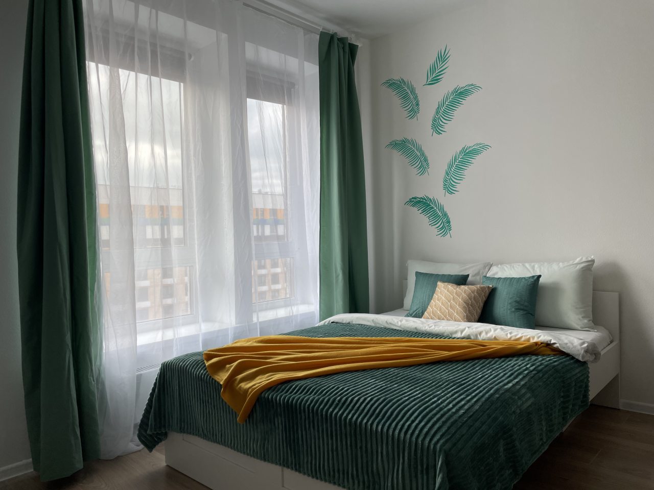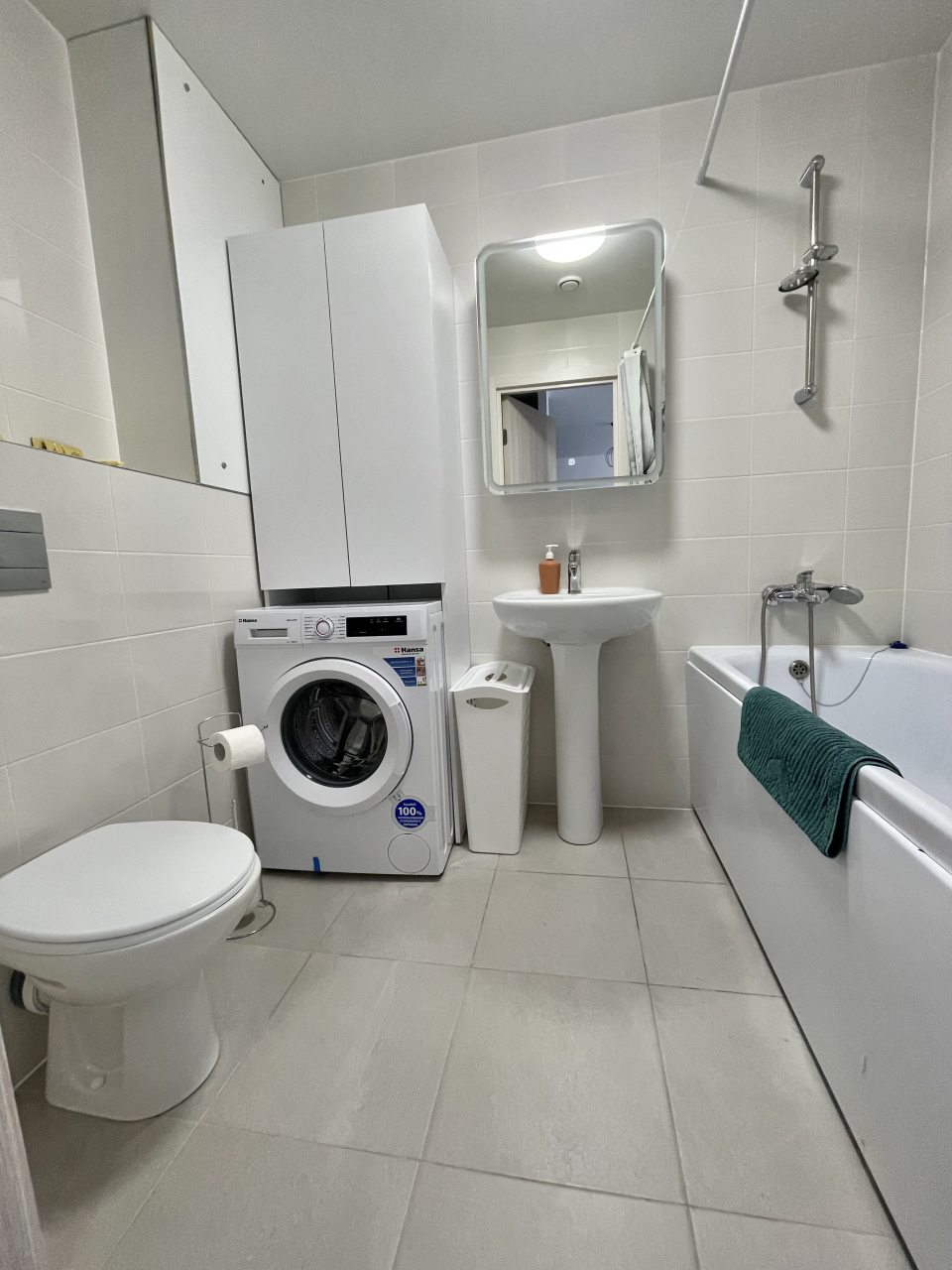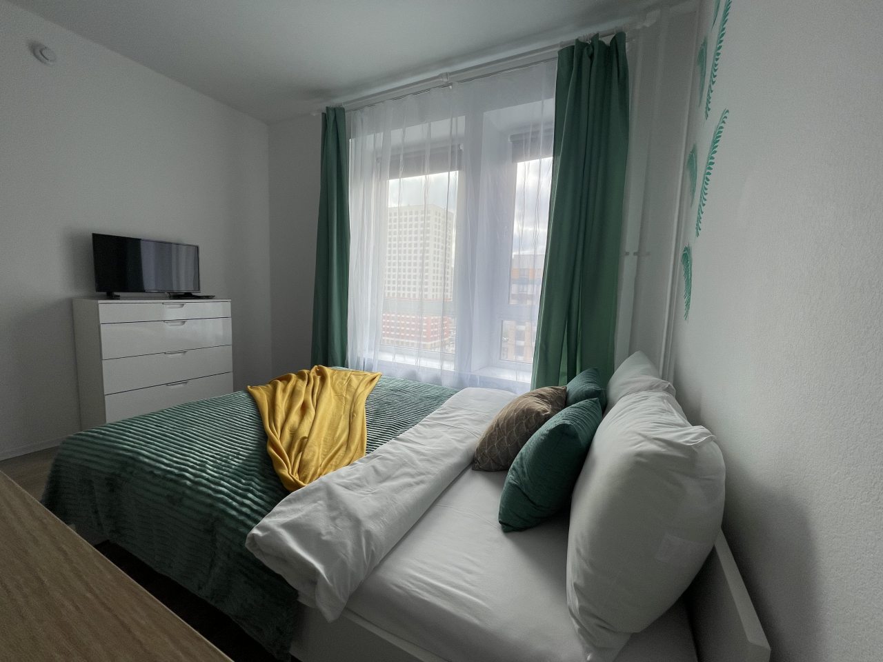 Для выбора доступно несколько апартаментов. В каждых гостей ожидает двуспальная кровать с удобным матрасом, различная мебель для хранения вещей, телевизор, стиральная машина, а также санузел, в котором может быть душевая или ванна.