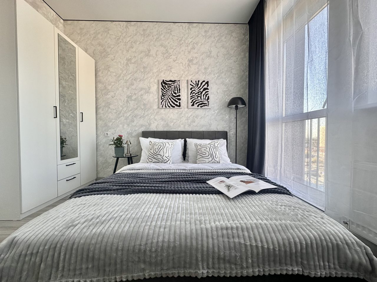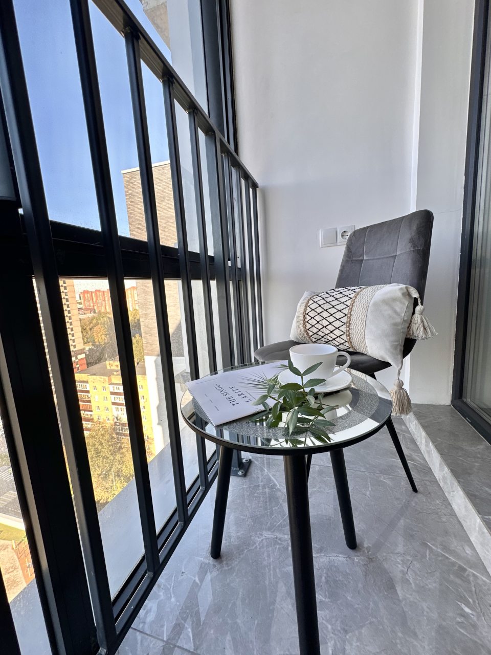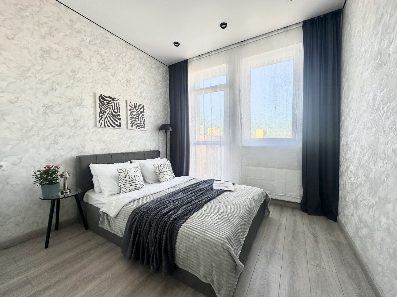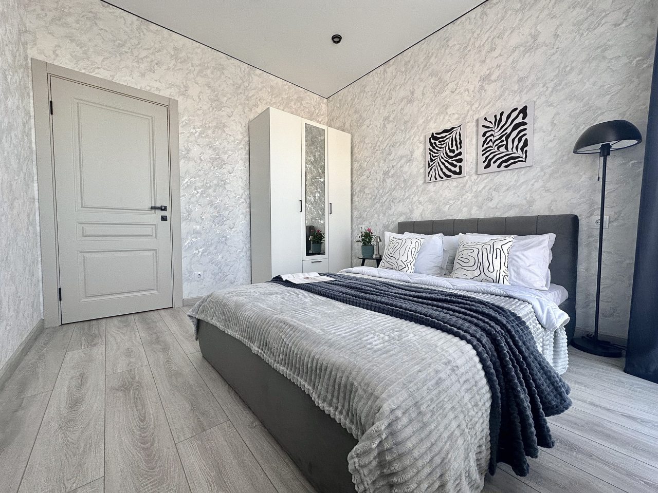 Для комфортного проживания гостей предусмотрены двуспальная кровать с мягким изголовьем, затемнённые шторы, шкаф с зеркалом, удобный диван с телевизором, разноплановое освещение, небольшая лоджия с панорамным остеклением, а также санузел с полноценной ванной.