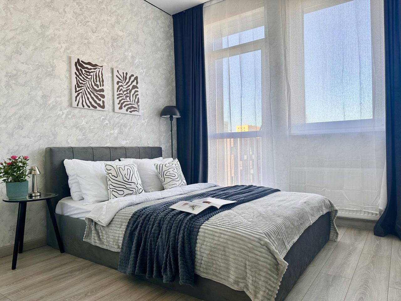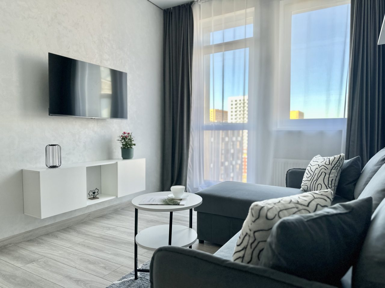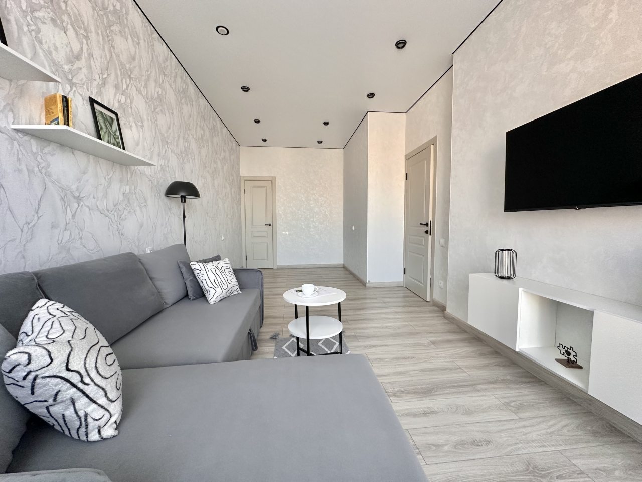 Для комфортного проживания гостей предусмотрены двуспальная кровать с мягким изголовьем, затемнённые шторы, шкаф с зеркалом, удобный диван с телевизором, разноплановое освещение, небольшая лоджия с панорамным остеклением, а также санузел с полноценной ванной.