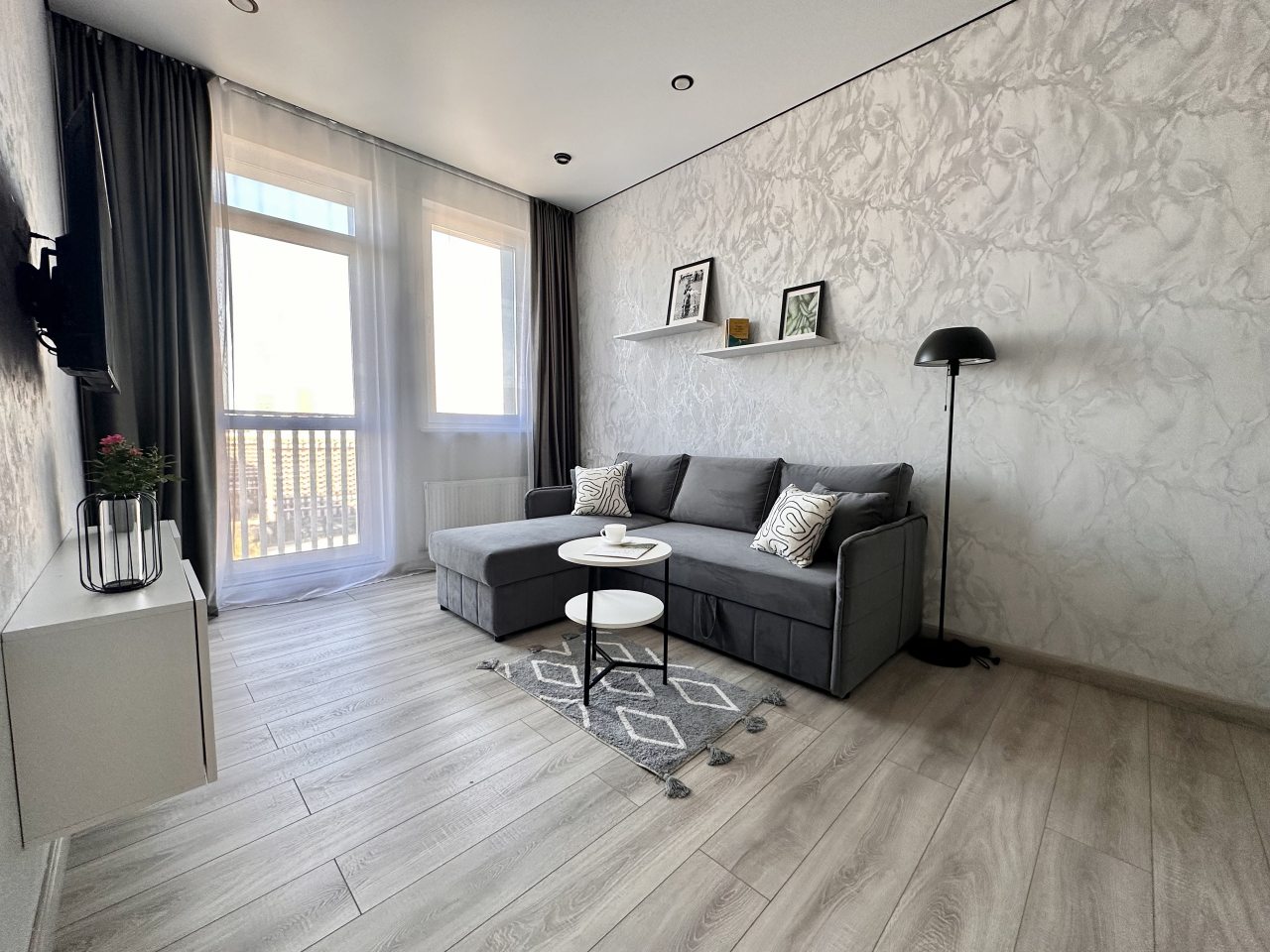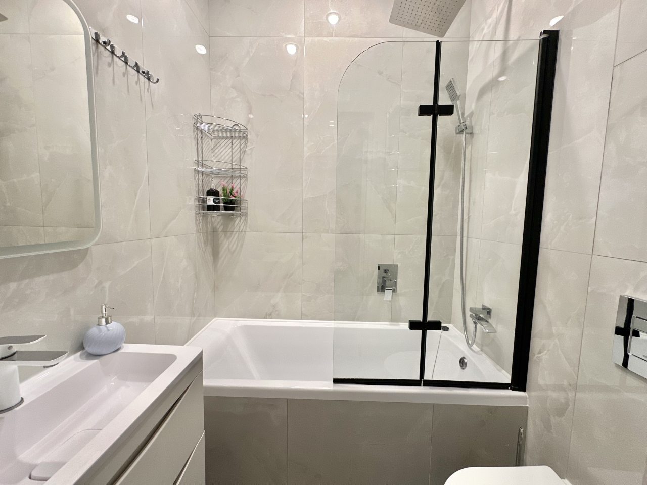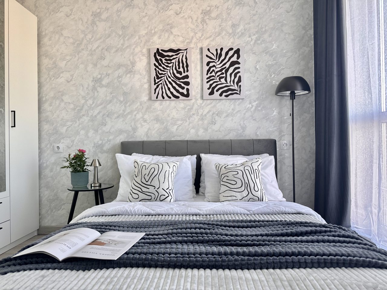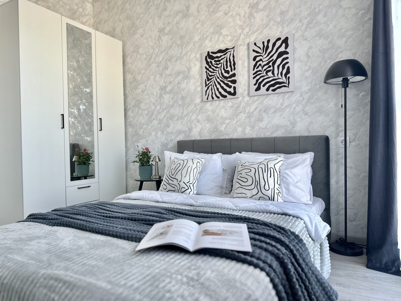 Для комфортного проживания гостей предусмотрены двуспальная кровать с мягким изголовьем, затемнённые шторы, шкаф с зеркалом, удобный диван с телевизором, разноплановое освещение, небольшая лоджия с панорамным остеклением, а также санузел с полноценной ванной.