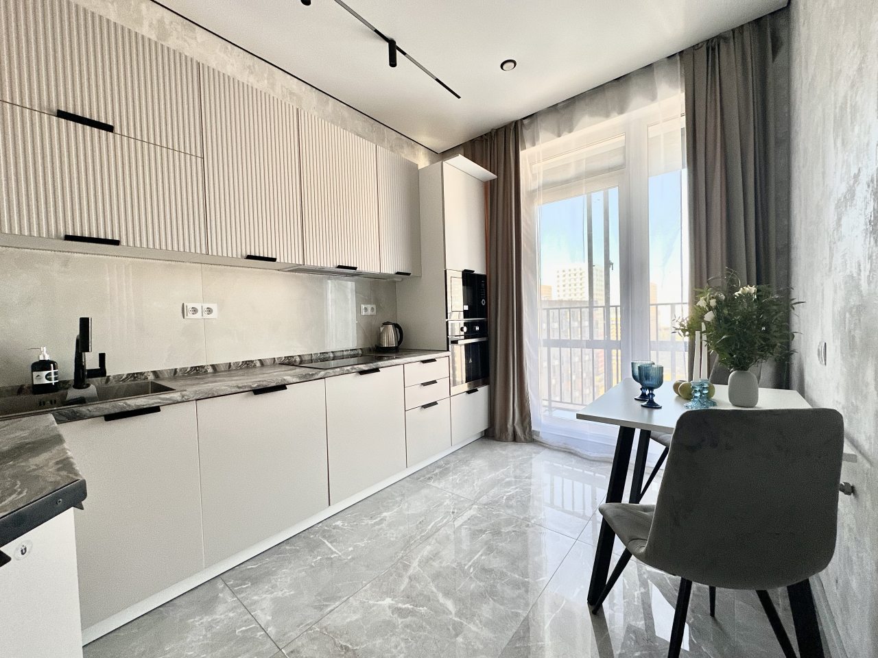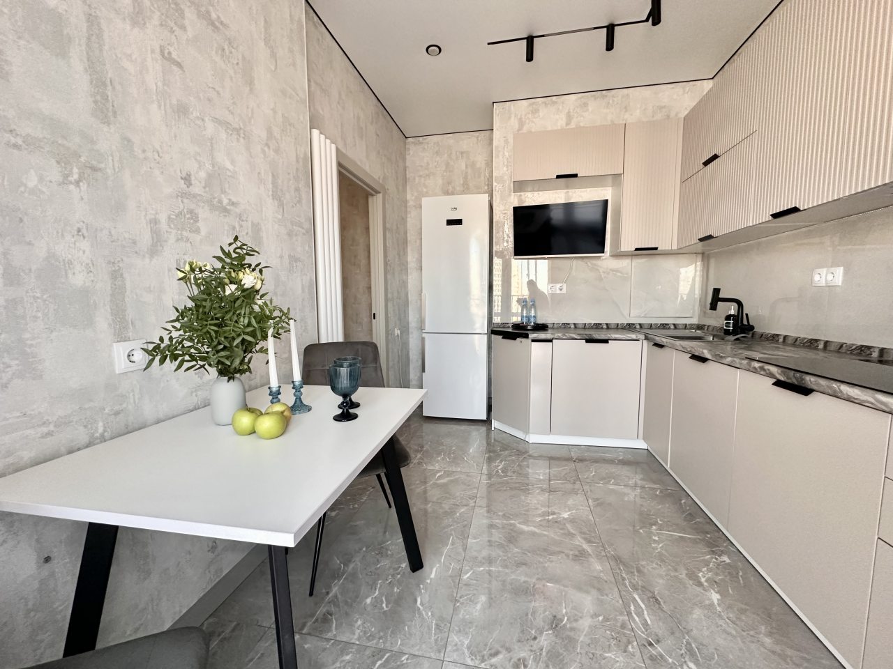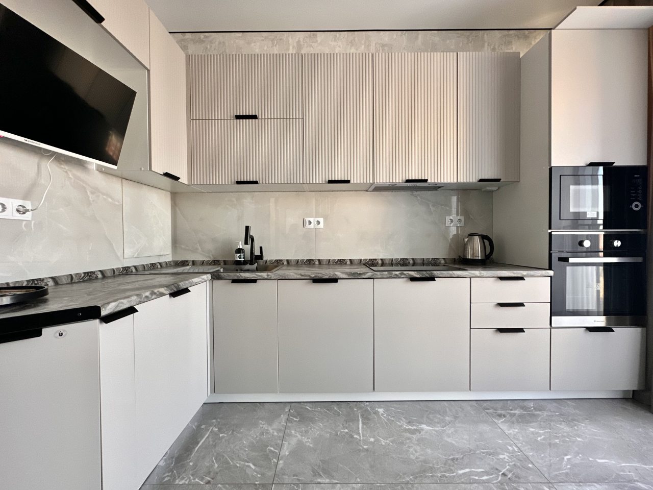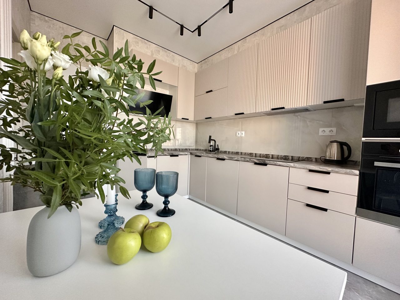 На уютной кухне будет приятно готовить, поскольку она оснащена плитой, чайником, духовым шкафом, красивой обеденной зоной, микроволновой печью.