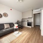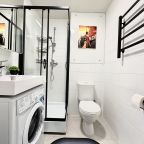 Светлые апартаменты укомплектованы удобными спальными местами, большим окном, комодом, телевизором, кондиционером, шкафом, кухонной зоной и др. Доступна точка высокоскоростного интернета. Санузел оборудован комплектом современной сантехники, стиральной машиной и полотенцесушителем.