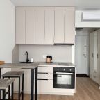 Кухня оснащена стильным гарнитуром, варочной панелью, электрочайником, вытяжкой, холодильником, духовым шкафом. В шаговой доступности кафе и другие заведения, где можно вкусно пообедать.