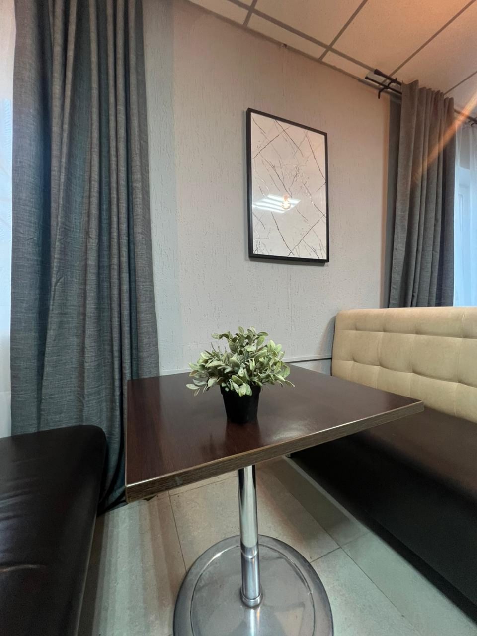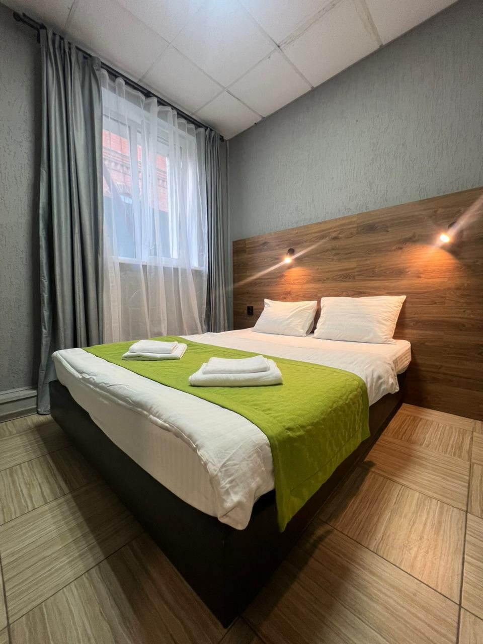 Постельное белье застиранное. Полотенца ,признаться ,дали новые, даже бирки с магазина не сняты.Запах в номере- мне показалось даже пахнет дихлофосом. Ночью в ванной комнате потекла вода с потолка. Увидели только рано утром, пытались найти администратора- а его нет. На стойке регистрации ( как написано - круглосуточно)оставлен номер телефона, но он не доступен ((.