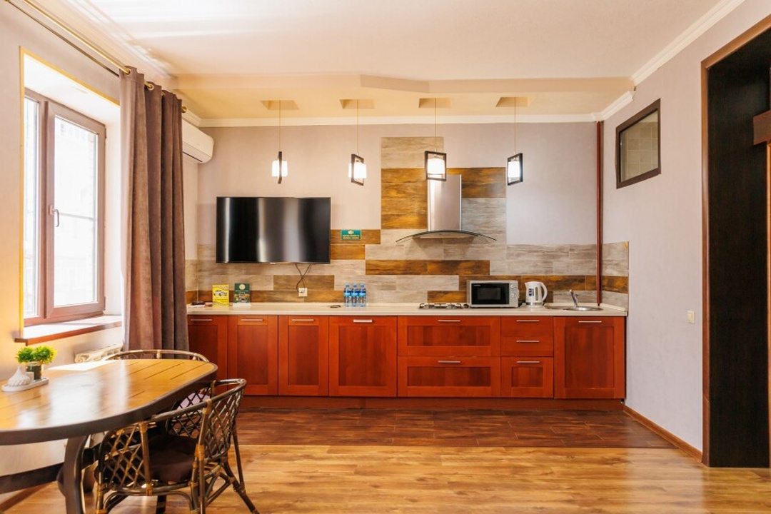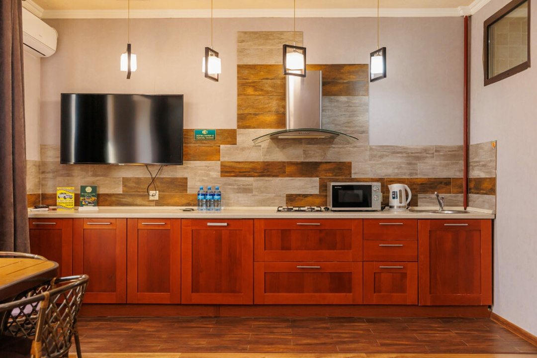 На просторной кухне будет приятно готовить любимые блюда и напитки. Имеется плита, СВЧ-печь, чайник, обеденный стол со стульями.