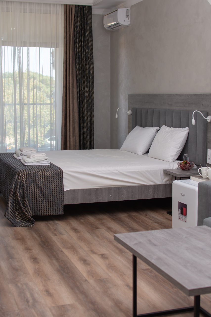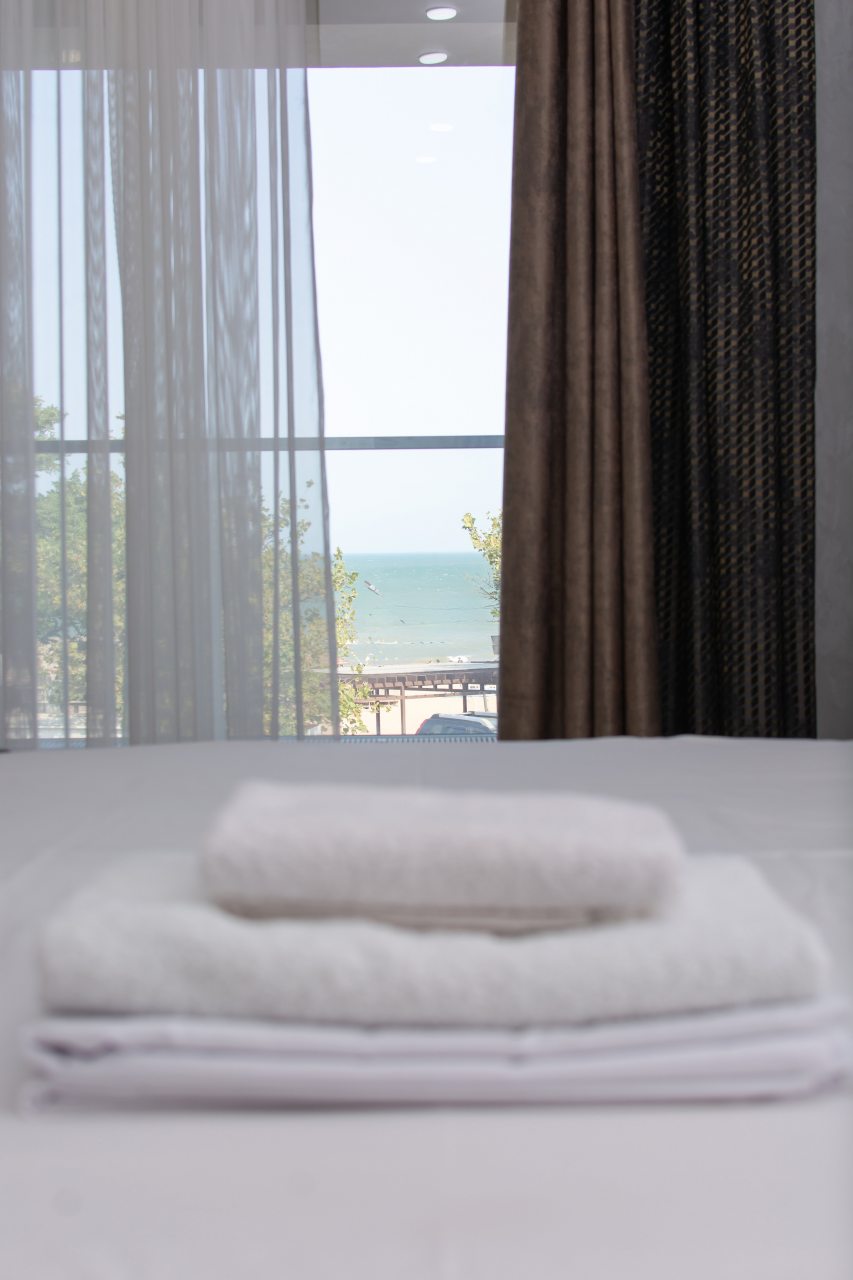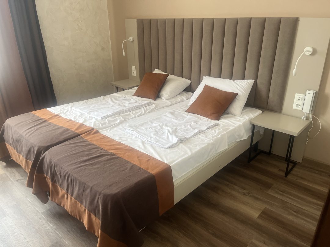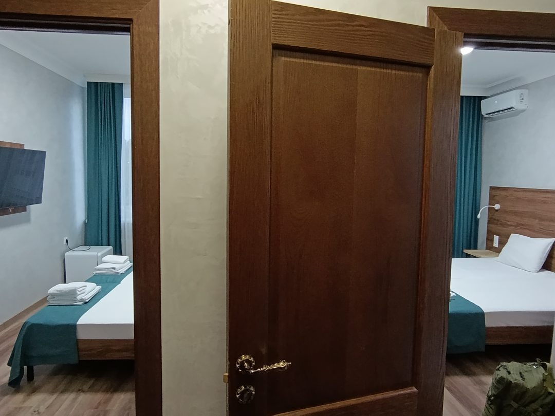 На отдых приехали с семьей сына с трёхлетним ребёнком. Проживали в двух номерах. Номера "Стандарт", комнаты просторные, соответствует описанию. Отель на самой границе с центральным городским пляжем.