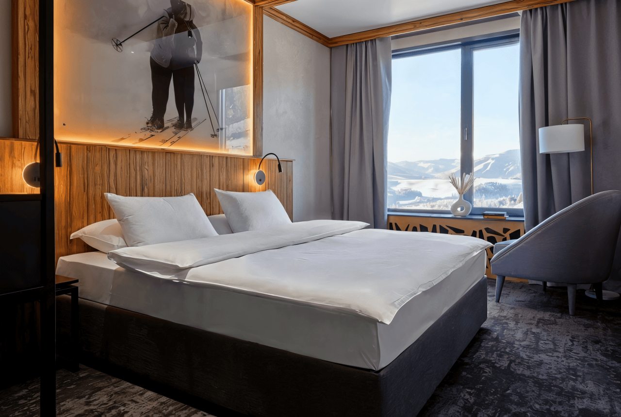 - Двухместный (Стандарт с двуспальной кроватью и видом на горы)