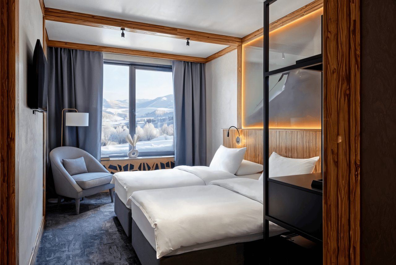 - Двухместный (Стандарт с двумя односпальными кроватями и видом на горы)