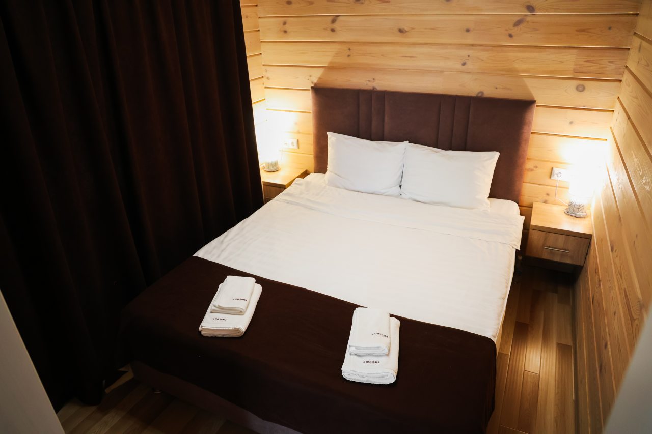 Для размещения предлагаются номера в современных домиках, которые оснащены WI-FI, холодильником, электрочайником, сейфом, полотенцами и собственной ванной комнатой. С лоджии можно будет наблюдать природные виды.