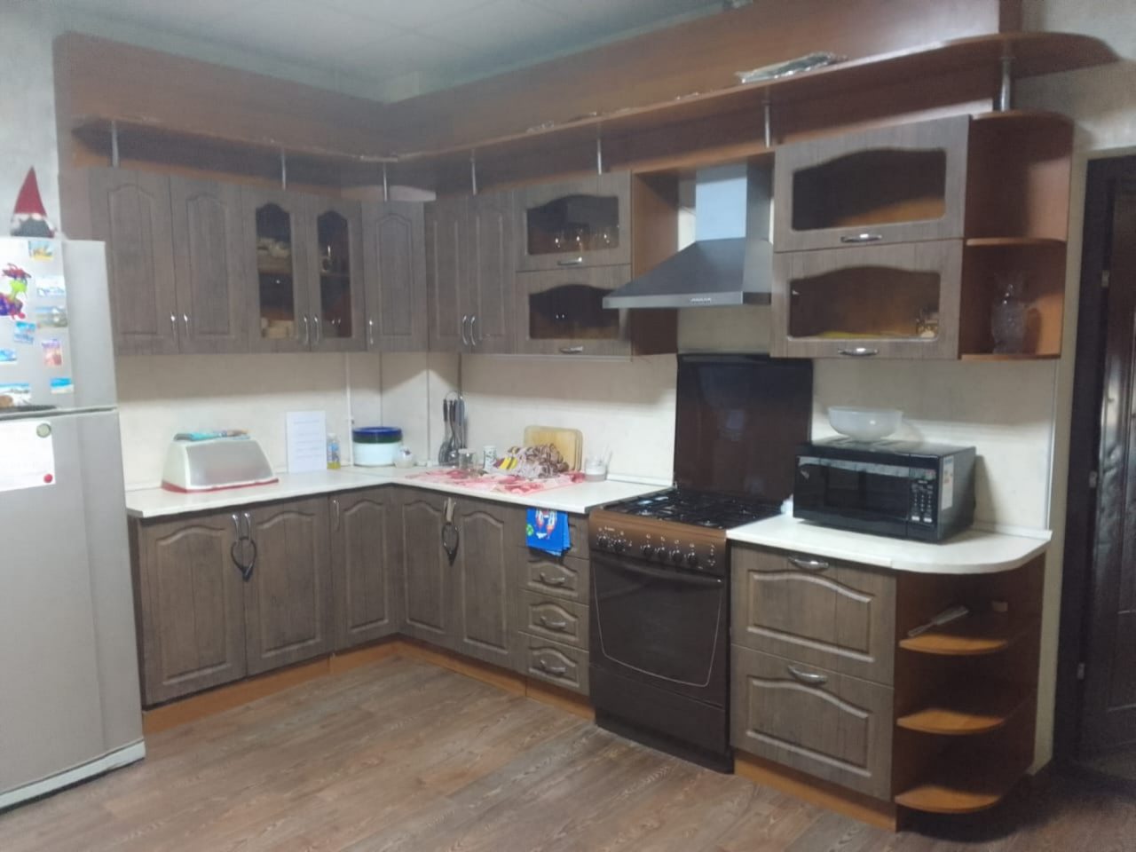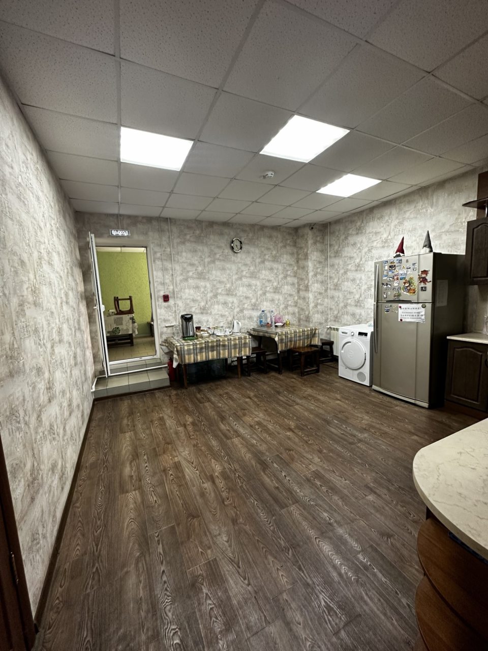 На общей кухне оборудована зона самостоятельного приготовления пищи для проживающих. установлены столы и кухонный гарнитур с бытовой техникой. В шаговой доступности работают несколько продуктовых магазинов, кафе и ресторан.