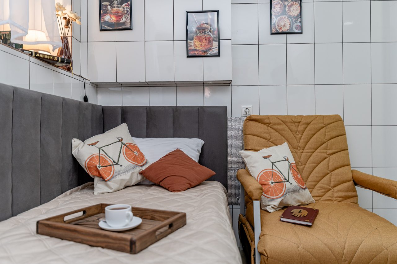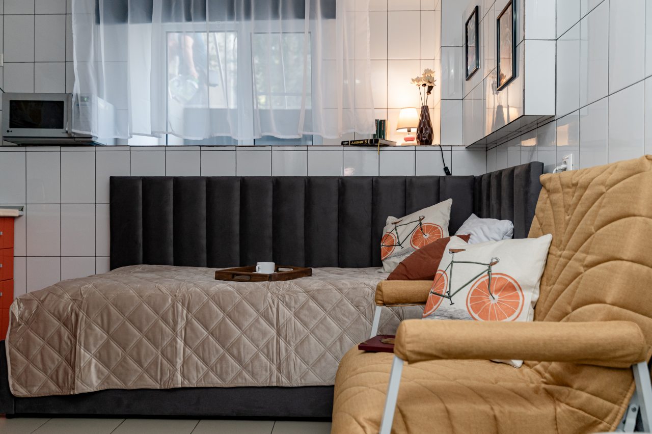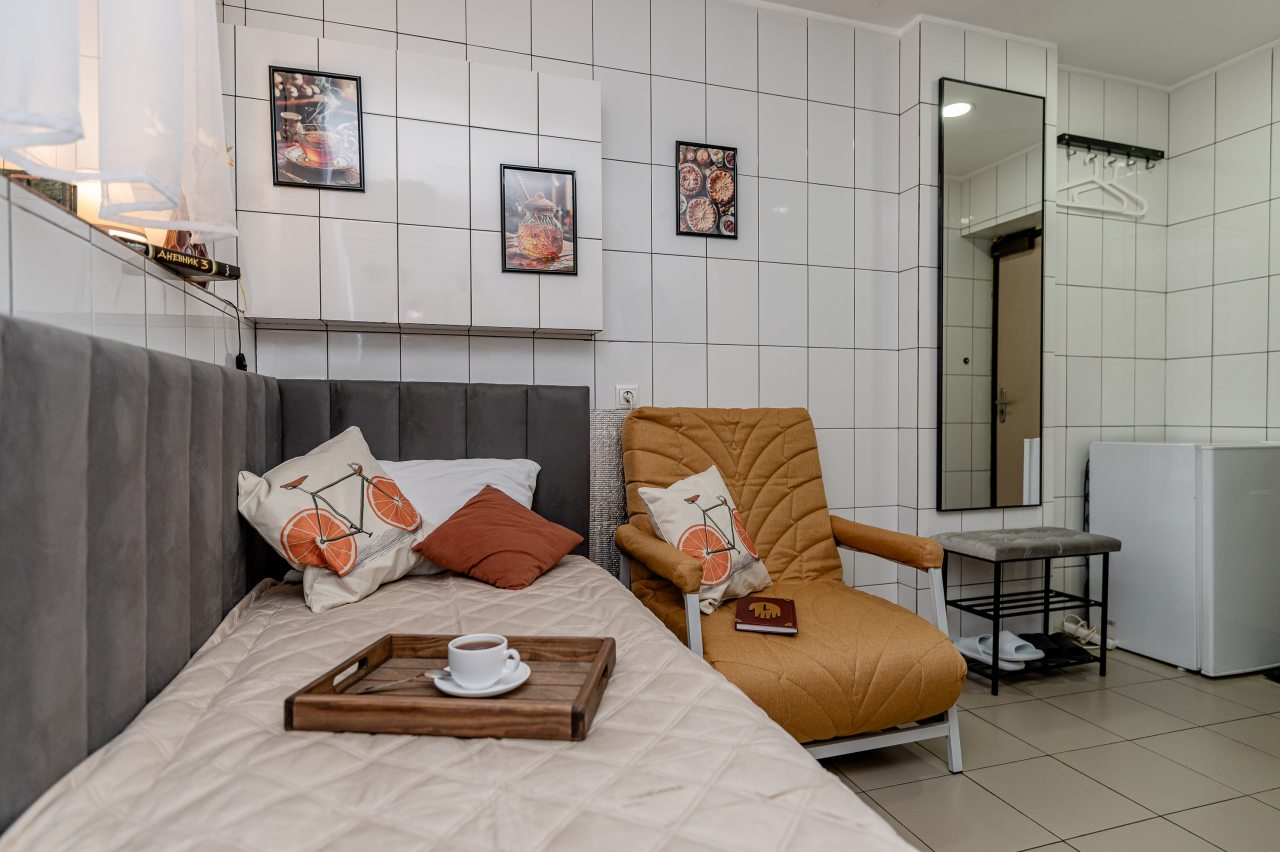 Номера выполнены в современном стиле. Необычным решение стало спальное место на антресолях, установлена мягкая мебель, техника и персональная душевая комната.