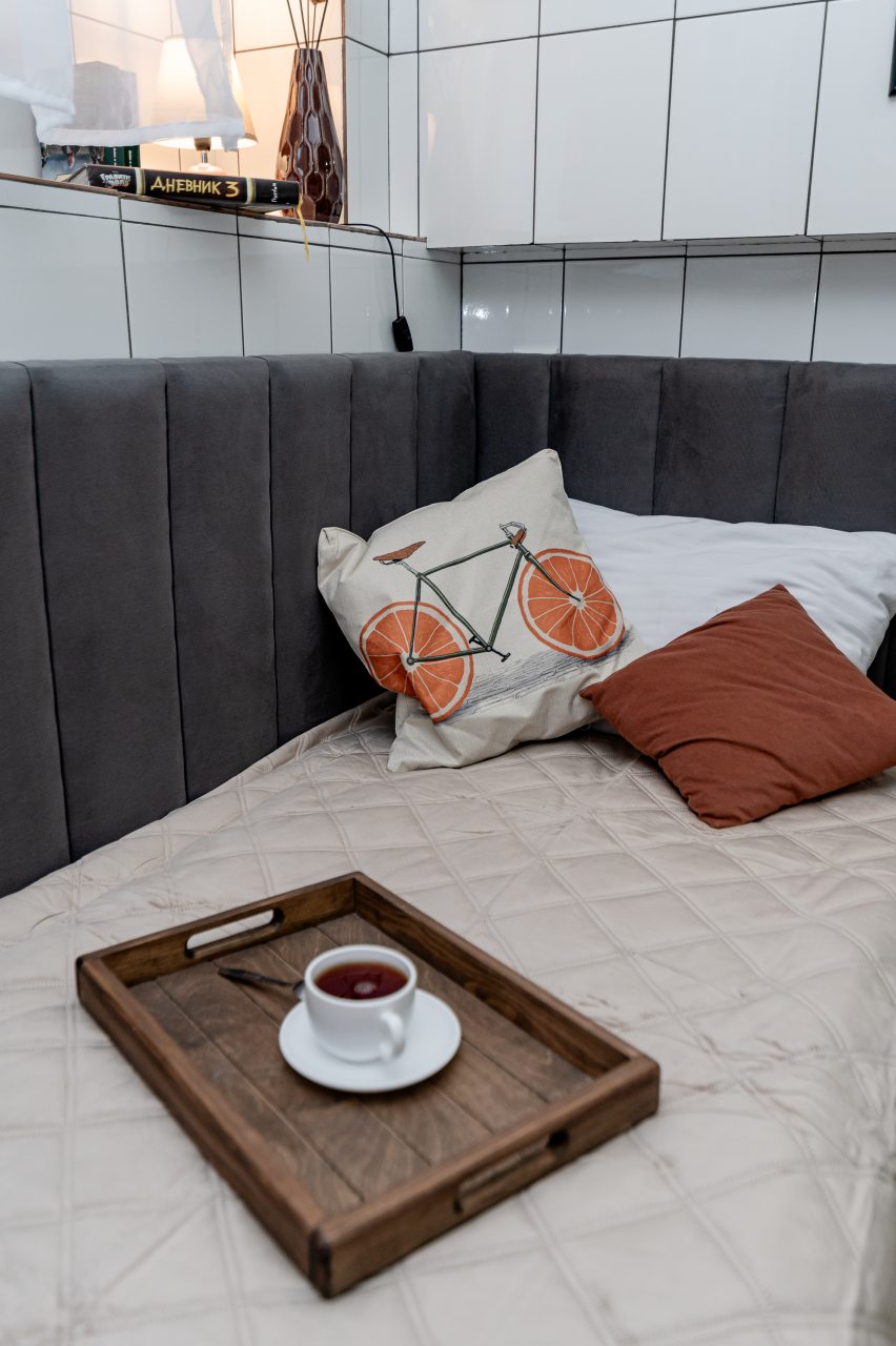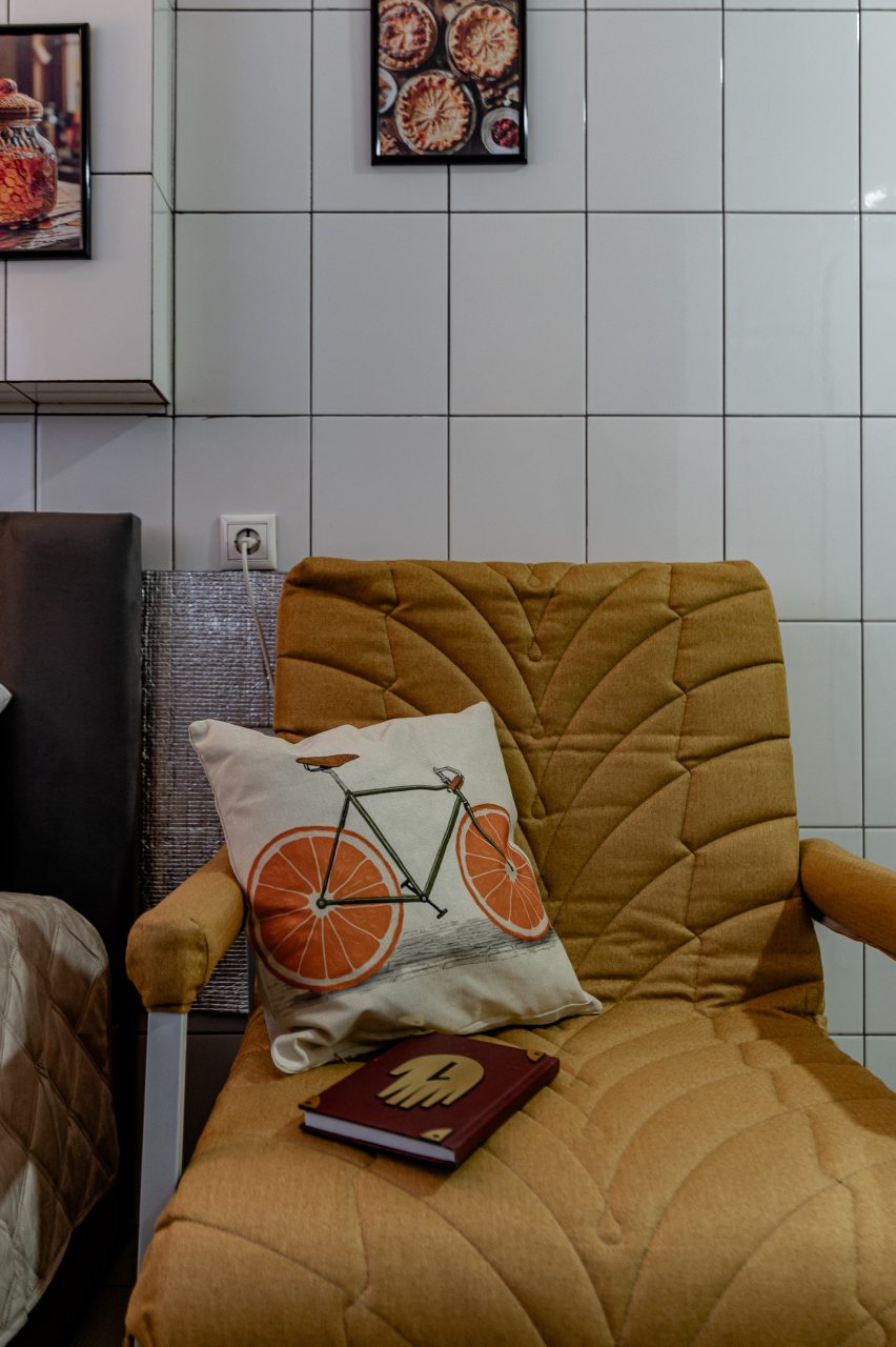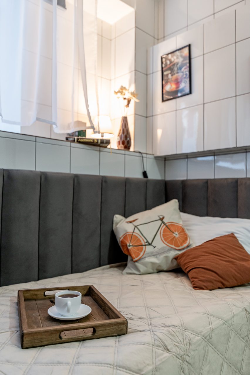Номера выполнены в современном стиле. Необычным решение стало спальное место на антресолях, установлена мягкая мебель, техника и персональная душевая комната.