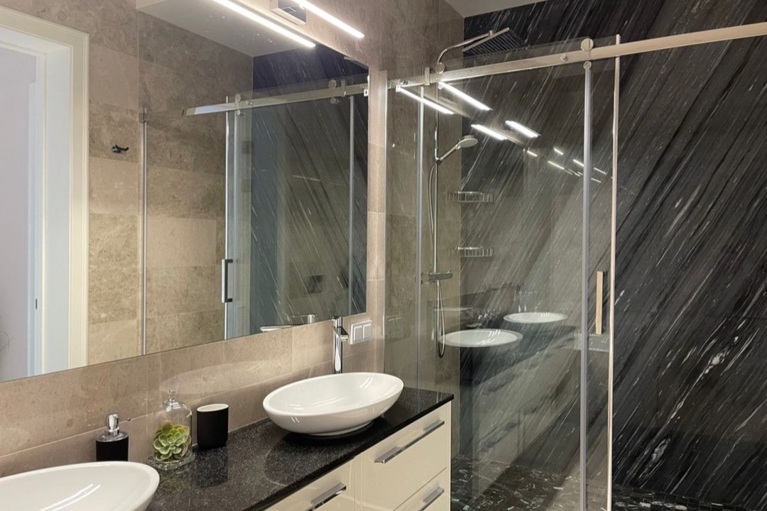 1-й отсутствует горячая вода, ну в смысле формально она есть, через проточный водонагреватель, но он такой мощности, что можно сказать, что её нет вовсе, причём даже такая чуть тёплая вода есть только на лейке в душевой (тропический холодный) и на лейке ванны, которая стоит в спальне. Поэтому наша мечта понежиться в ванной, так и осталась мечтой.