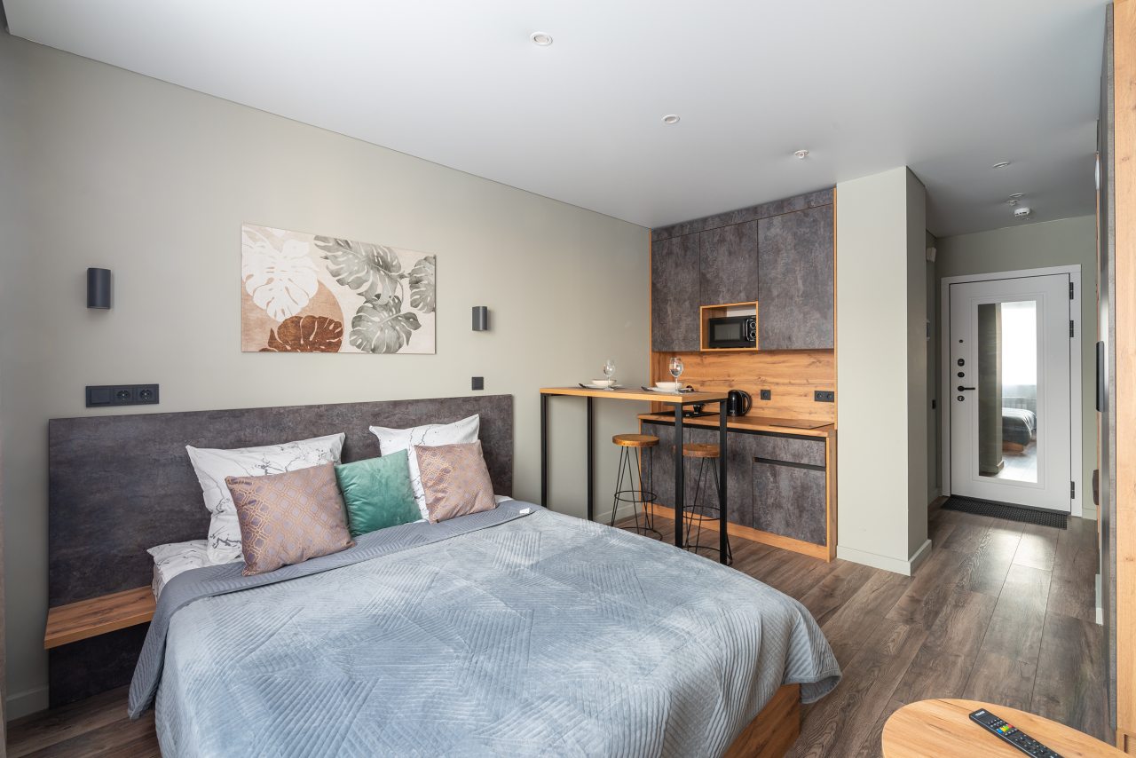 Для проживания предлагаются комфортабельные квартиры с современным ремонтом, оснащенные удобными спальными местами с комплектом постельного белья из 100% хлопка, лампами для чтения, шкафом для хранения одежды, системой индивидуального кондиционирования, телевизором, сейфом для ценных вещей. Доступна точка высокоскоростного интернета. Санузел оборудован нужной сантехникой, премиальной косметикой, феном и стиральной машиной.