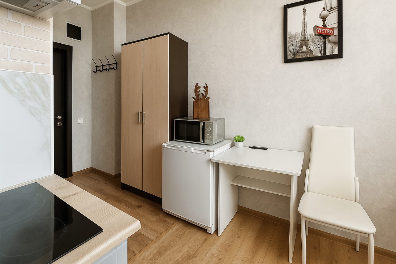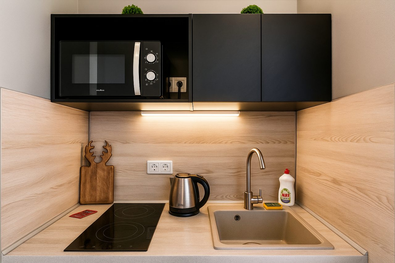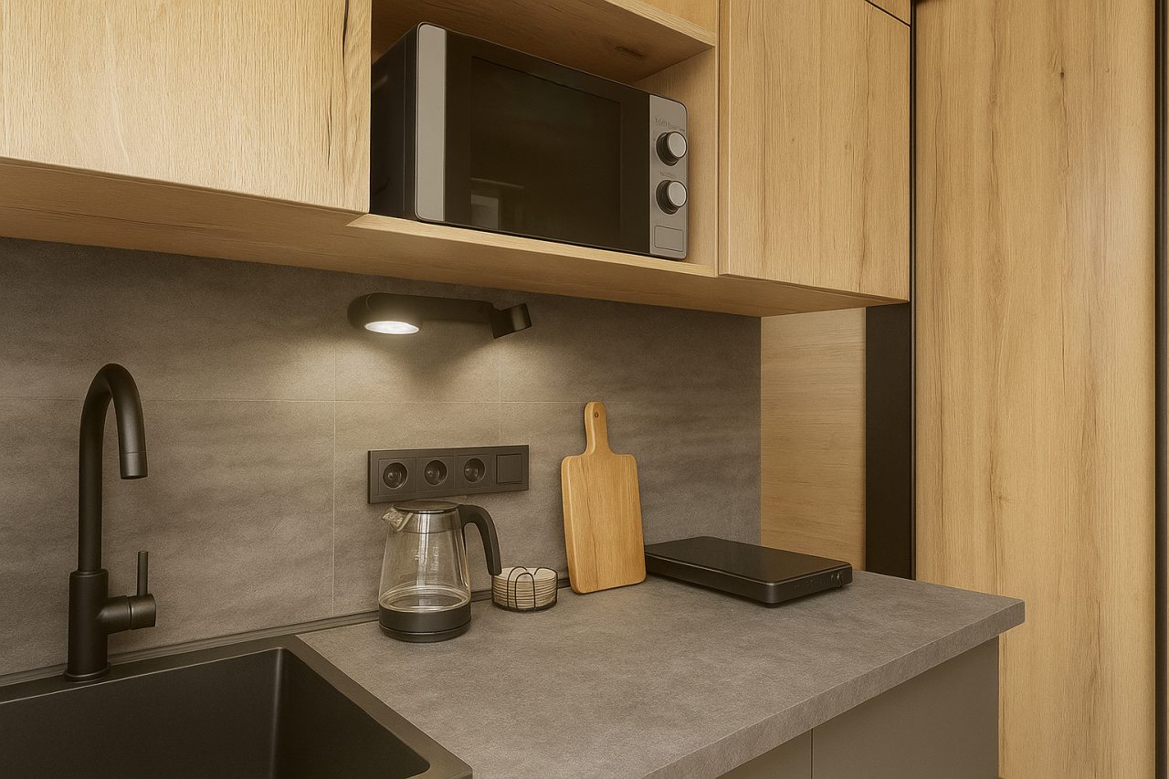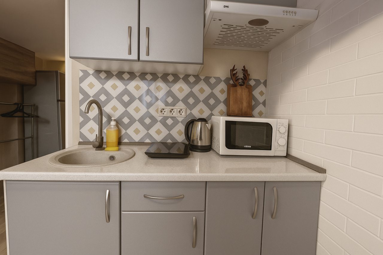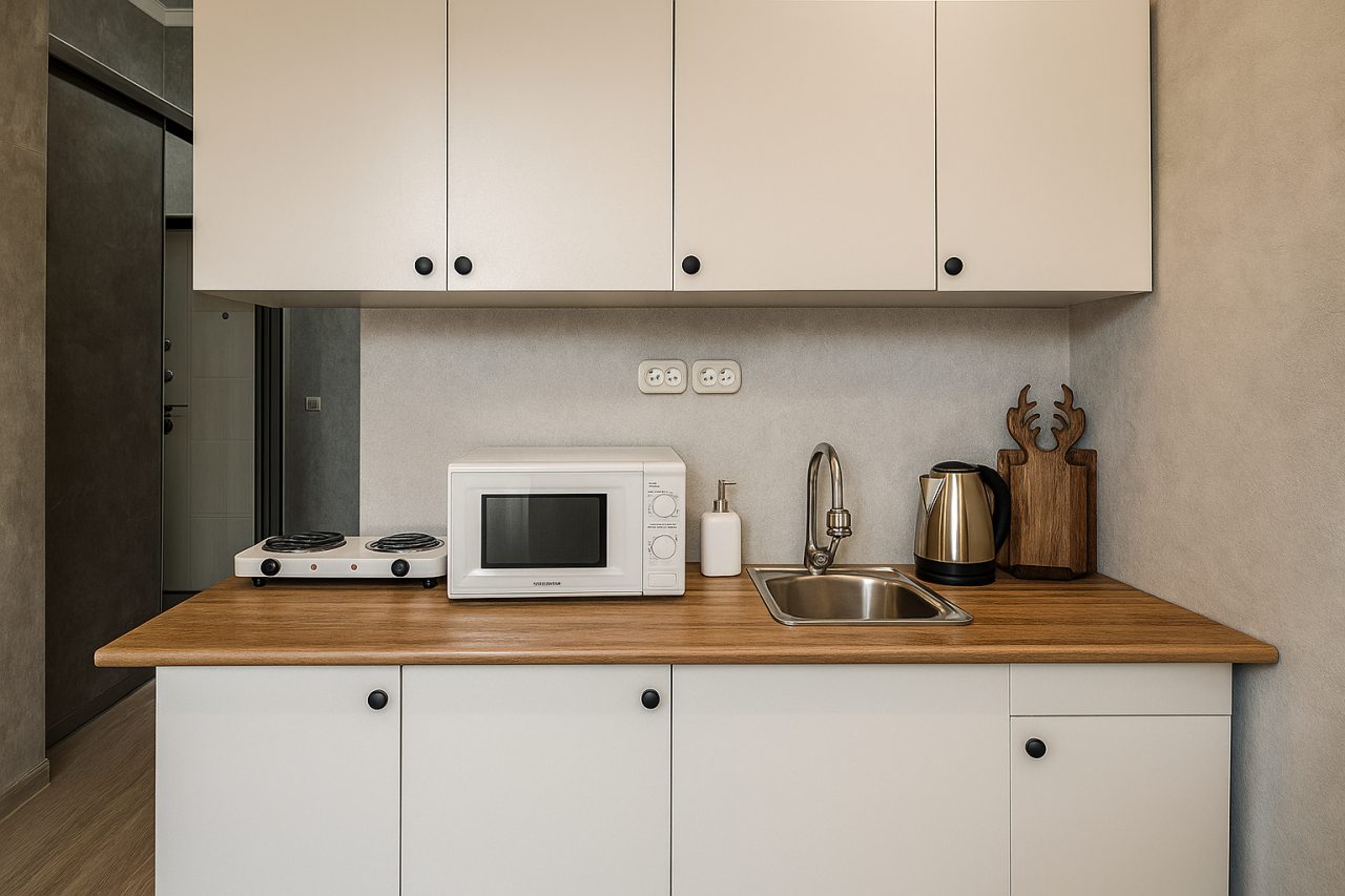 На небольшой кухонной зоне есть бытовой техникой, а также необходимый инвентарь для приготовления и разогревания пищи. Магазины продуктов, кафе и рестораны в пешей доступности.
