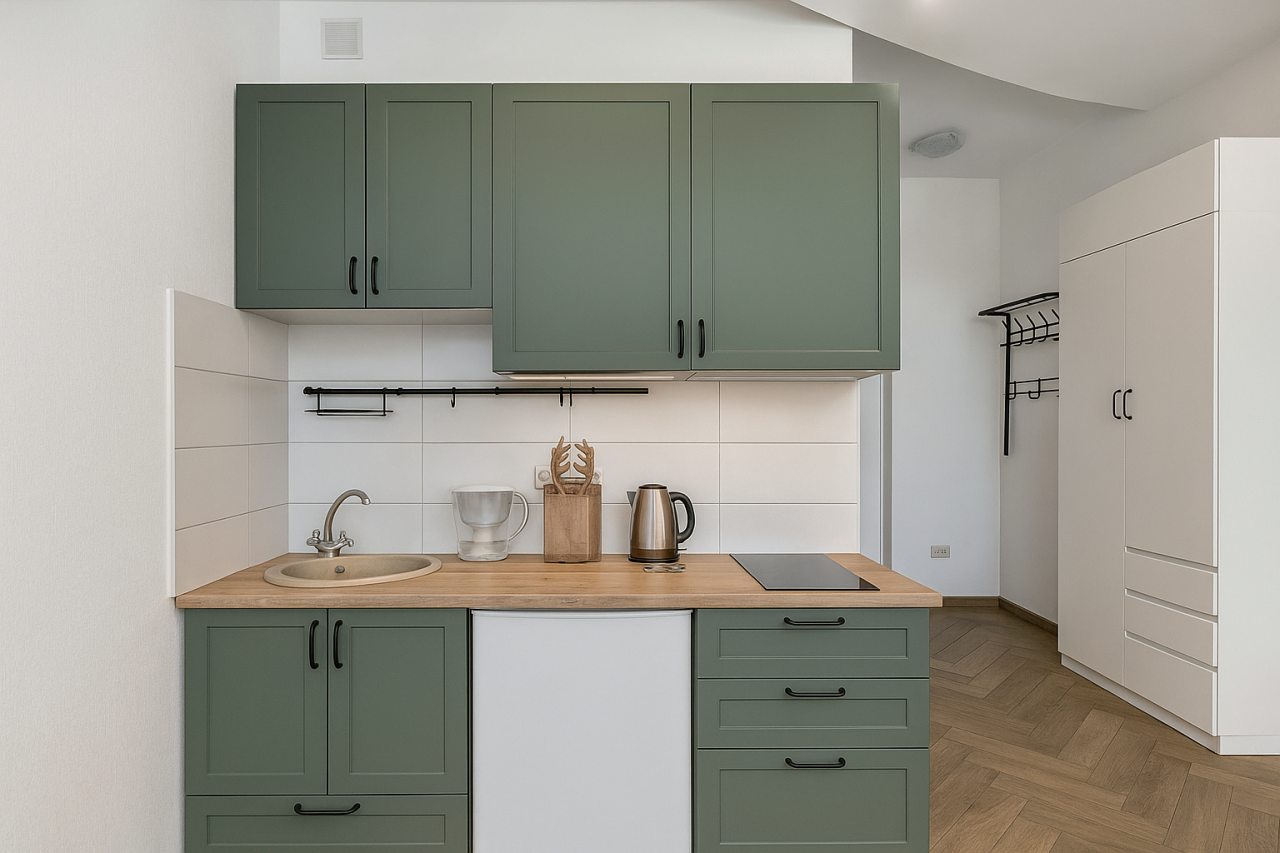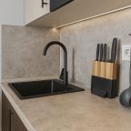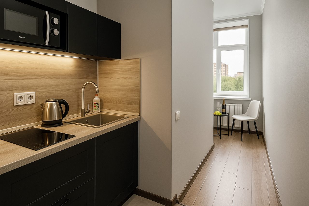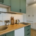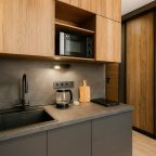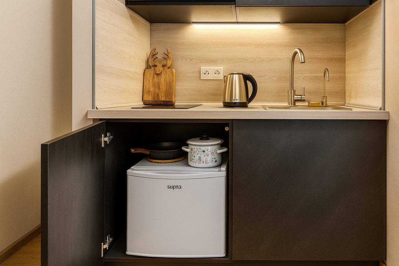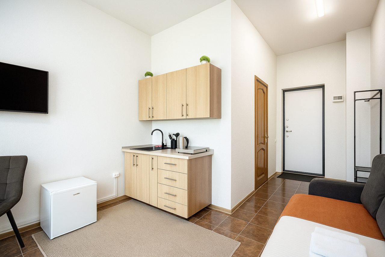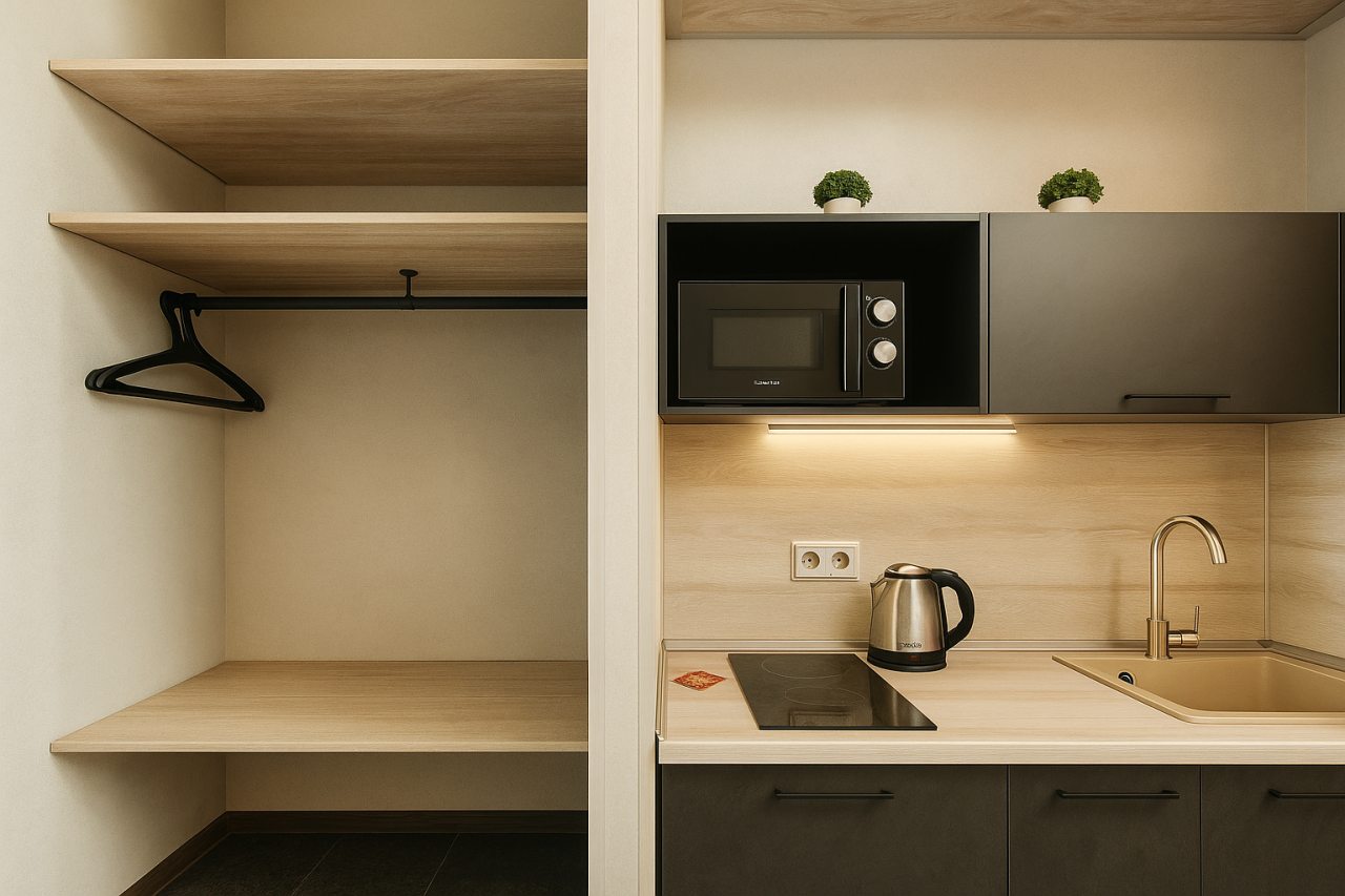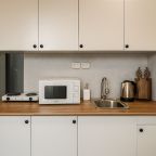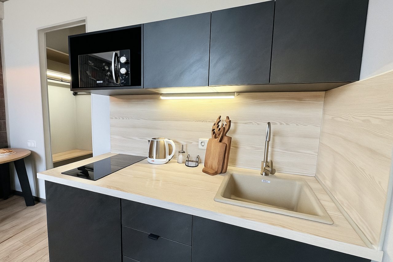 На небольшой кухонной зоне есть бытовой техникой, а также необходимый инвентарь для приготовления и разогревания пищи. Магазины продуктов, кафе и рестораны в пешей доступности.