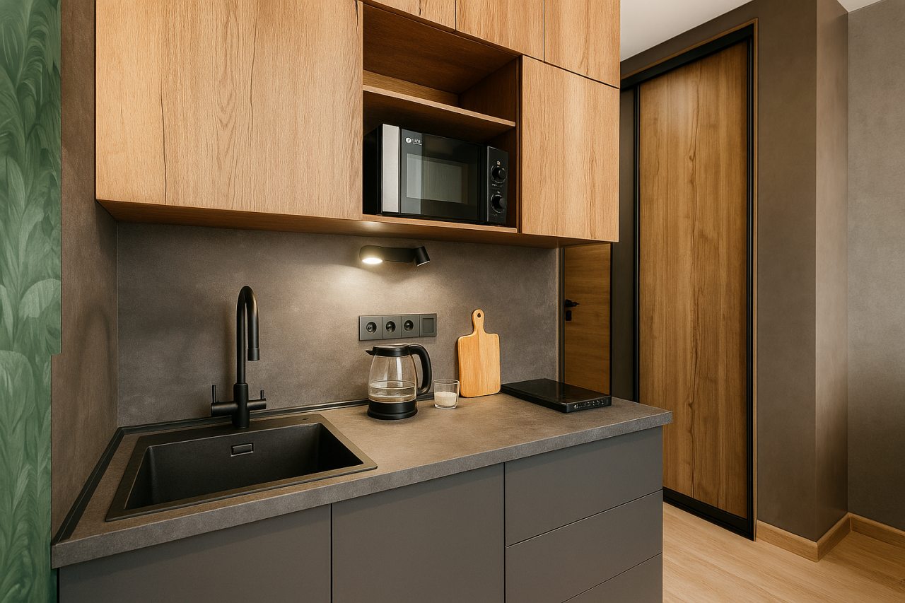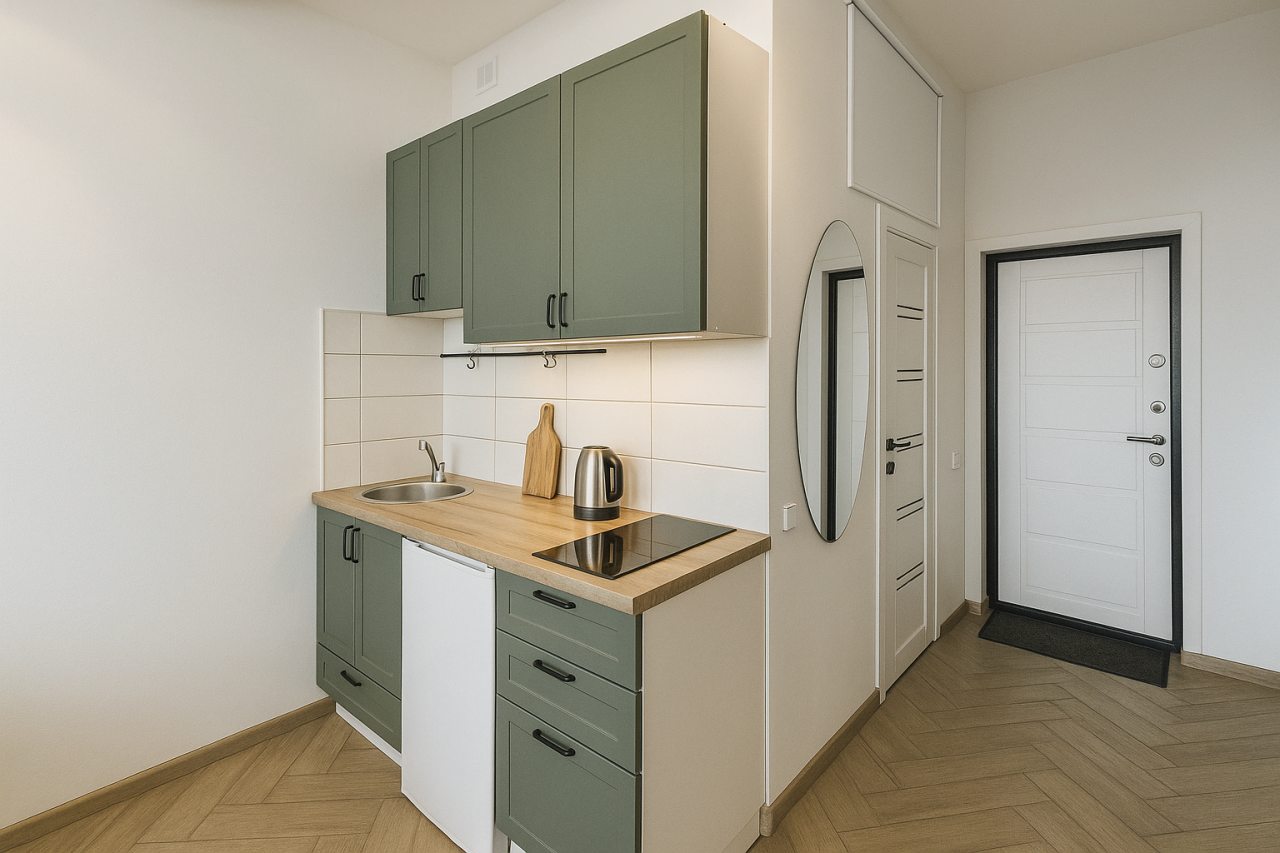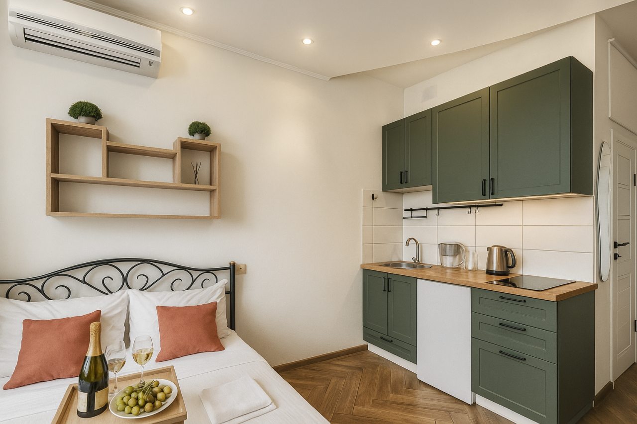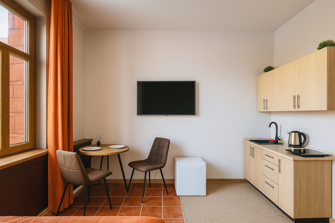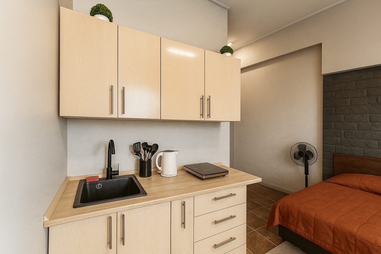 На небольшой кухонной зоне есть бытовой техникой, а также необходимый инвентарь для приготовления и разогревания пищи. Магазины продуктов, кафе и рестораны в пешей доступности.