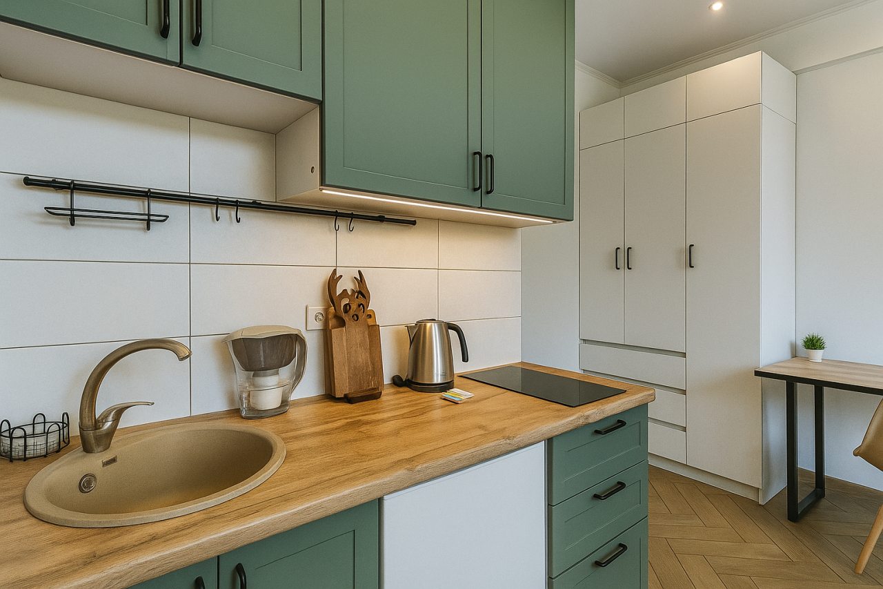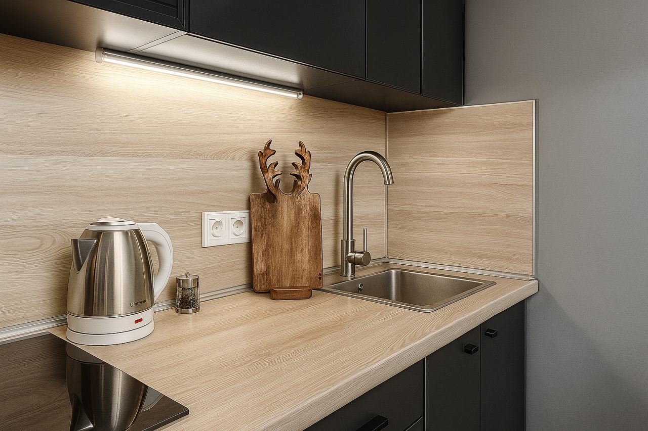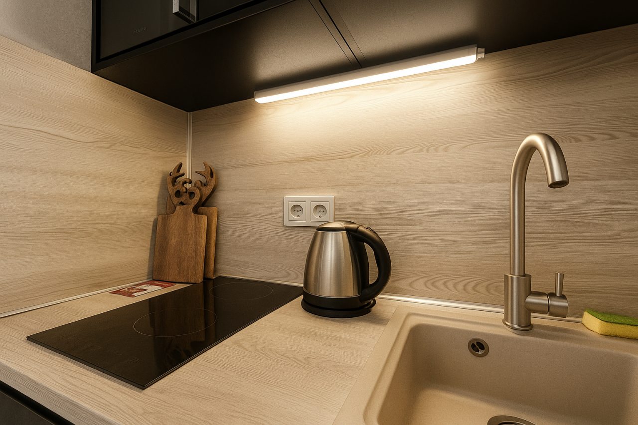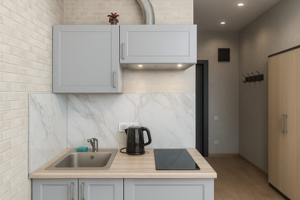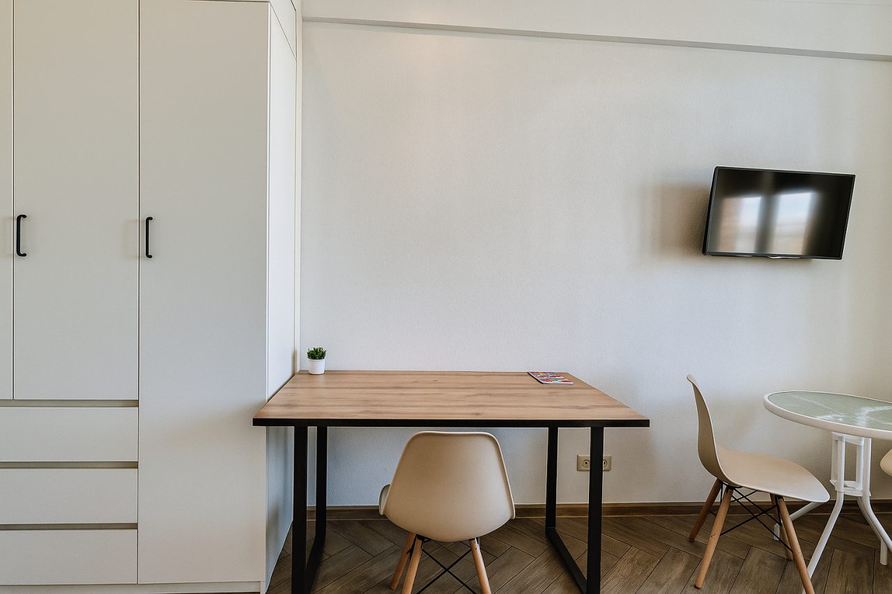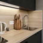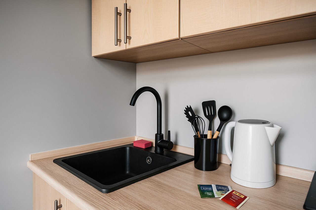 На небольшой кухонной зоне есть бытовой техникой, а также необходимый инвентарь для приготовления и разогревания пищи. Магазины продуктов, кафе и рестораны в пешей доступности.