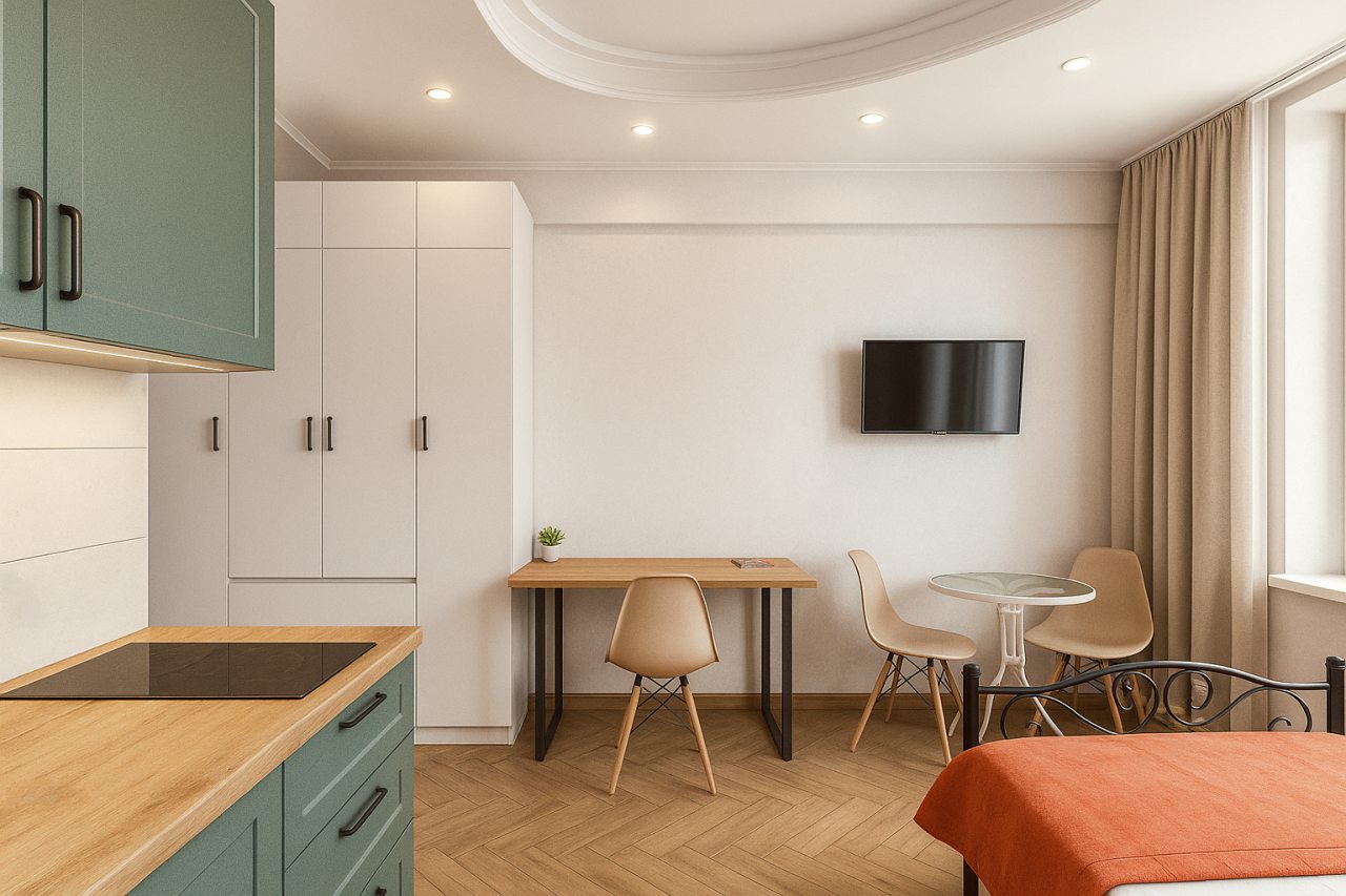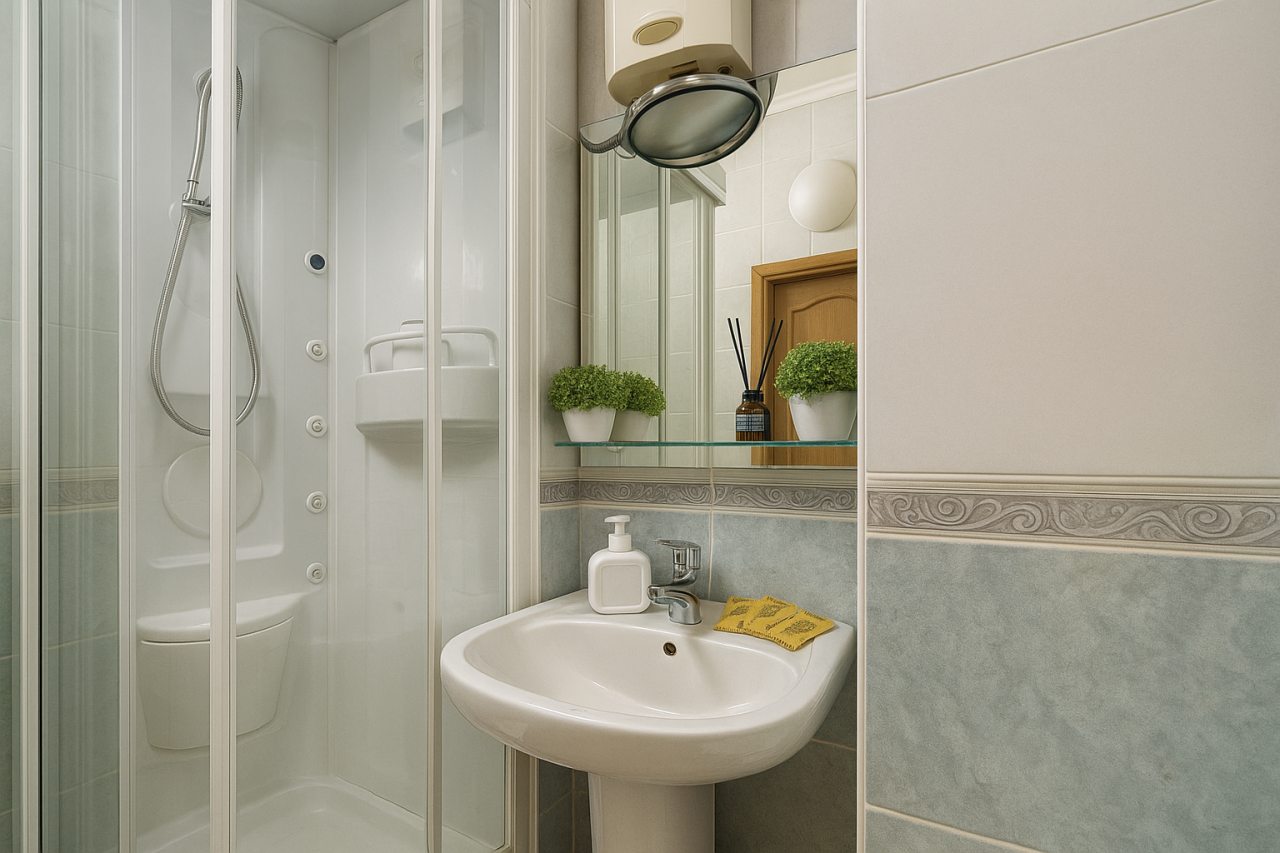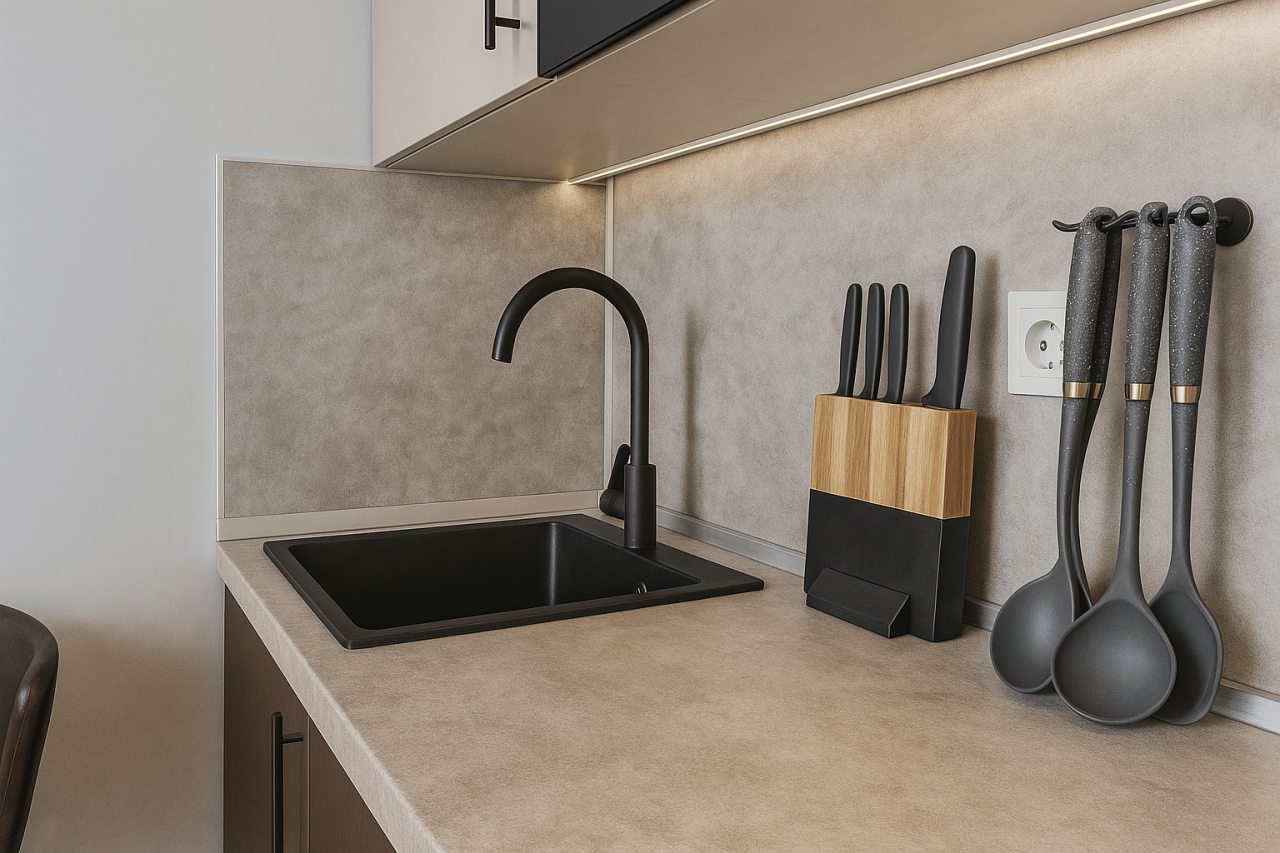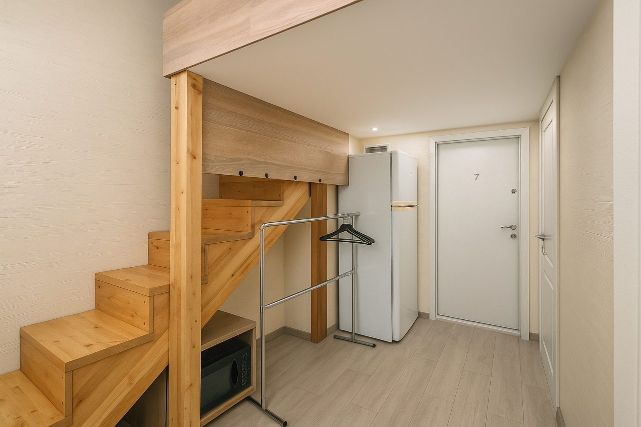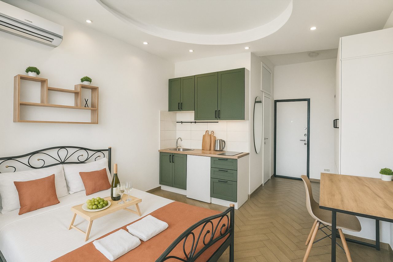 На небольшой кухонной зоне есть бытовой техникой, а также необходимый инвентарь для приготовления и разогревания пищи. Магазины продуктов, кафе и рестораны в пешей доступности.