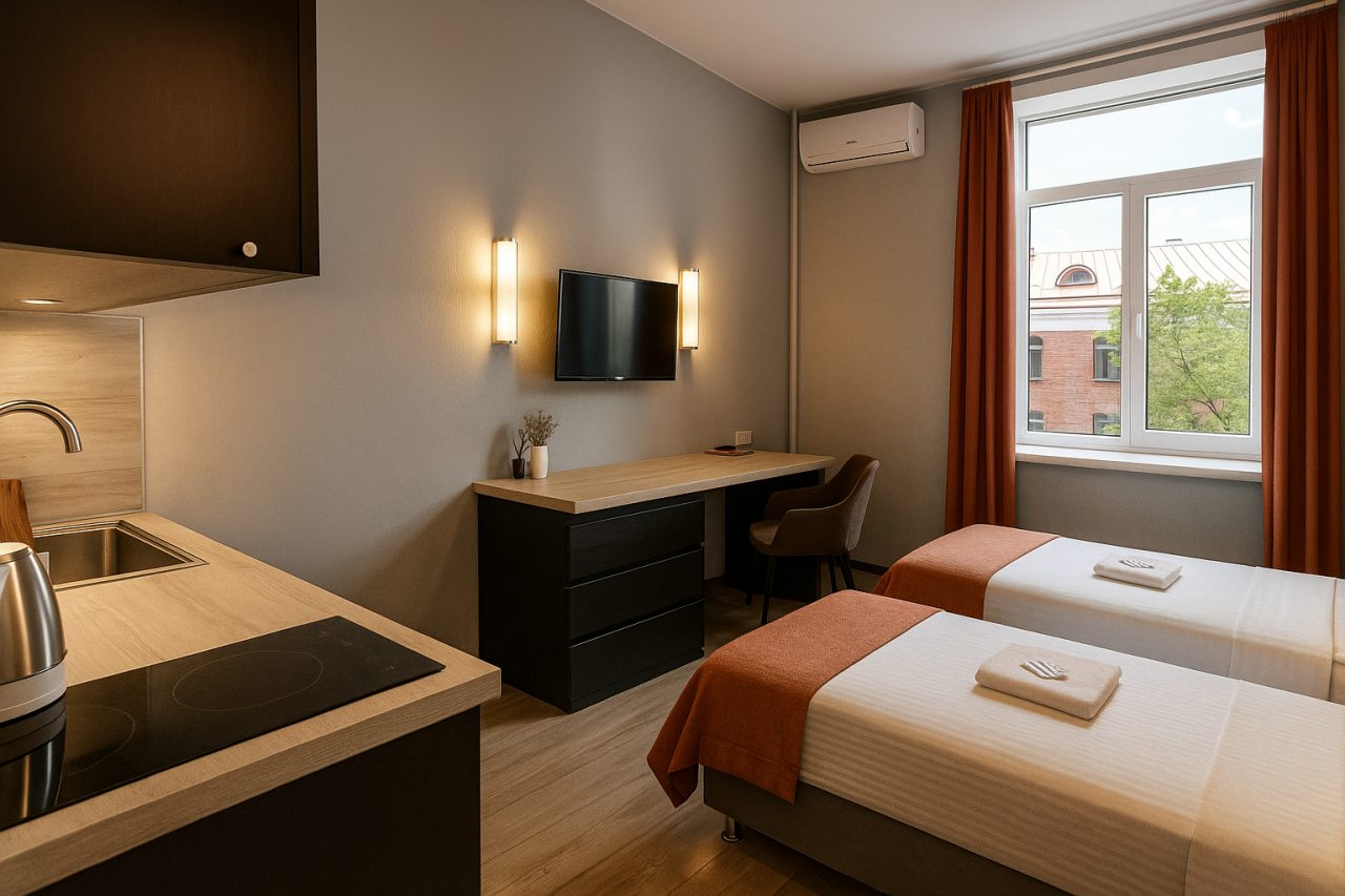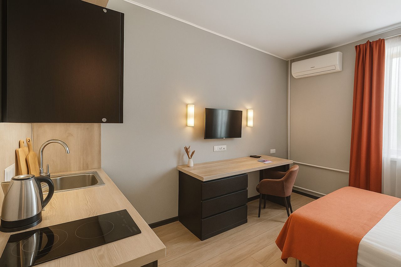 Удобное расположение : рядом метро ( за углом ) , автобусная остановка , несколько аптек и магазины. Вежливый администратор. Всегда на связи. Нужны были нитки - дали, попросили удлинитель - дали. В целом очень бюджетно и прилично. Есть куллер с питьевой водой. В номере полотенца, посуда , чай , Сахар , мыло гель для душа, шампунь. Так же есть кондиционер - на теплое время года супер как спасает. Спать и находиться в номере комфортно.
