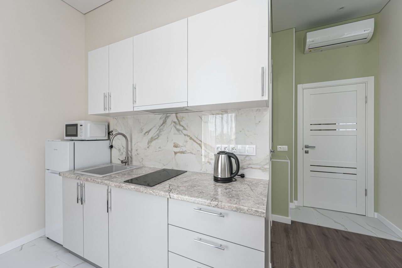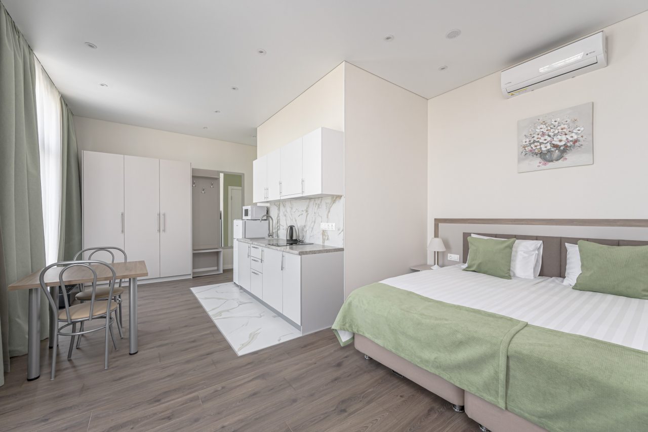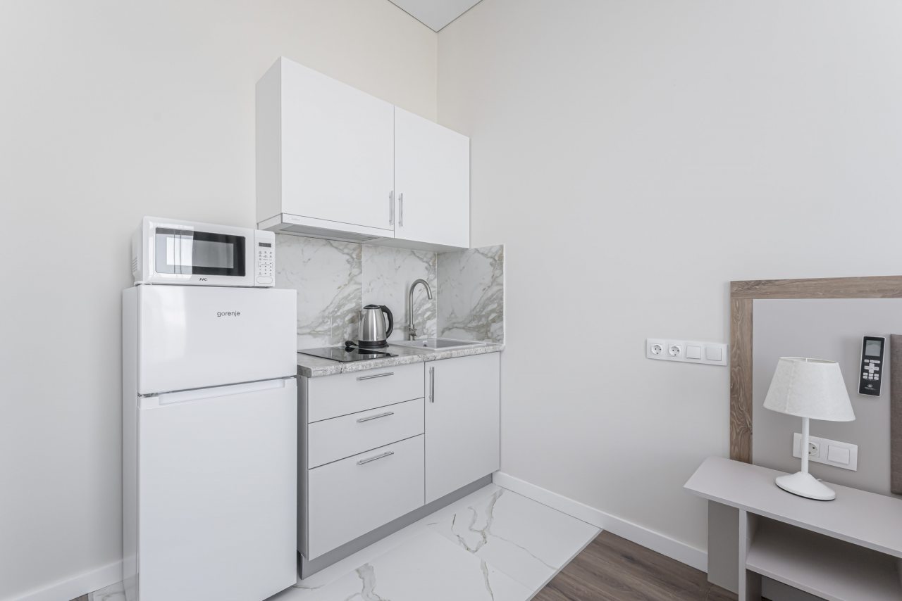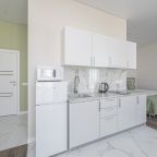 Кухонная зона оснащена варочной панелью, чайником, микроволновой печью и обеденной зоной, чтобы вы могли порадовать себя приготовлением любимой еды в любое время. В некоторых номерах также имеется духовой шкаф.
