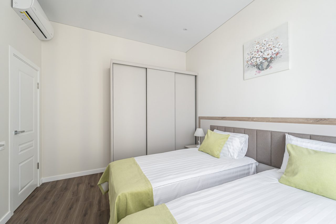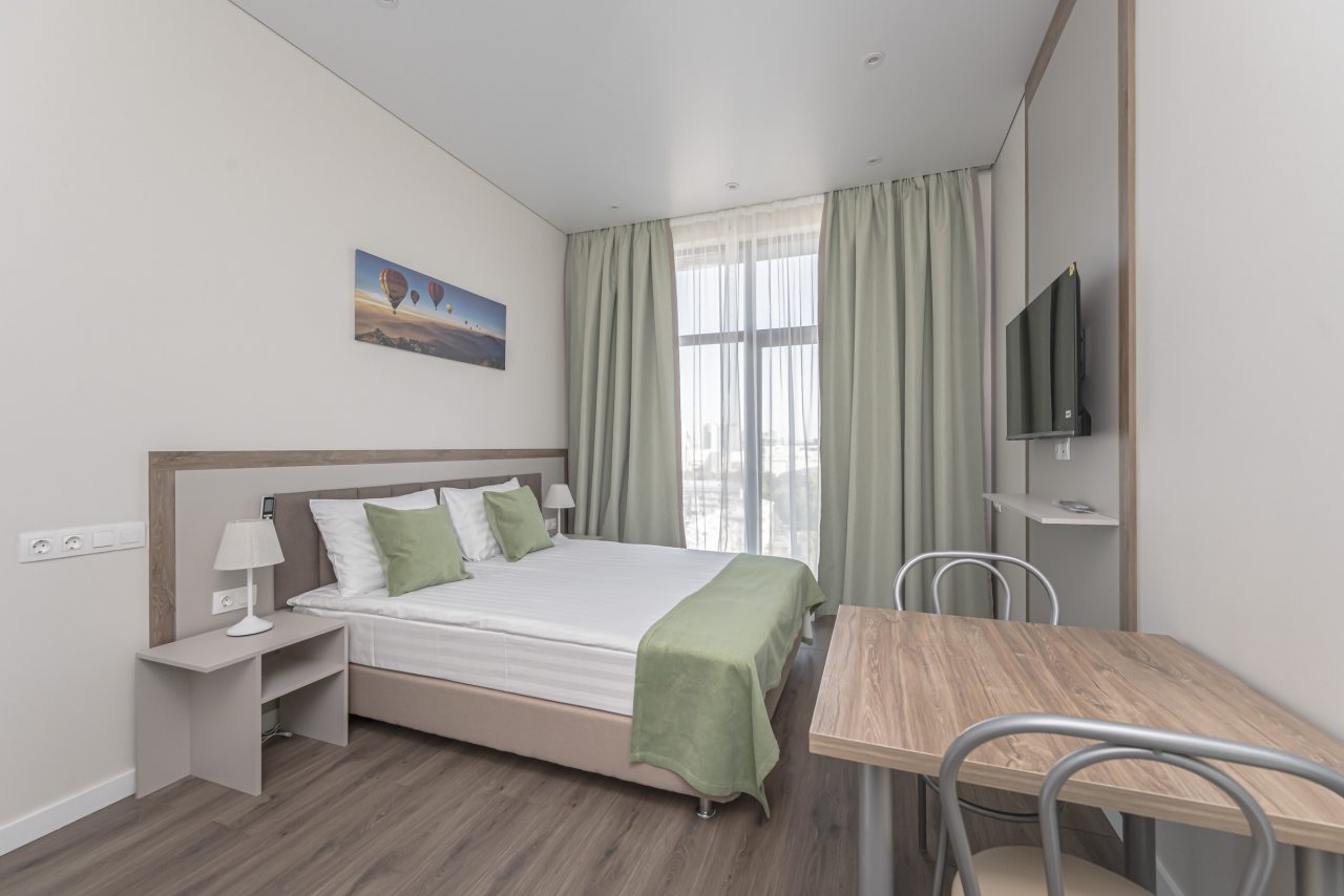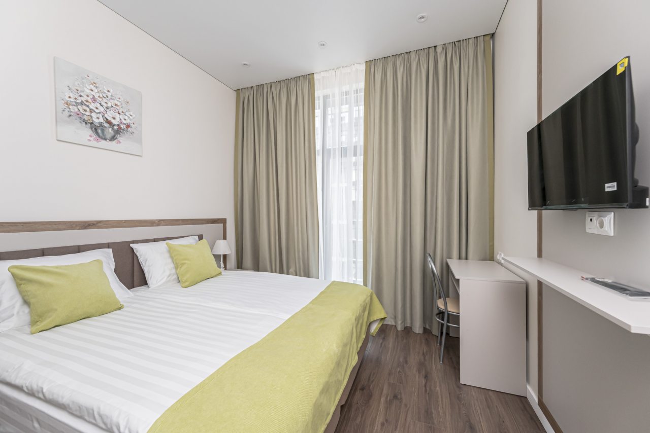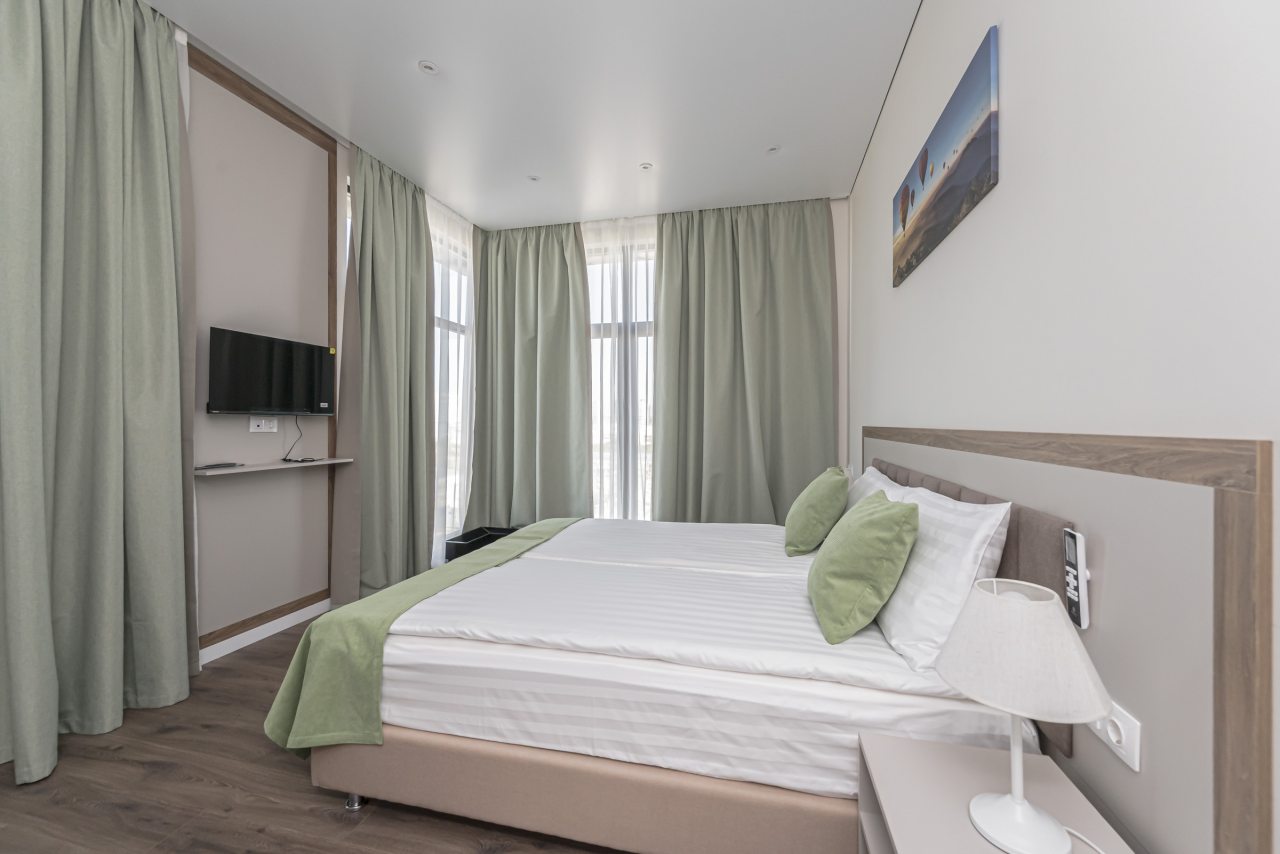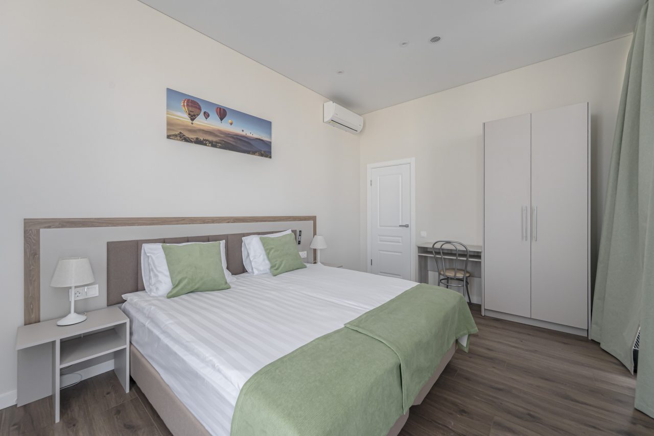 К выбору предлагаются различные по площади и вместимости номера, которые укомплектованы всем необходимым для отдыха и проживания, включая кровать с удобным матрасом, прикроватные светильники и розетки для дополнительного удобства, кондиционер, шкаф, телевизор, а также собственный санузел с набором полотенец, гигиенических средств и стиральной машиной.