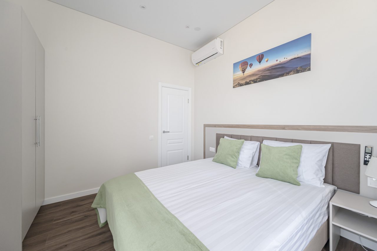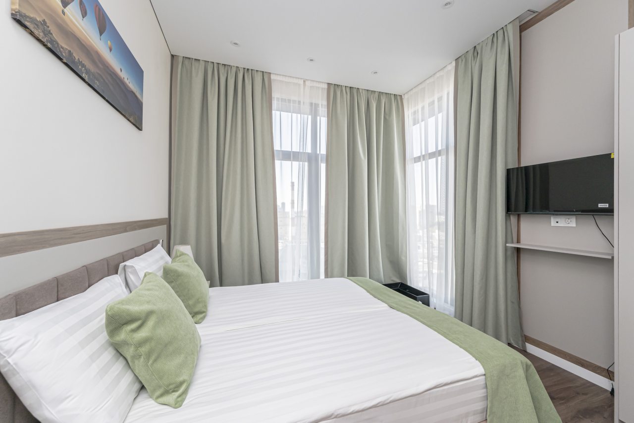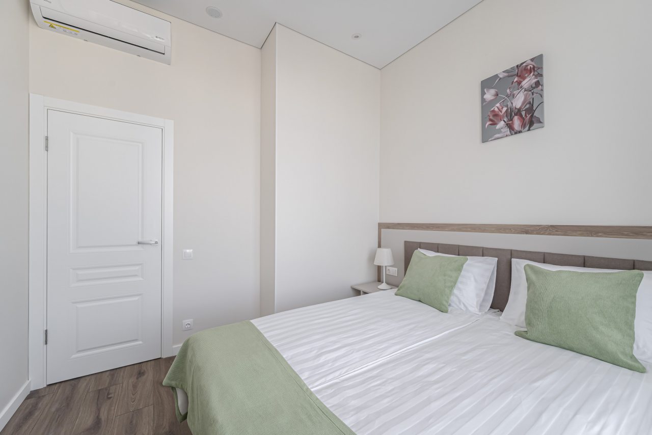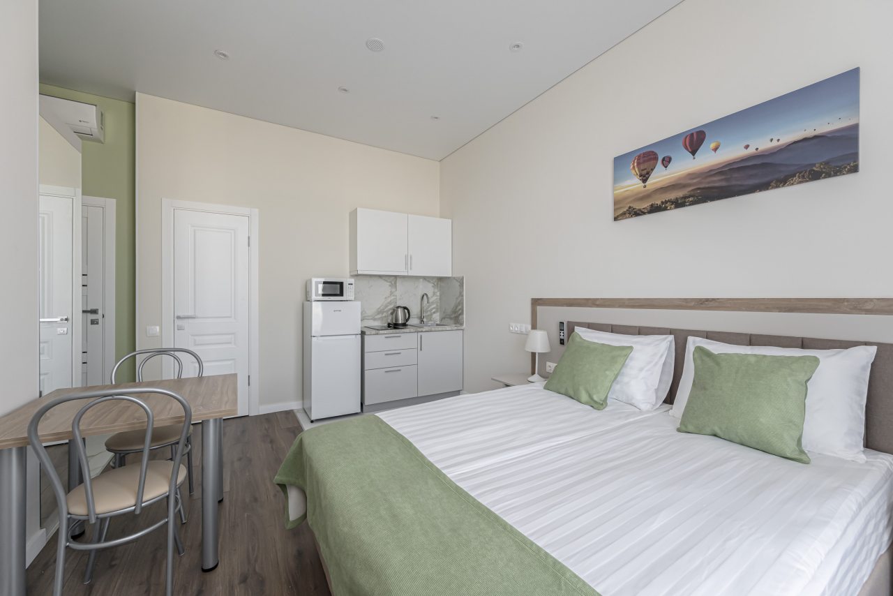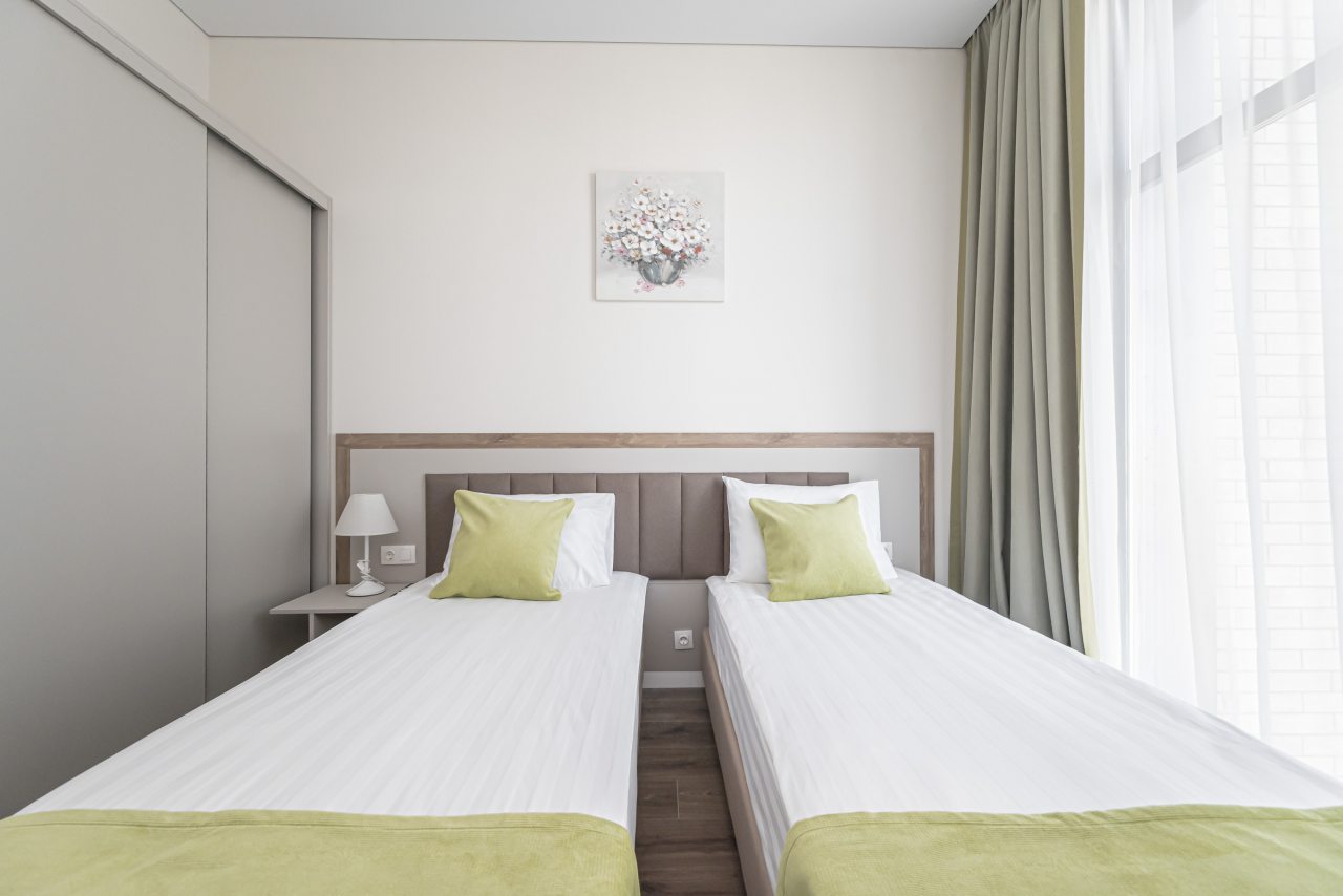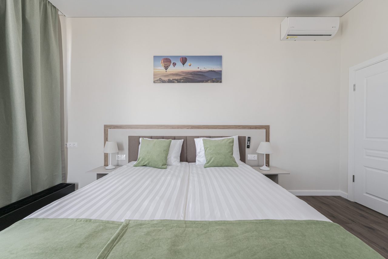 К выбору предлагаются различные по площади и вместимости номера, которые укомплектованы всем необходимым для отдыха и проживания, включая кровать с удобным матрасом, прикроватные светильники и розетки для дополнительного удобства, кондиционер, шкаф, телевизор, а также собственный санузел с набором полотенец, гигиенических средств и стиральной машиной.