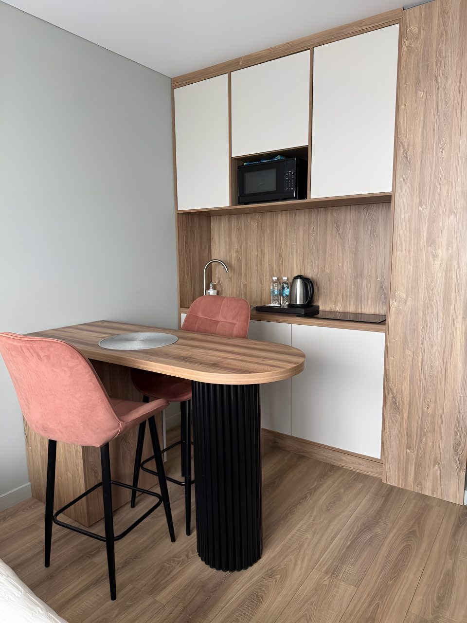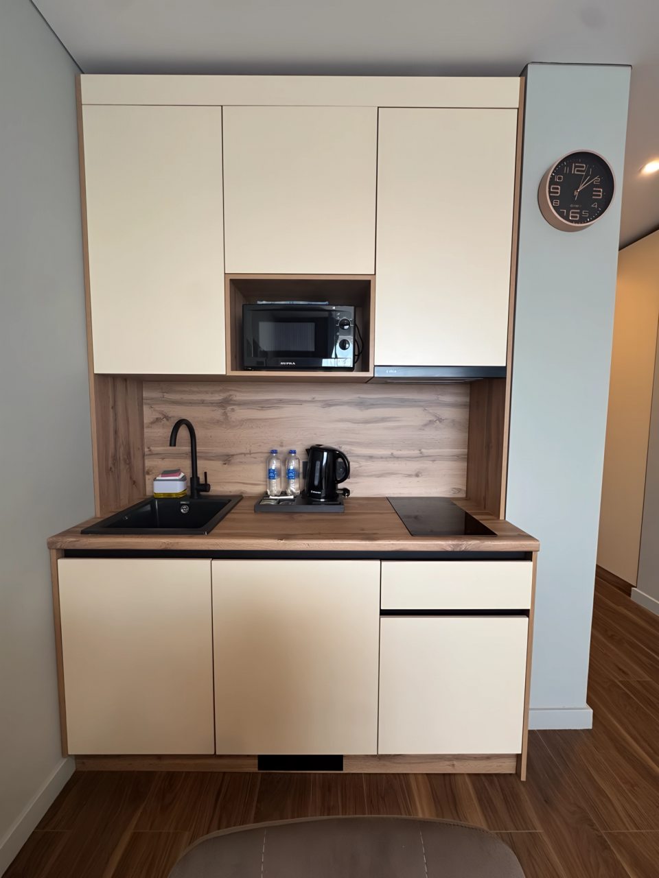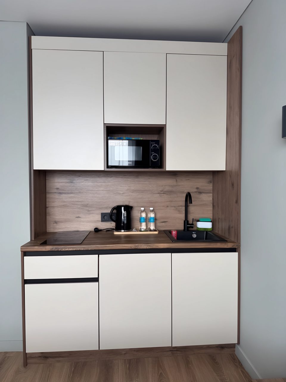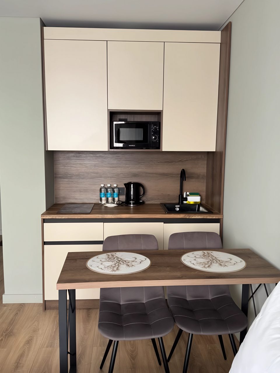 Внутри имеется небольшая кухонная зона с обеденным столом, чайником, плитой и микроволновой печью. В этом же жилом комплексе находятся рестораны и кафе.
