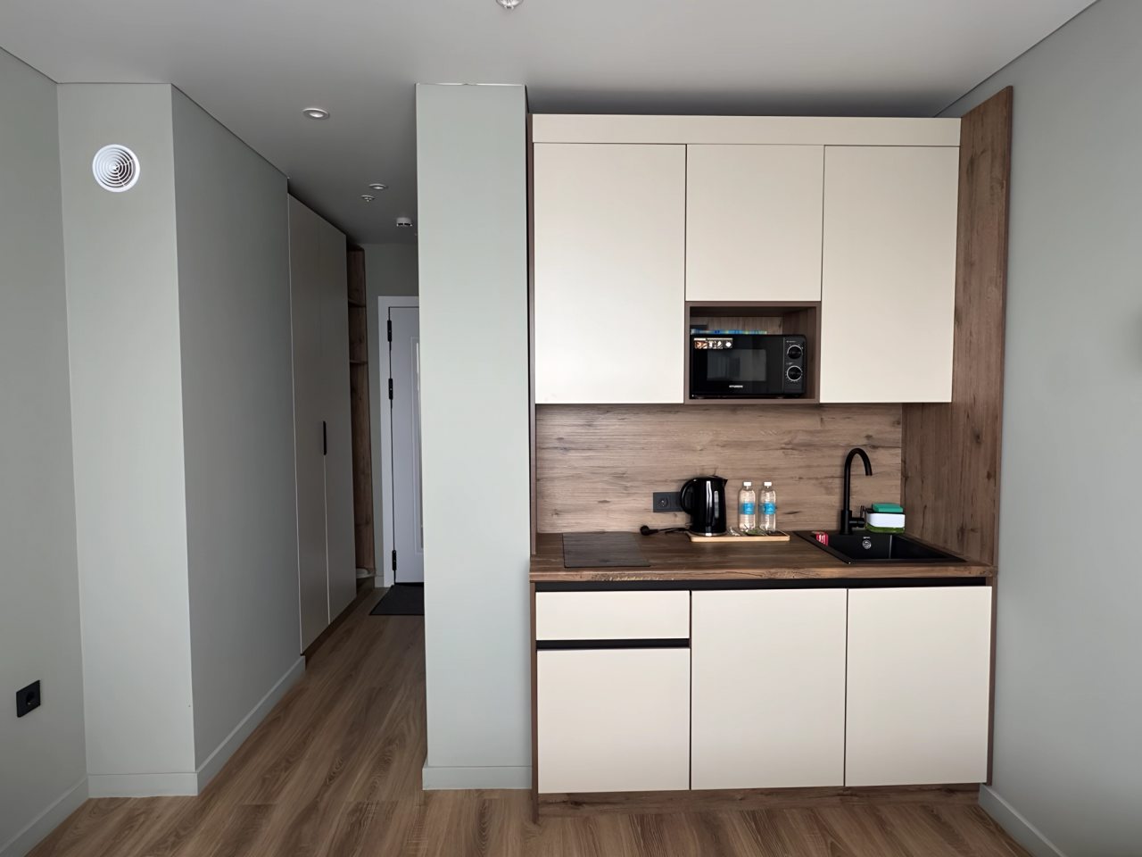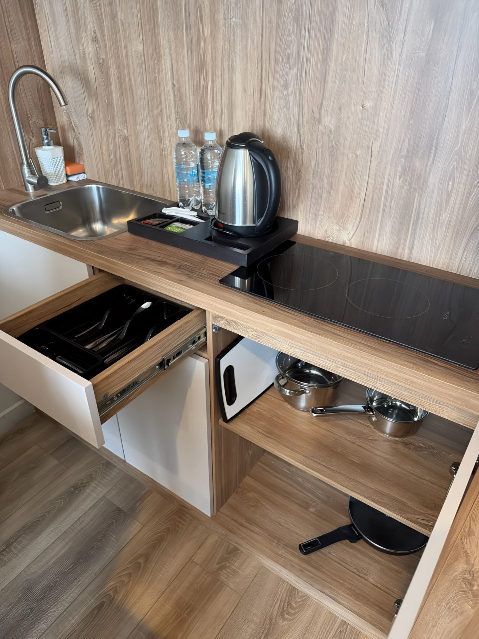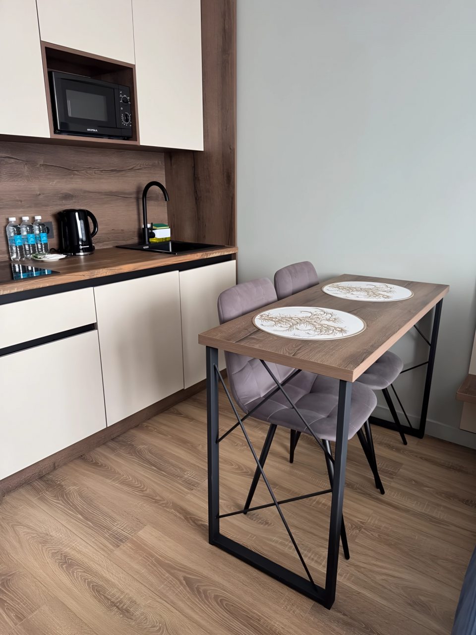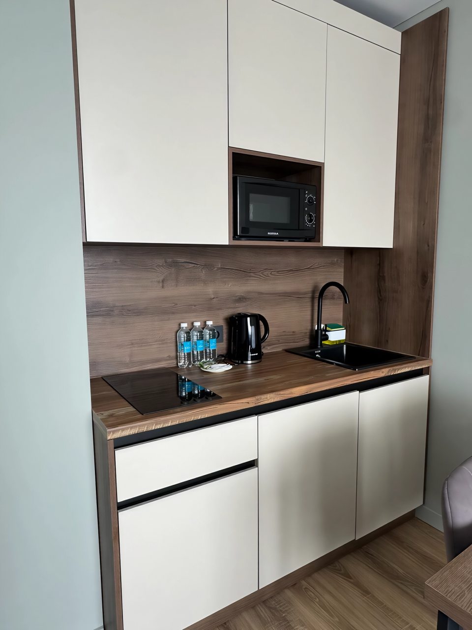 Внутри имеется небольшая кухонная зона с обеденным столом, чайником, плитой и микроволновой печью. В этом же жилом комплексе находятся рестораны и кафе.