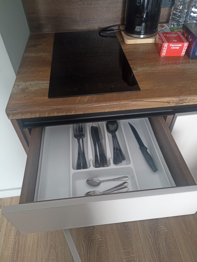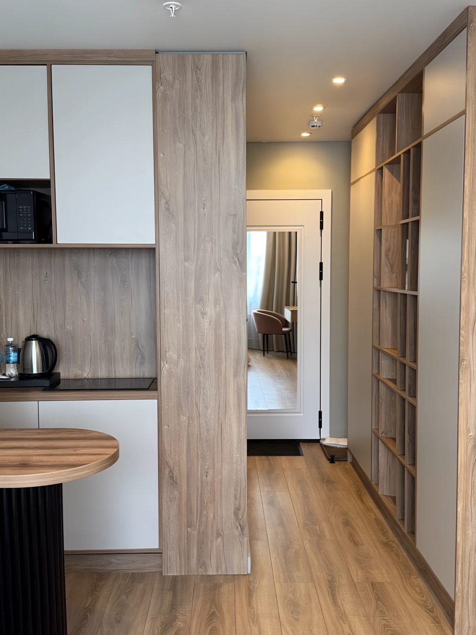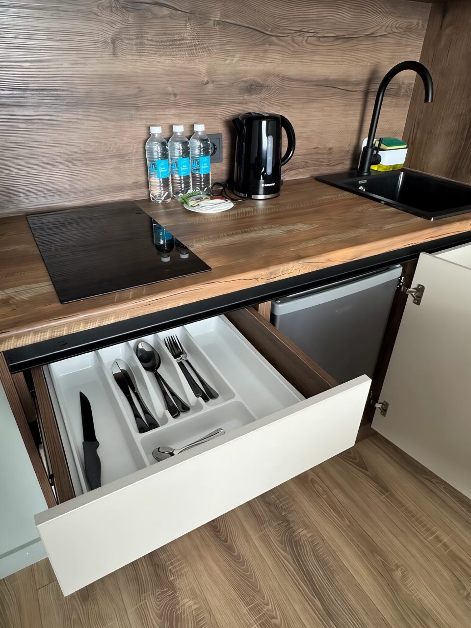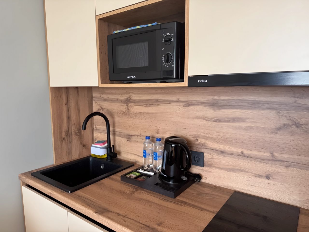 Внутри имеется небольшая кухонная зона с обеденным столом, чайником, плитой и микроволновой печью. В этом же жилом комплексе находятся рестораны и кафе.