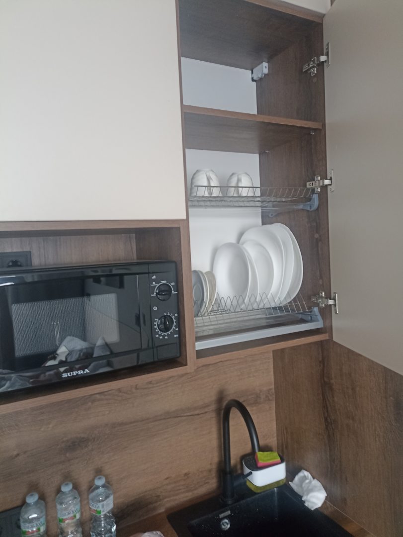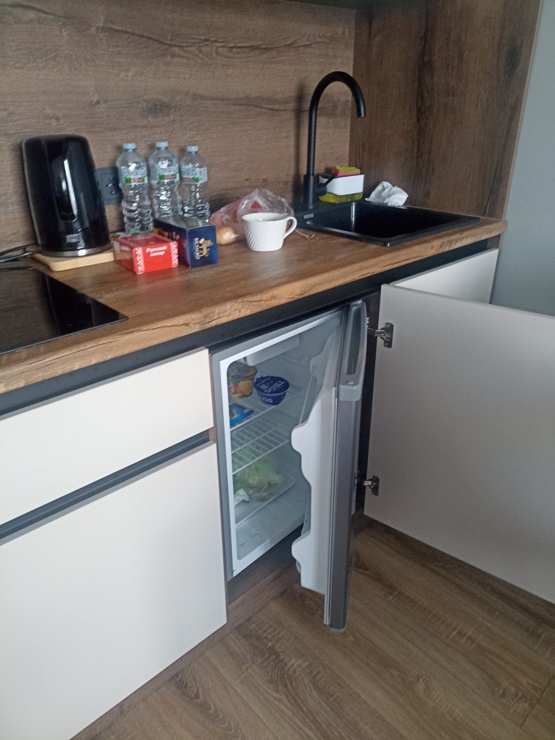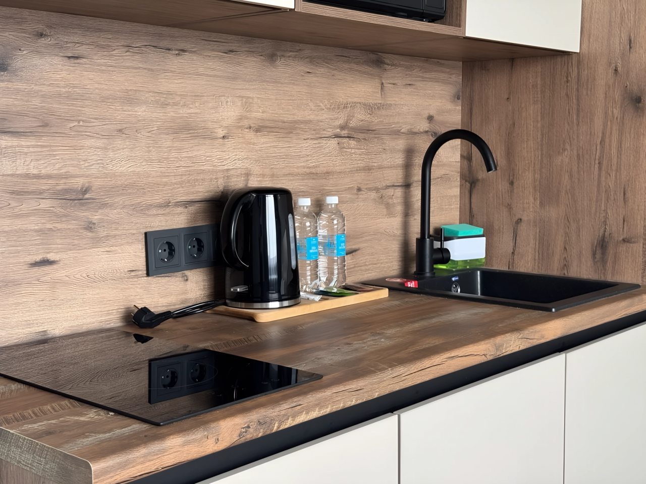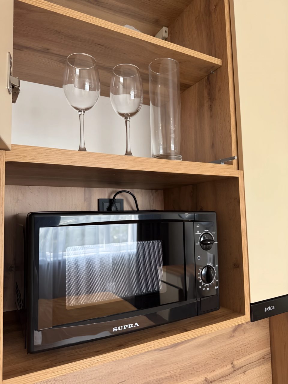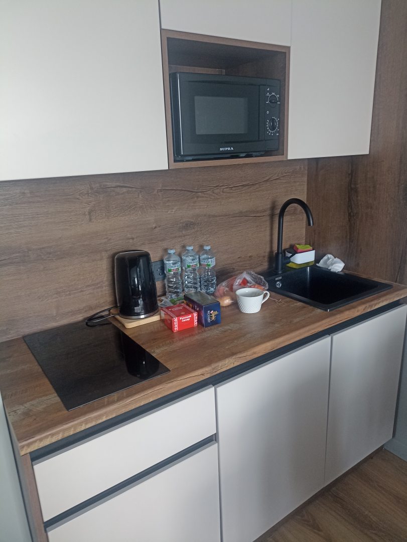 Внутри имеется небольшая кухонная зона с обеденным столом, чайником, плитой и микроволновой печью. В этом же жилом комплексе находятся рестораны и кафе.
