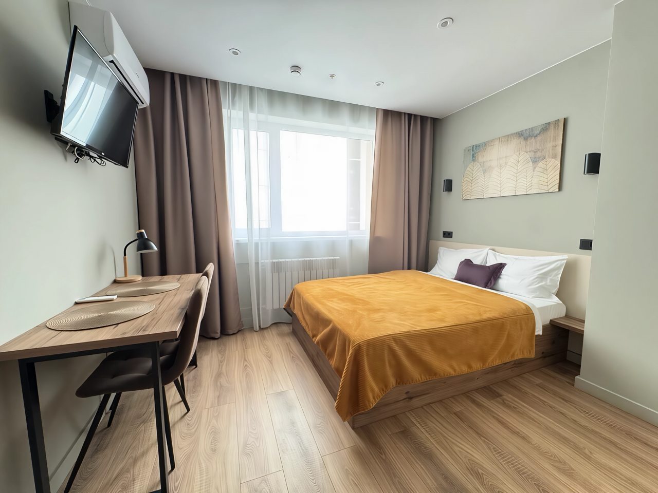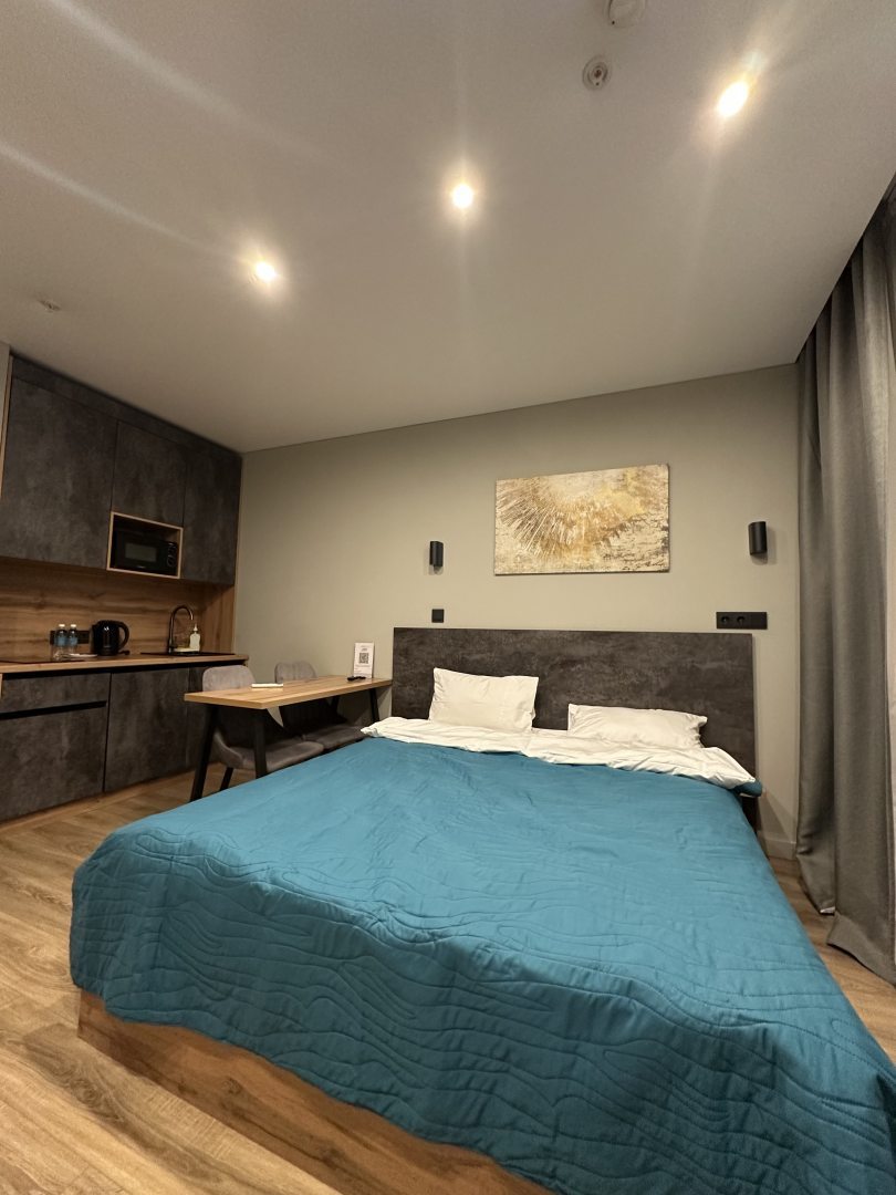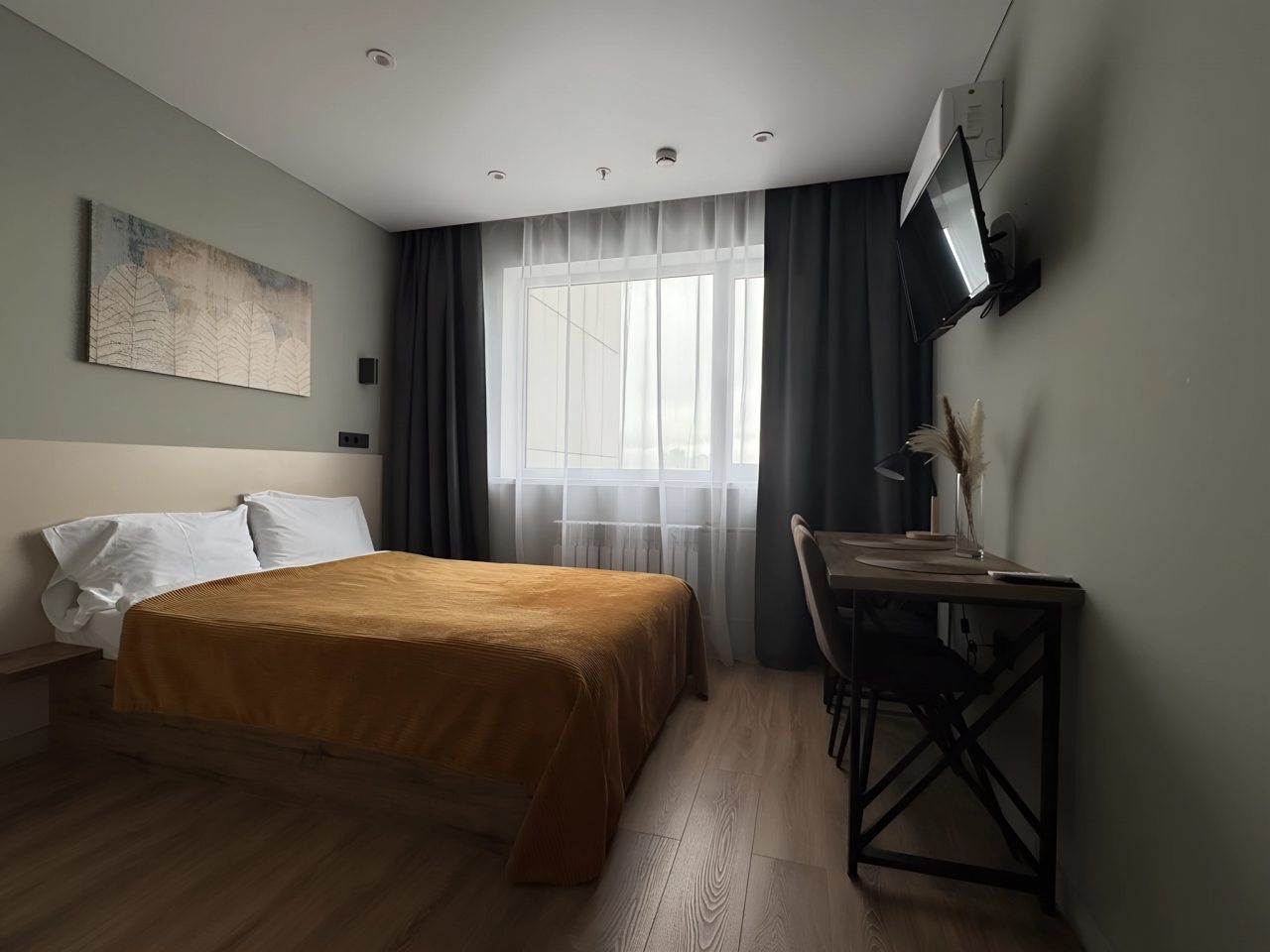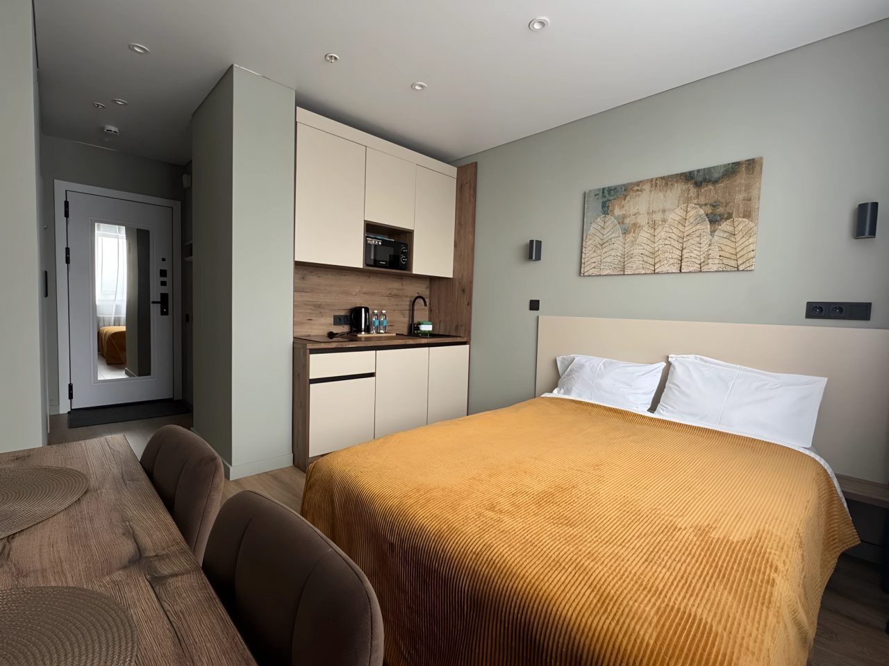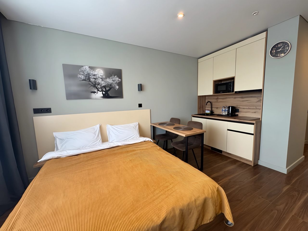 В просторных апартаментах с ремонтом в светлых тонах есть все для комфортного проживания: большая кровать, прикроватная тумба, телевизор, прихожая и собственная ванная комната с душевой кабиной.