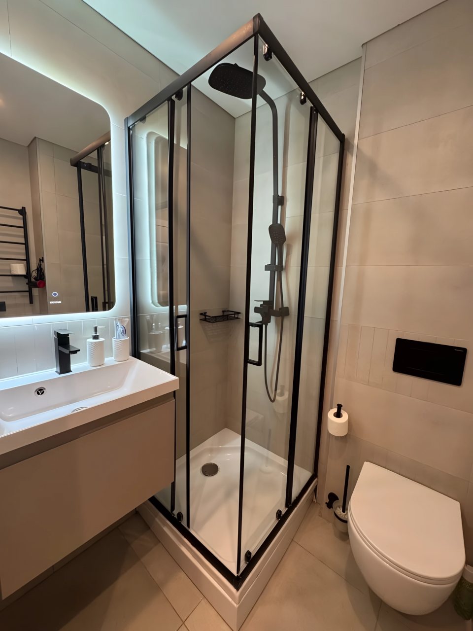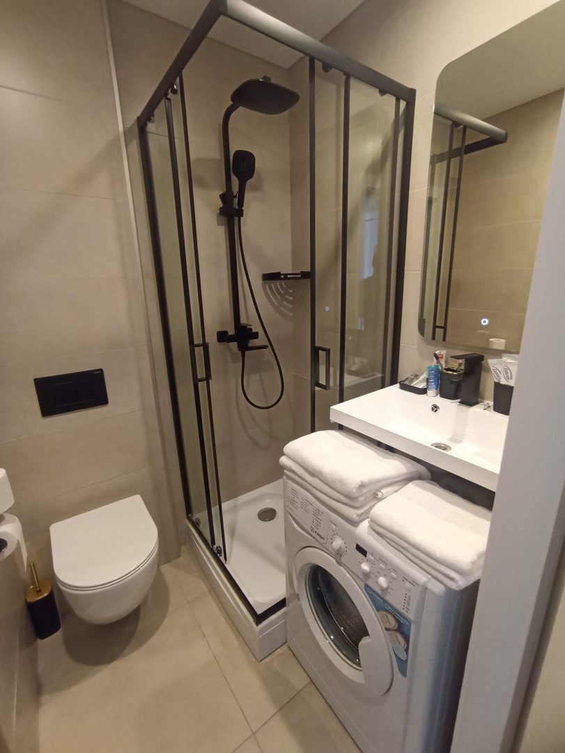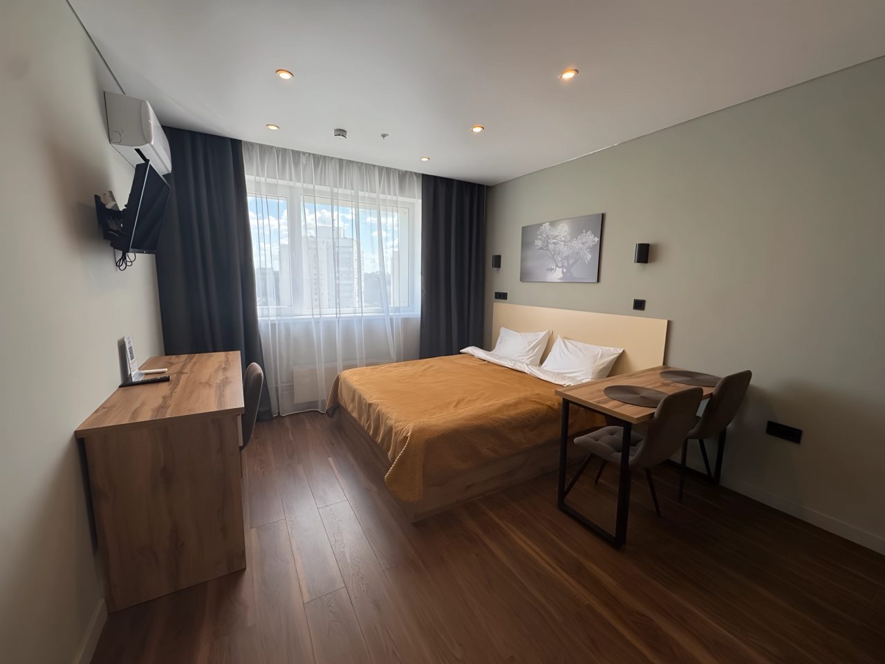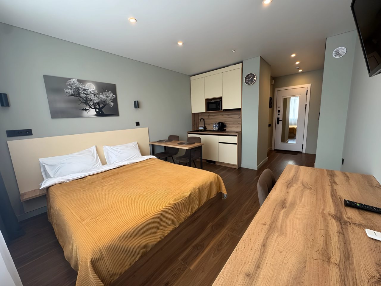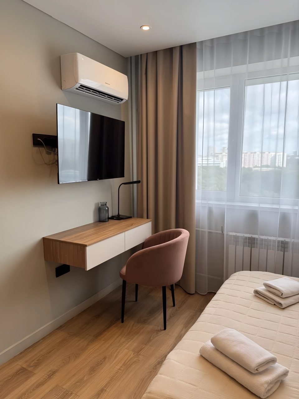 В просторных апартаментах с ремонтом в светлых тонах есть все для комфортного проживания: большая кровать, прикроватная тумба, телевизор, прихожая и собственная ванная комната с душевой кабиной.