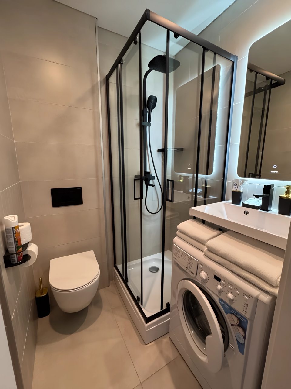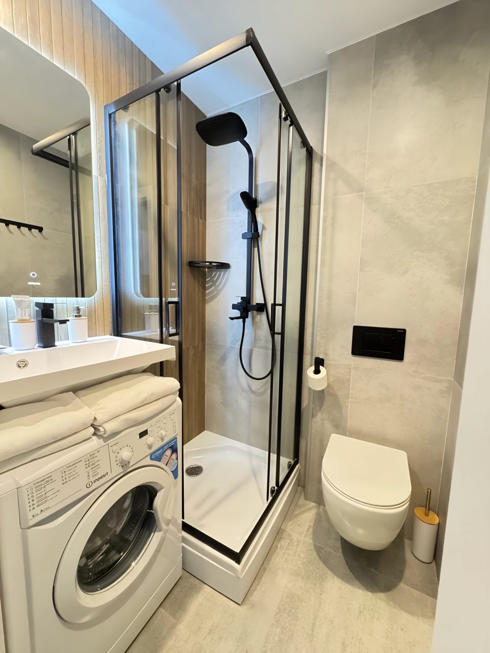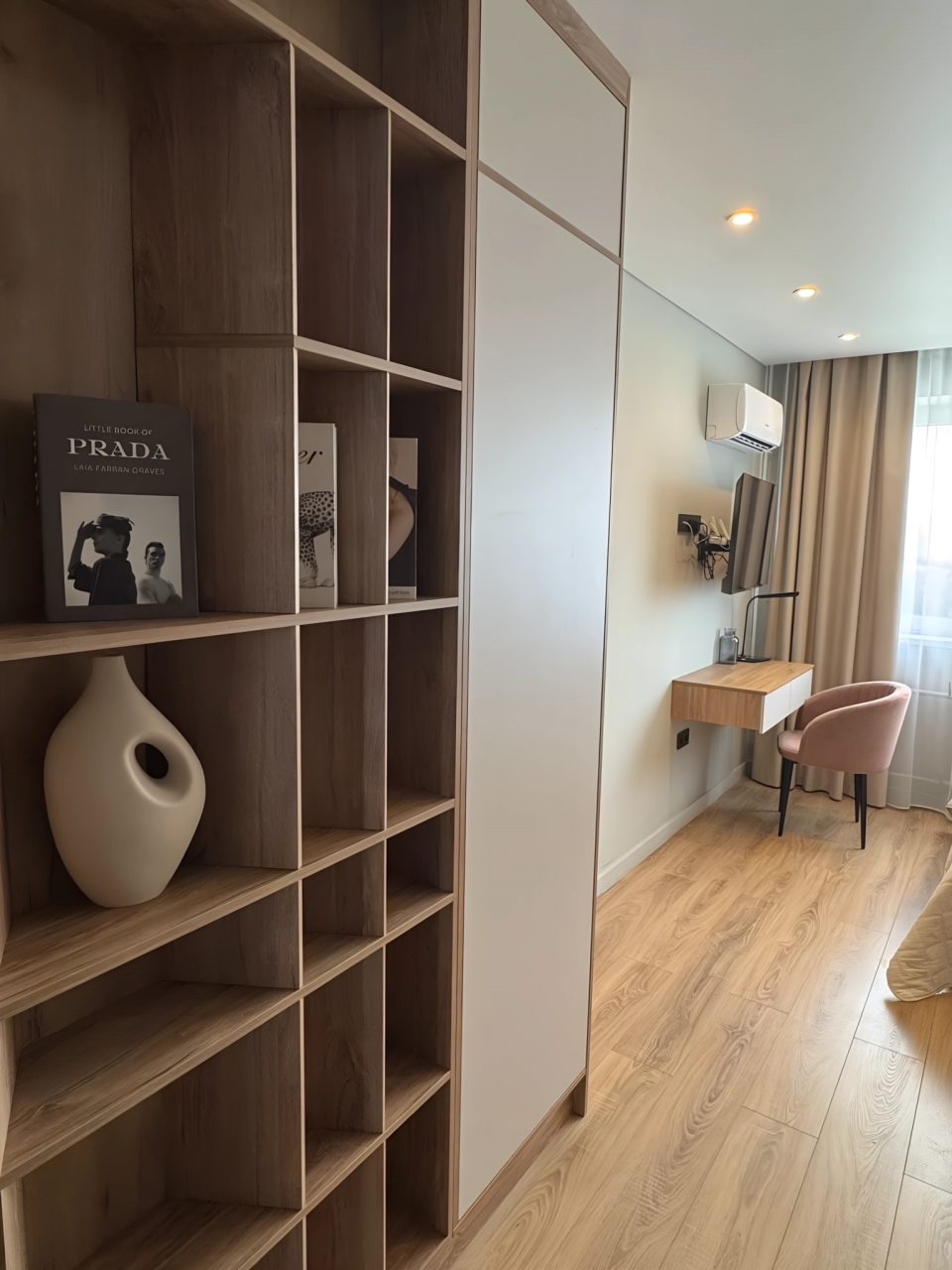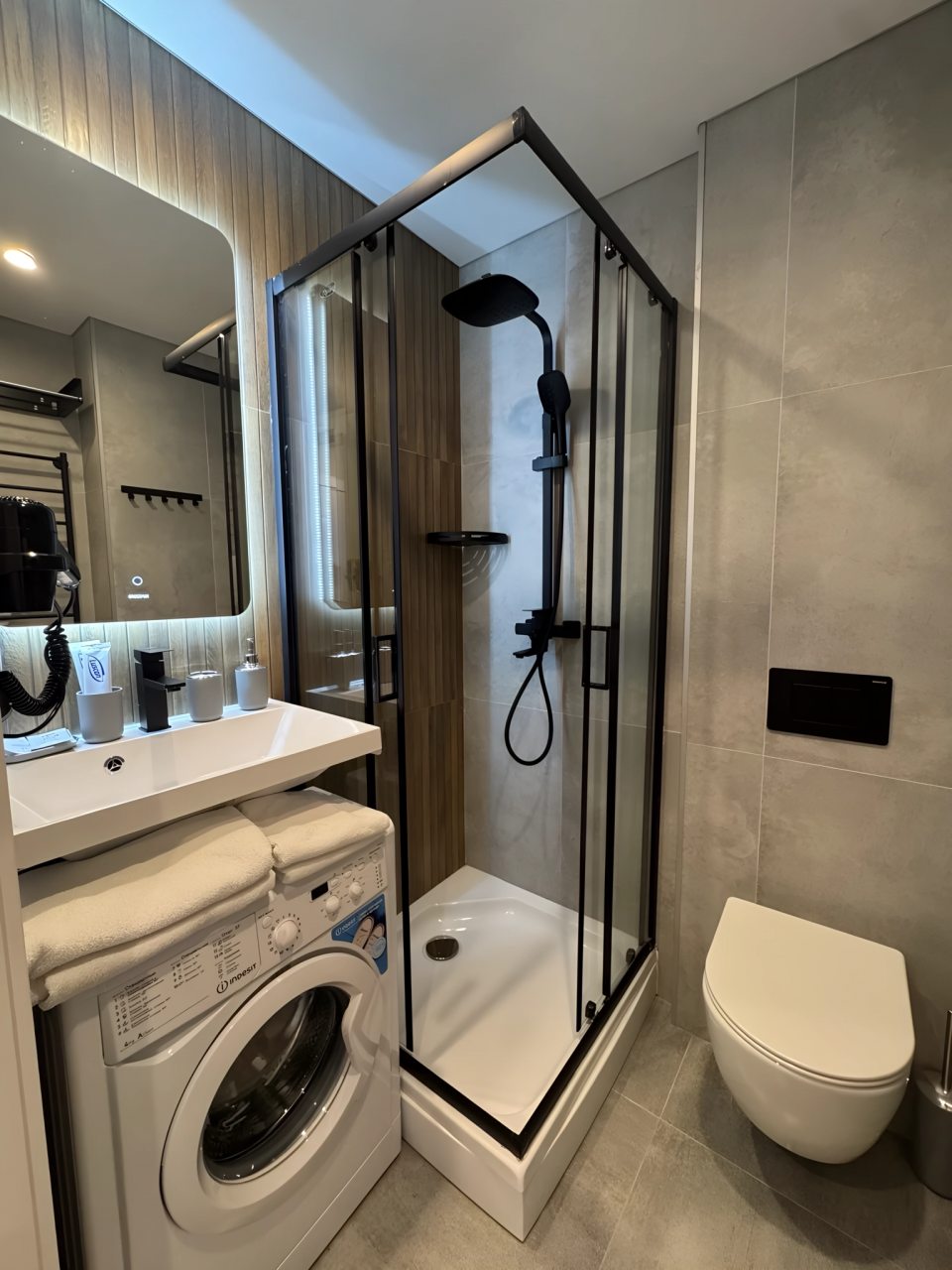 В просторных апартаментах с ремонтом в светлых тонах есть все для комфортного проживания: большая кровать, прикроватная тумба, телевизор, прихожая и собственная ванная комната с душевой кабиной.