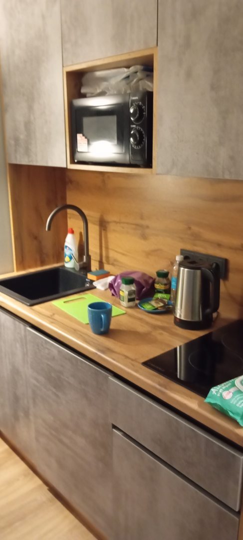 Из недостатков: пожелания: на мини кухне не хватает разделочной доски и небольшого полотенца для рук.