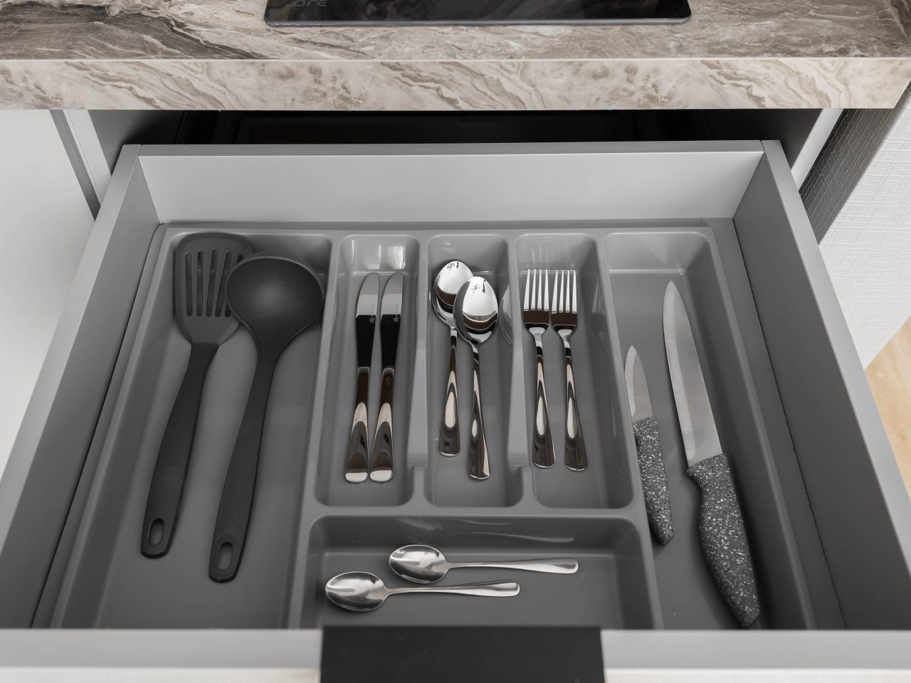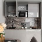 Кухня оснащена всем необходимым для приготовления еды и напитков, в том числе: индукционная плита, СВЧ, посуда, столовые приборы, чайник, обеденный стол и стулья.