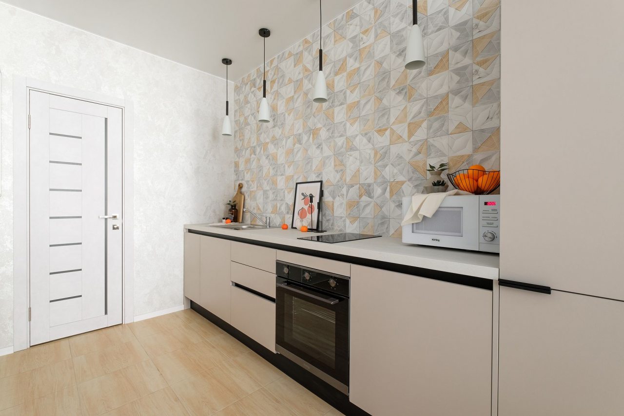 Современная кухня, оборудованная электроплитой, духовым шкафом, микроволновкой и посудой, создает комфортные условия для готовки и приема пищи, где также всегда можно найти чай и кофе.