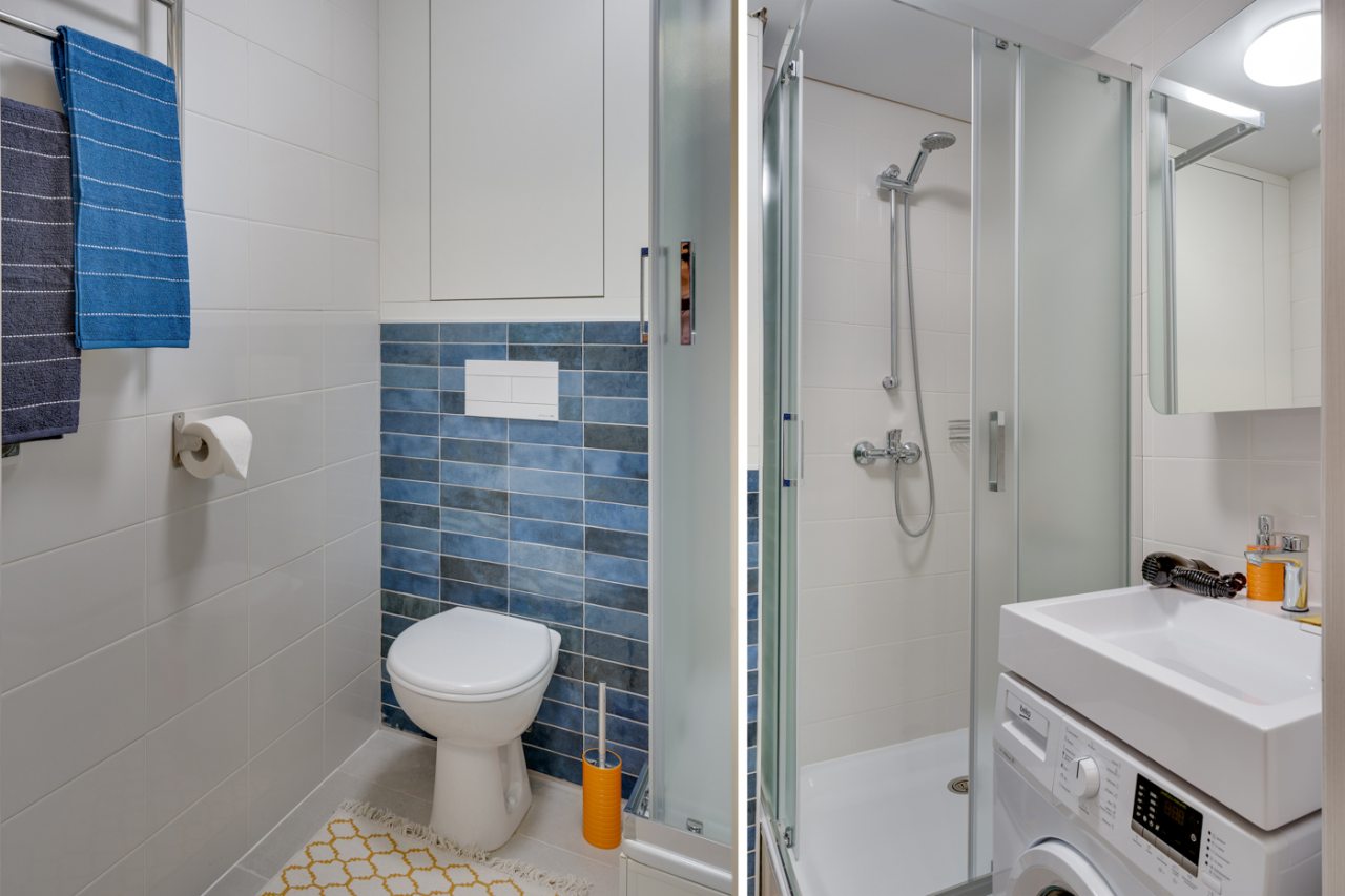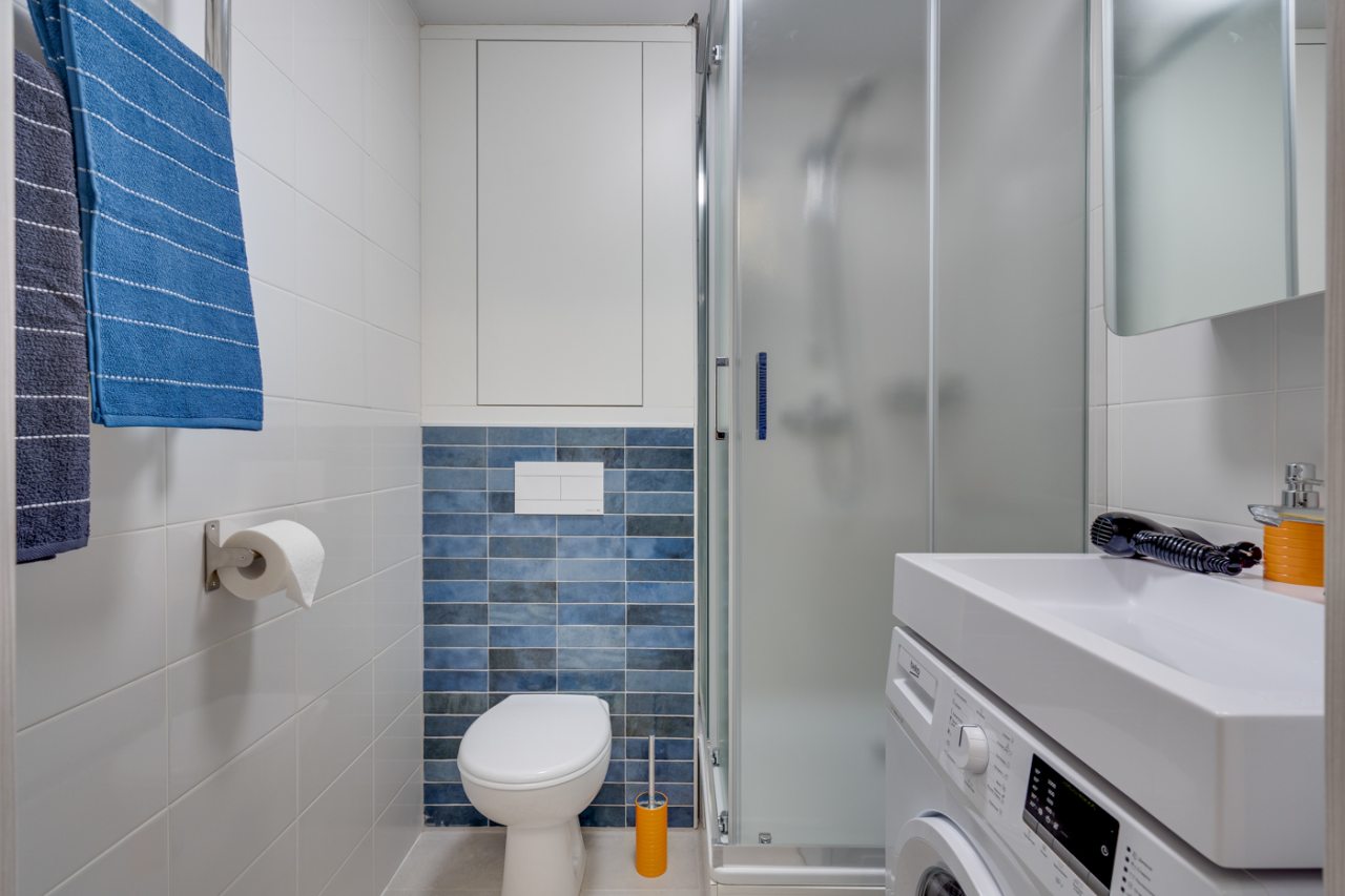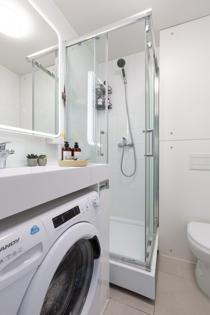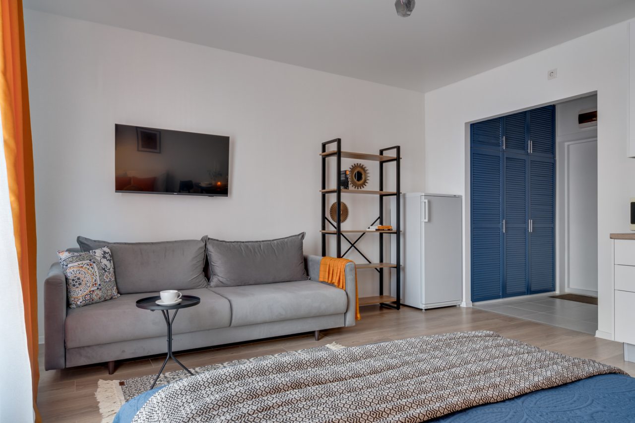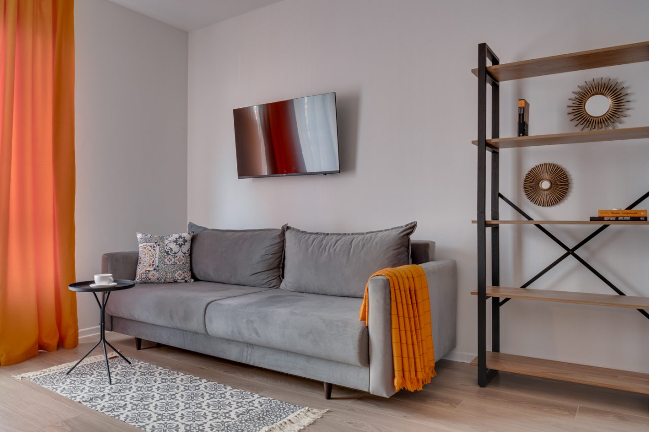 Апартаменты выполнены в современном стиле и готовы к размещению гостей. Для комфортного пребывания имеется: кровать с набором постельного белья, диван с мягкими подушками, телевизор, зоны для хранения вещей, обеденный стол. В санузле установлена стиральная машина и душевая кабина.