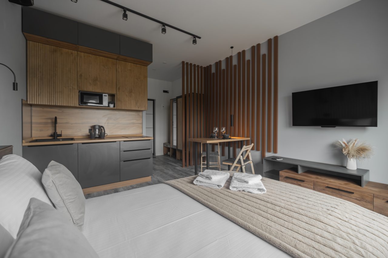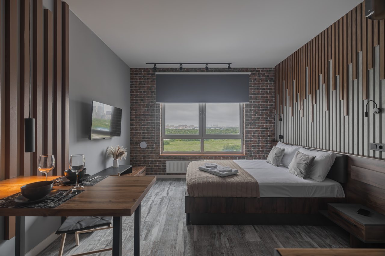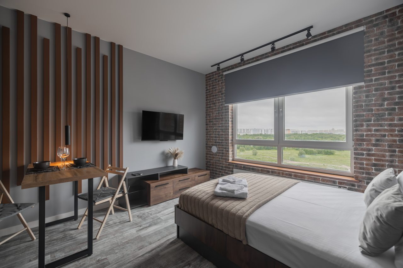 Для гостей города предлагаются на выбор несколько квартир с дизайнерским ремонтом, в которых есть всё необходимое для проживания: двуспальная кровать, кондиционер, гладильные принадлежности, телевизор, набор постельного белья. Санузел оснащён сантехникой, стиральной машиной, феном, косметическими принадлежностями.